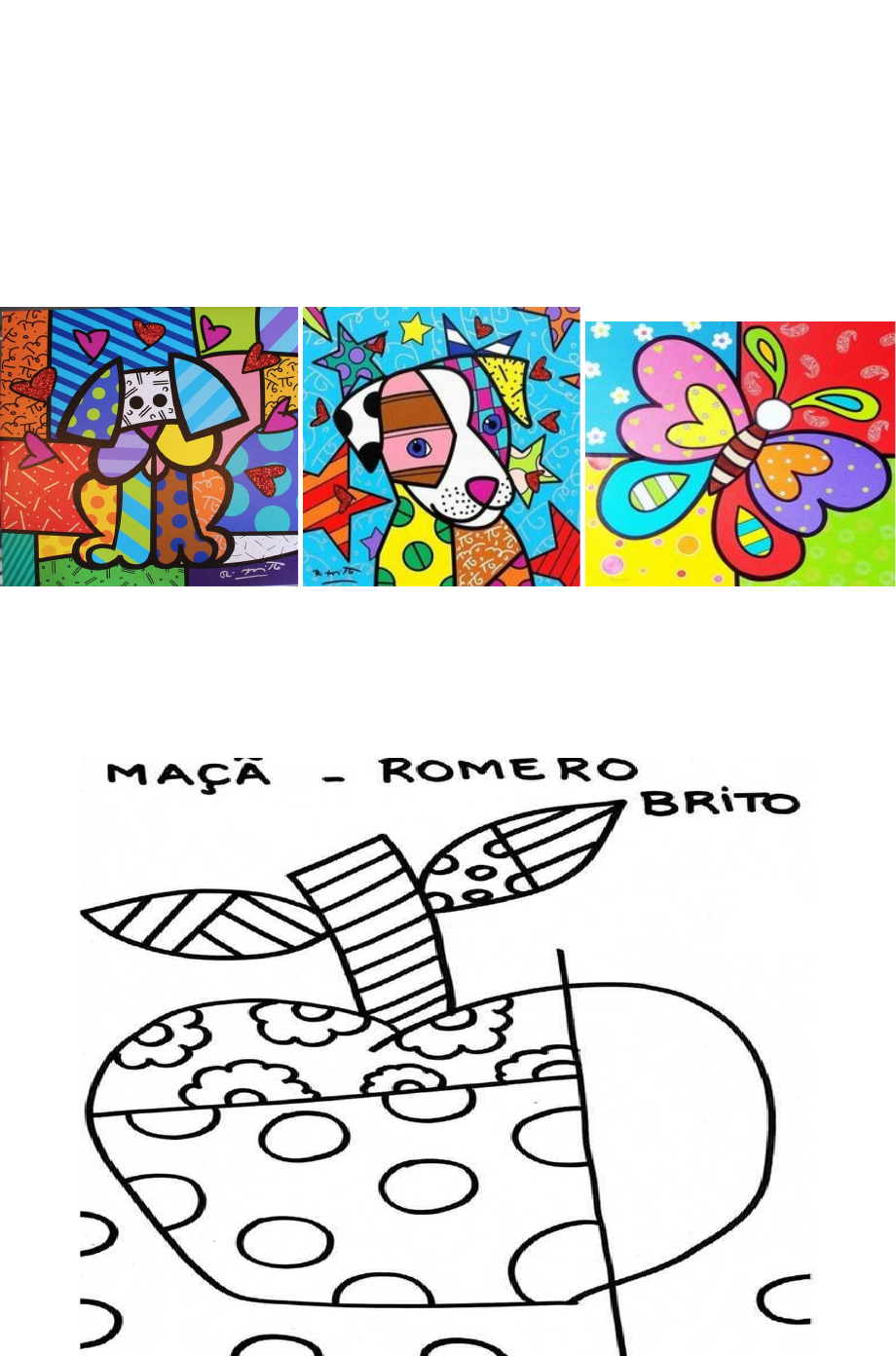 ROMERO BRITTO ROMERO BRITTO NASCEU NO RECIFE, PERNAMBUCO, EM 6 DE OUTUBRO DE 1963, AOS 8 ANOS DE IDADE COMEÇOU A MOSTRAR INTERESSE E TALENTO PELAS ARTES. COM MUITA IMAGINAÇÃO E CRIATIVIDADE, PINTAVA EM SUCATAS, PAPELÃO E JORNAL. AOS 14 ANOS FEZ SUA PRIMEIRA EXIBIÇÃO PÚBLICA E VENDEU SEU PRIMEIRO QUADRO À ORGANIZAÇÃO DOS ESTADOS AMERICANOS. SUAS PINTURAS CONTAM COM CORES VIBRANTES E TRAÇOS BEM DEMARCADOS REMETENDO AOS VITRAIS. Atividade Vamos fazer de conta que somos o Romero Britto e colorir a obra abaixo com cores vibrantes.