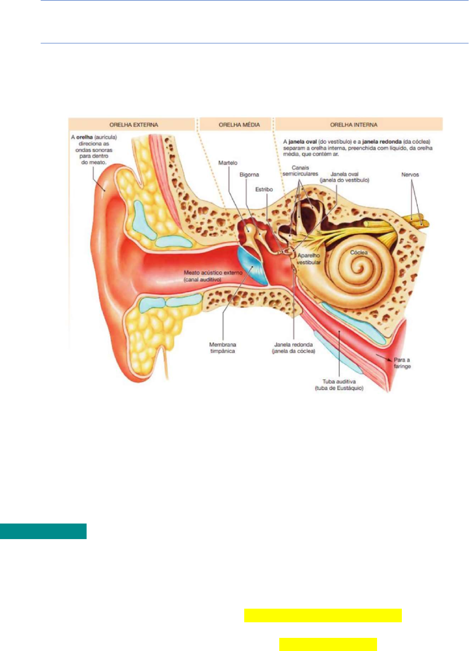 Apg 09 Morfologia do Aparelho Auditivo: A orelha é o órgão da audição e do equilíbrio; A audição é um sentido especial, e o órgão responsável pela audição é a orelha A orelha é dividida em orelha externa, orelha média e interna; A orelha externa e média irá transferir o som para a interna (contém o órgão do equilíbrio e da audição), e estão separadas pela membrana timpânica; A orelha media conecta-se à nasofaringe pela tuba auditiva Orelha Externa: É formada pelo pavilhão auditivo (capta o som) e pelo meato acústico externo (conduz o som); Pavilhão acústico: lâmina de cartilagem elástica coberta por pele fina; O meato acústico: vai da orelha até o tímpano, perto da orelha suas paredes são feitas de cartilagem elástica e o resto é um túnel que passa pelo osso temporal. o Revestimento: pele contendo pelos e glândulas sebáceas e ceruminosas = produzem cerume – cera do ouvido que aspira o pó e repele os insetos; o As ondas sonoras passam por ele e atinges a membrana timpânica (tímpano), que é uma fina e transparente camada entre a orelha externa e a orelha média. A medida que as ondas passam, fazem ela virar, e ela transfere as vibrações para os minúsculos ossos (ossículos) na orelha media. o Orelha Média: Câmara estreita e cheia de ar na parte petrosa do osso temporal; Unida à nasofaringe pela tuba auditiva; Composta pelos ossículos da audição, pelos músculos estapédio e tensor do tímpano e por nervos; Tuba auditiva: Une a cavidade timpânica à parte nasal da faringe, onde se abre posteriormente ao meato nasal inferior; A função da tuba auditiva é igualar a pressão na orelha média à pressão atmosférica, permitindo, assim, o livre movimento da membrana timpânica. Ela conecta a orelha media a nasofaringe, permitindo a passagem de ar entre a orelha media e a nasofaringe, isso é importante para igualar a pressão entre o meio externo e o interior da orelha. Ossículos da audição: transmitem as vibrações do tímpano através da cavidade para um fluido na orelha interna. Eles amplificam a pressão das vibrações sonoras em aproximadamente 20 vezes. Sem eles as pessoas só conseguiriam ouvir sons altos. São os primeiros ossos a se ossificarem por completo durante o desenvolvimento embrionário; Martelo: Fixo à membrana timpânica/Cabeça (bigorna), colo e cabo (tímpano); Bigorna: Está localizada entre o martelo e o estribo e articula-se com eles – COMUNICAÇÃO entre os dois; Estribo: menor ossículo / sua base encaixa-se na janela do vestíbulo (JANELA OVAL) Há dois músculos esqueléticos: musculo tensor tímpano (martelo) e musculo estapédio ( estribo) → são importantes quando ouvimos sons altos, pois eles se contraem para limitar a vibração dos ossículos, evitando danos. Tensor do tímpano: tensiona a membrana e reduz a amplitude de suas oscilações (evitar lesões); Estapédio: traciona o estribo, também impedindo um movimento excessivo. Orelha interna – Contém o órgão vestibulococlear (recepção do som e manutenção do equilíbrio); Formada por sacos e ductos do labirinto membranáceo; O labirinto membranáceo,contem endolinfa (composição igual ao liquido intra-celular; + potássio e – sódio) labirinto ósseo contém perilinfa ( composição: + sódio e – potássio) Esses líquidos participam da estimulação dos órgãos de equilíbrio e audição, respectivamente. Contém duas divisões: LABIRINTO OSSEO: - Cavidade – sistema de canais tortuosos que possuem 3 partes (cóclea, vestíbulo e canais semicirculares); é preenchido com a perilinfa (liquido) Cóclea: estrutura responsável pela audição Parte em forma de concha, contém o ducto coclear; Associada à audição; A grande volta basal da cóclea produz o promontório da parede labiríntica da cavidade timpânica; Contém o Orgão de Corti – células receptoras / sítio de transdução auditiva. Vestíbulo: Pequena câmara oval (cerca de 5 cm de comprimento) que contém o utrículo e o sáculo e o labirinto vestibular; Apresenta a janela do vestíbulo em sua parede lateral; Canais semicirculares: Os canais têm apenas cinco aberturas para o vestíbulo porque os canais anteriores e posteriores têm um pilar comum a ambos. Alojados nos canais estão os ductos semicirculares LABIRINTO MEMBRANÁCEO: Formado por uma série de sacos e ductos comunicantes que estão suspensos no labirinto ósseo; Contém endolinfa, um líquido aquoso cuja composição é semelhante à do líquido intracelular, assim diferindo em composição da perilinfa adjacente (que é semelhante ao líquido extracelular) que preenche o restante do labirinto ósseo; O labirinto membranoso é composto por série de ductos, denominados rampa vestibular, rampa timpânica e rampa média; O líquido encontrado nas rampas vestibular e timpânica, é a perilinfa. O líquido presente na rampa média é a endolinfa. MEATO ACÚSTICO INTERNO: Através desse plano seguem o nervo facial (NC VII), o nervo vestibulococlear (NC VIII) e suas divisões, além dos vasos sanguíneos; O nervo vestibulococlear divide-se perto da extremidade lateral do meato acústico interno em duas partes: um nervo coclear e um nervo vestibular Fisiologia da audição: A audição, o sentido do ouvir, envolve a transdução de ondas sonoras em energia elétrica, que é, então, transmitida ao sistema nervoso; A orelha humana é sensível a sons de tons com frequências entre 20 e 20.000 Hz TRANSDUÇÃO AUDITIVA: Transformação da pressão sonora em energia elétrica; A orelha externa transmite as ondas sonoras para o canal auditivo, que as transmite para a membrana timpânica. Quando as ondas sonoras movimentam a membrana timpânica, a cadeia de ossículos também se move, empurrando a plataforma do estribo em direção à janela oval e deslocando o fluido no interior da orelha interna; CÓCLEA E ÓRGÃO DE CORTI: O Órgão de Corti é o aparato de transdução sensorial; As células ciliadas aud