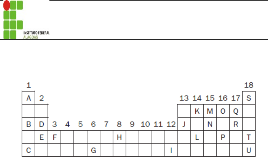 Instituto Federal de Educação, Ciência e Tecnologia de Alagoas Campus Maceió Química / 1° ano ______ Nome: ________________________________________________ Atividades A representação a seguir corresponde à parte superior da tabela periódica, na qual as letras não correspondem aos verdadeiros símbolos dos elementos. Com base na tabela, responda às questões: 1 - Identifique o metal alcalino de maior número atômico. 2 - Indique o elemento de transição de menor número atômico. 3 - Qual elemento apresenta propriedades químicas semelhantes ao elemento D? 4 - Identifique o metal alcalino de menor número atômico. 5 - Indique o elemento de transição de maior número atômico. 6 - Qual elemento apresenta propriedades químicas semelhantes ao elemento U? 7 - Indique o calcogênio de maior número atômico. 8 - Qual elemento apresenta a configuração 2s2 2p3 na camada de valência?