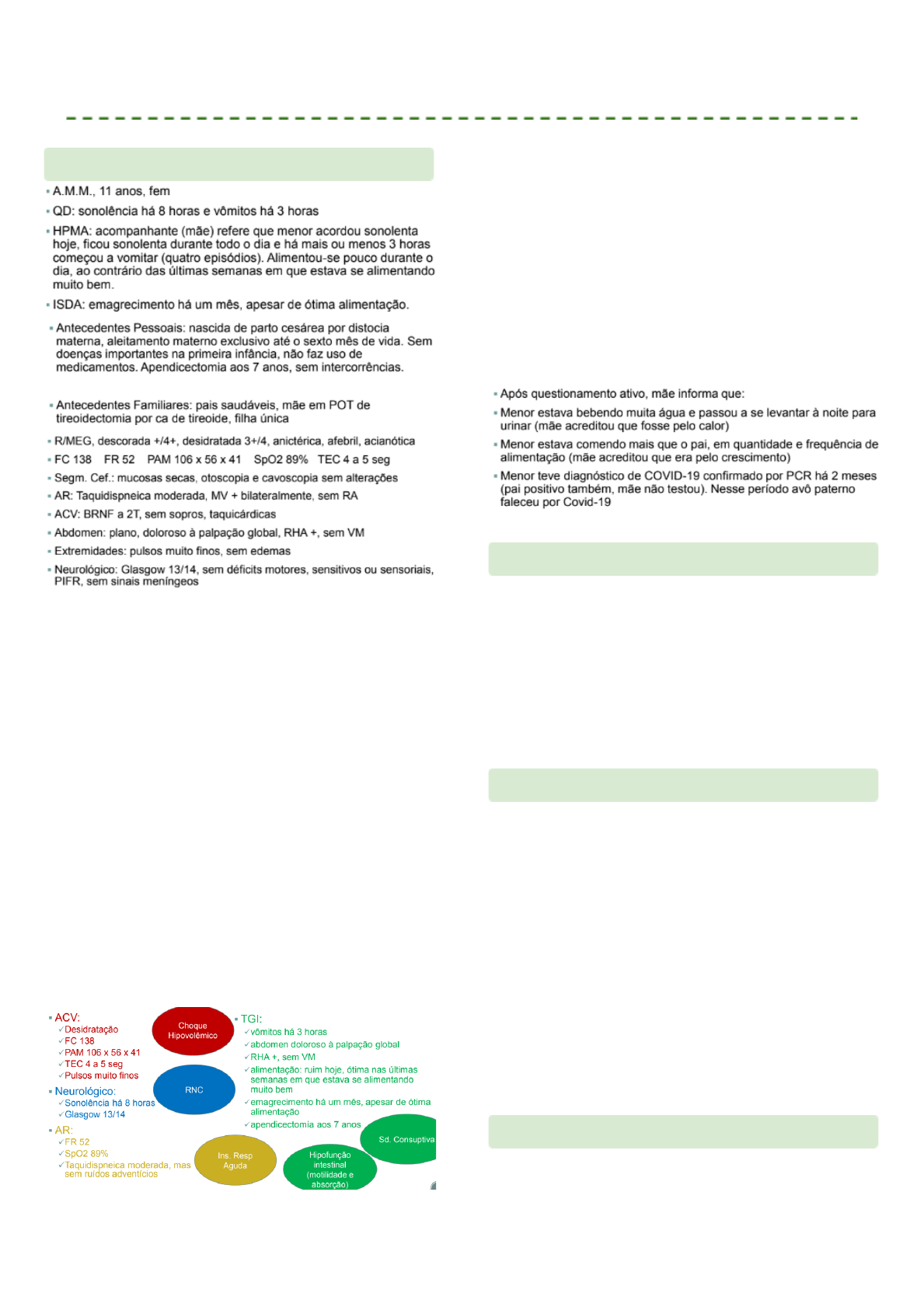 Cetoacidose Diabética Caso Clínico -Diagnóstico Sintomático: ➔ Sonolência há 8 horas e vômitos há 3 horas. ➔ Alimentação: ruim hoje, mas antes estava se alimentando muito bem ➔ Emagrecimento há um mês ➔ Apendicectomia aos 7 anos ➔ R/MEG FC 138 FR 52 PAM 106 x 56 x 41 SpO2 89% TEC 4 a 5 seg ➔ Desidratação ➔ Taquidispneia moderada, mas sem ruídos adventícios ➔ Abdome doloroso à palpação global, RHA +, sem VM ➔ Pulsos muito finos ➔ Glasgow 13/14 -Diagnóstico Sindrômico: ➔ Choque hipovolêmico ➔ Rebaixamento de nível de consciência ➔ Insuficiência Respiratória Aguda ➔ Hipofunção intestinal (absortiva e motilidade) ➔ Síndrome Consumptiva Choque hipovolêmico + Síndrome Consumptiva na Infância = DIABETES MELLITUS TIPO 1 Introdução ➔ Doença endócrina mais comum na infância. ➔ Acomete mundialmente cerca de 65.000 crianças menores de 15 anos por ano. ➔ Urgência endócrino-metabólica mais comum nessa faixa etária. ➔ Principal causa de hospitalização e óbito de pacientes diabéticos na infância. Epidemiologia ➔ A incidência de CAD como abertura do quadro de diabetes varia geograficamente. ➔ A prevalência de CAD diminui significativamente com o aumento da idade. ➔ É frequente o diagnóstico de DM1 já num estágio avançado, com CAD grave. ➔ O edema cerebral é a principal consequência que leva à mortalidade → Em algumas coortes, aumento da mortalidade foi associado à menor pressão parcial sanguínea de CO2 (pCO2), níveis mais elevados de ureia e ao uso de bicarbonato durante o tratamento da CAD. Fisiopatogenia ➔ Hemograma, hemocultura, PCR, Na e K, U e Cr, urina 1 e urocultura, glicemia dextro. ➔ Solicitar gasometria arterial ou venosa, caso não seja possível colher a arterial. Definição ➔ Hiperglicemia > 200 mg/dl ➔ pH venoso < 7,3 e/ou bicarbonato < 15 mmol/l ➔ Cetonemia e cetonúria -Gravidade: ➔ Leve: pH menor de 7,2 a 7,3 e/ou bicarbonato de 10 a 15 mmol/l ➔ Moderada: pH de 7,1 a 7,2, e/ou bicarbonato de 5 a 10 mmol/l ➔ Grave: pH menor que 7,1, e/ou bicarbonato menor que 5 mmol/l Diagnóstico -Paciente Sem Diagnóstico de DM1: ➔ História de polis (poliúria, polidipsia, polifagia e perda de peso). ➔ História pessoal ou familiar de autoimunidade. ➔ Presença de acantose nigricans. ➔ Obesidade. ➔ Sinais e sintomas de intercorrência infecciosa. -Paciente Previamente Diabético: ➔ Investigar infecções intercorrentes. ➔ Investigar omissão de doses de insulina. ➔ Falha no ajuste de doses durante intercorrências infecciosas. ➔ Controle glicêmico anterior. ➔ Eventos prévios de CAD. -Exame Físico: ➔ Pesar o paciente sempre que possível. ➔ Avaliar o nível de consciência periodicamente. ➔ Frequência e ritmo da respiração. ➔ Grau de desidratação. ➔ Presença de sinais de infecção. ➔ Palpação cuidadosa do abdome se houver queixa de dor abdominal. ➔ Detecção precoce de edema cerebral. -Diagnóstico Laboratorial: ➔ Calcular osmolaridade plasmática (Osm) efetiva ➔ Normalmente está aumentada na CAD, entre 300 a 350 mOsm/l Diagnóstico Diferencial Tratamento -Pilares do Tratamento: 1) Reposição de fluidos: melhora a captação de glicose na periferia e a filtração glomerular. 2) Reposição de insulina: reverte a proteólise, a lipólise e a cetogênese e estimula a captação e metabolização da glicose pelos tecidos. 3) Correção da acidose: consequência dos passos 1 e 2. 4) Correção dos distúrbios hidroeletrolíticos. -1ª Fase - Reposição Volêmica: ➔ O déficit de fluidos extracelulares é de difícil estimativa: ◆ CAD moderada: déficit de líquidos de 5 a 7% ◆ CAD grave: déficit de 8-10% do peso corporal. ◆ Aumento da ureia e do hematócrito são indicadores do grau de depleção do líquido extracelular. ➔ Pacientes sem choque: soro fisiológico (SF) a 0,9% intravenoso 10 a 20 ml/kg em uma a duas horas (pode ser repetido até melhora da perfusão tissular). ➔ Pacientes com choque: SF 0,9% 20 ml/kg em bolus, visando restaurar o volume circulatório (repetir até 3x). ➔ Reavaliar o paciente após cada etapa; ➔ Uso de soluções cristaloides. -2ª Fase - Insulinização: ➔ A insulinização deve ser feita com infusão contínua venosa de insulina regular, na dose de 0,1 unidade/kg/hora. ➔ Deve-se saturar o equipo com 50 ml da solução, desprezando esse volume e repetindo o procedimento a cada troca de solução, o que deve ocorrer a cada seis horas. ➔ Solução preparada com 25 unidades de insulina regular mais 250 ml de SF 0,9% (0,1 unidade de insulina por ml de solução). ➔ Com essa solução, a dose de 0,1 unidade/kg/h de insulina corresponde a 1 ml/kg/h de solução. ➔ Ou seja, basta colocar o peso da criança na velocidade da bomba infusora (por exemplo, um paciente de 20 kg receberá essa solução em infusão a 20 ml/h). ➔ A infusão contínua deve ser mantida até resolução da CAD (pH > 7,3 e bicarbonato > 15 nmol/l), o que sempre vai ocorrer após a normalização da glicemia. ➔ Durante a infusão contínua de insulina, espera-se que a glicose caia cerca de 40 a 90 mg/dl por hora. ➔ Caso haja uma queda da glicemia maior que 90 mg/ dl/h, glicose pode ser acrescentada na hidratação venosa. ➔ Sempre acrescentar glicose na solução venosa com glicemia menor que 300 mg/dl. -3 e 4ª Fases: ➔ Correção da acidose e correção dos distúrbios hidroeletrolíticos. Exames