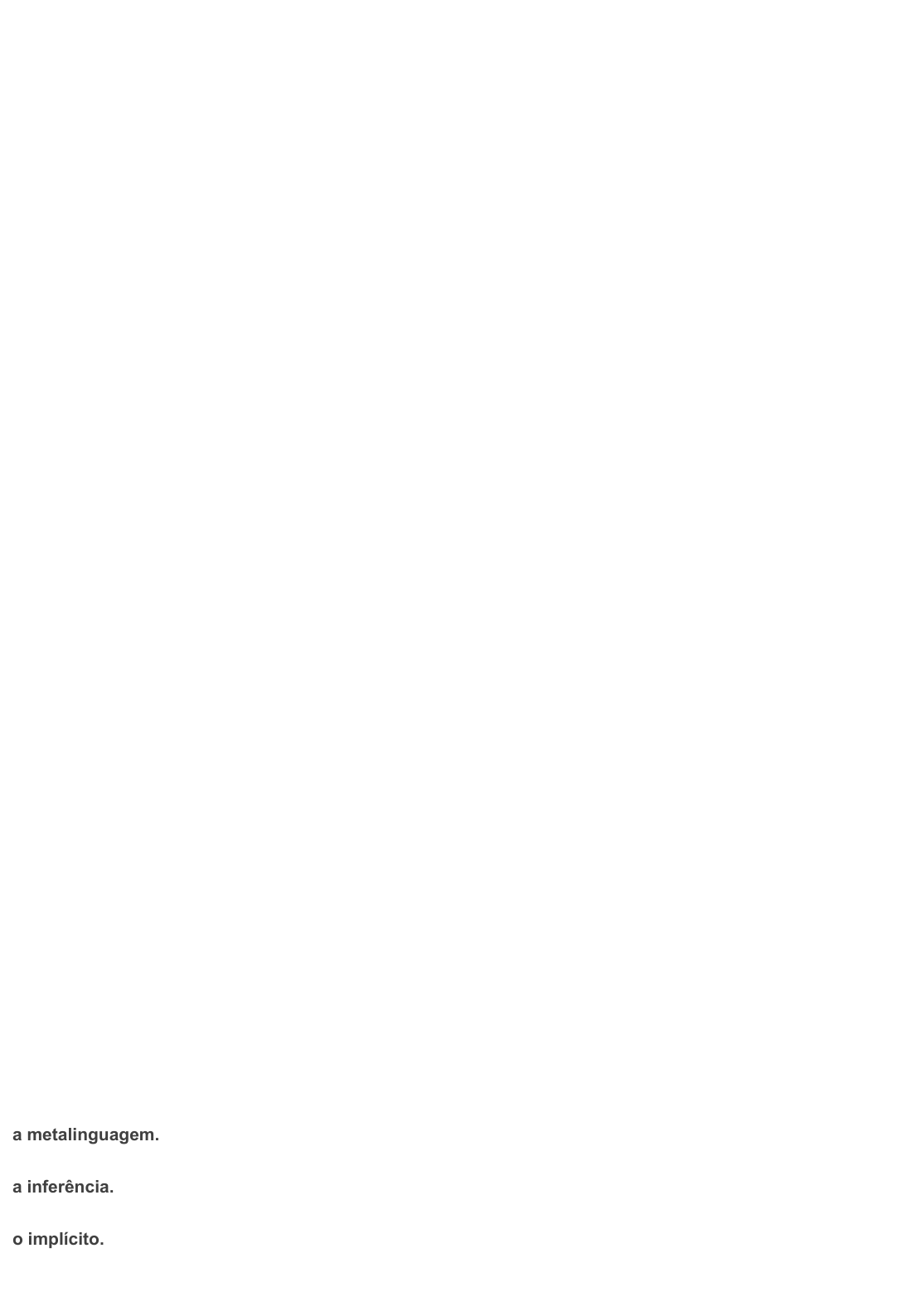 10/04/2023, 09:28 Comentários https://sereduc.blackboard.com/ultra/courses/_165165_1/grades/assessment/_7886215_1/overview/attempt/_25457619_1/review/inline-feedba… 1/10 Ocultar opções de resposta Pergunta 1 1 / 1 Diante dos textos com os quais temos contato em nosso cotidiano, muitas vezes precisamos contar com o repertório que adquirimos com as experiências vividas, ou seja, precisamos contar com as informações que acumulamos durante a vida, para que possamos compreender as mensagens emitidas por nossos interlocutores. Isso ocorre porque há informações que não estão explícitas, ou que não são evidentes, e ter esse repertório ajuda a completar as mensagens veiculadas e informações trazidas pelos enunciados. A seguir, leia os textos I e II. Texto I Meus oito anos Oh! que saudades que tenho Da aurora da minha vida, Da minha infância querida Que os anos não trazem mais! Que amor, que sonhos, que flores, Naquelas tardes fagueiras À sombra das bananeiras, Debaixo dos laranjais! [...] Fonte: ABREU, Casimiro de. In: MOISÉS, Massaud. A literatura brasileira através dos textos. 5ª ed. São Paulo: Cultrix, 1977. P. 161 (Fragmento). Texto II Meus oito anos Oh que saudades que eu tenho Da aurora de minha vida Das horas De minha infância Que os anos não trazem mais Naquele quintal de terra! Da rua de Santo Antônio Debaixo da bananeira Sem nenhum laranjais [...] Fonte: ANDRADE, Oswald de. Primeiro caderno do aluno de poesia Oswald de Andrade. São Paulo: Globo, 1991. p. 28. A partir das informações apresentadas, da análise dos textos e dos estudos realizados sobre procedimentos de leitura, é correto afirmar que o procedimento explorado no texto II foi: a metalinguagem. a inferência. o implícito. Resposta corretaa intertextualidade. 10/04/2023, 09:28 Comentários https://sereduc.blackboard.com/ultra/courses/_165165_1/grades/assessment/_7886215_1/overview/attempt/_25457619_1/review/inline-feedba… 2/10 Ocultar opções de resposta a comparação. Pergunta 2 1 / 1 Em um verbete de dicionário Michaelis, buscando um conceito sobre “linguagem”, encontramos a seguinte informação: “linguagem – fala; conjunto de sinais falados, escritos ou gesticulados de que se serve o homem para exprimir suas ideias e sentimentos”. Fonte: MICHAELIS: dicionário escolar língua portuguesa. São Paulo: Editora Melhoramentos, 2008. – (Dicionários Michaelis), p. 523. Considerando as informações apresentadas no verbete e os estudos realizados sobre a linguagem e suas características, analise as afirmativas a seguir. I. A comunicação é a base da linguagem. II. A transmissão de conhecimentos e o funcionamento dos grupos sociais depende da linguagem. III. A ausência de padronização na linguagem permite a transmissão de cultura entre os integrantes de um mesmo grupo social. IV. A utilização de símbolos aceitos por convenção permite a expressão de emoções e desejos. Está correto o que se afirma em: Resposta corretaII e IV. I e IV. II e III. I e II. III e IV. Pergunta 3 1 / 1 10/04/2023, 09:28 Comentários https://sereduc.blackboard.com/ultra/courses/_165165_1/grades/assessment/_7886215_1/overview/attempt/_25457619_1/review/inline-feedba… 3/10 Ocultar opções de resposta Segundo o dicionário Houaiss, “comunicar” significa passar informação, ordem, mensagem etc, [a alguém]; transmitir [...] para; possibilitar a ida de um lugar a outro; ligar-se; transmitir por contágio; manter boas relações; entender-se [...]. Fonte: HOUAISS, Antônio; VILLAR, Mauro de Salles & FRANCO, Francisco Manoel de Mello. Dicionário da língua portuguesa. Rio de Janeiro: Objetiva, 2004. A partir dessas informações, e considerando os conteúdos estudados sobre comunicação, analise as afirmativas a seguir: I. A necessidade de propagar mensagens passa a fazer parte do ser humano a partir do início de seu desenvolvimento escolar, nas séries iniciais. II. No início da vida, o ser humano pouco tem a comunicar. Suas formas de comunicação são incompreensíveis, pois ele precisa adquirir a comunicação verbal. III. A comunicação permite ao ser humano a manifestação e a materialização de seus interesses e desejos. IV. A interação em sociedade é um dos objetivos do ato comunicativo. Agora, assinale a alternativa que apresenta a sequência correta: F, V, F, V. V, F, V, F. V, V, F, F. Resposta corretaF, F, V, V. F, V, V, V. Pergunta 4 1 / 1 Leia o trecho a seguir: “A função da cultura é tornar a vida segura e contínua para a sociedade humana. Ela é o ‘cimento’ que dá unidade a um certo grupo de pessoas que divide os mesmos usos, os mesmos costumes.” Fonte: ARANHA, Maria Lúcia de Arruda; MARTINS, Maria Helena Pires. Temas de Filosofia. São Paulo. Moderna. 2005, p. 21. Considerando essas informações e o conteúdo estudado sobre a importância da comunicação para o ser humano, analise as afirmativas a seguir. I. A comunicação permite que o ser humano consiga atuar em diversos grupos sociais, mantendo influência recíproca, em um processo constante. II. O enriquecimento cultural dá-se com a ocorrência de uma forma de linguagem predominando sobre outras, o que facilita a unidade entre pessoas pertencentes a um mesmo grupo social. III. O desenvolvimento cultural de um certo grupo de pessoas, ou entre grupos, pode ser compartilhado pelo uso de diferentes formas de linguagem. 10/04/2023, 09:28 Comentários https://sereduc.blackboard.com/ultra/courses/_165165_1/grades/assessment/_7886215_1/overview/attempt/_25457619_1/review/inline-feedba… 4/10 Ocultar opções de resposta Ocultar opções de resposta IV. O uso da linguagem garante eficiência em processos de comunicação e, consequentemente, enriquecimento cultural. Está correto apenas o que se afirma em: II e III. III e IV. I e II. Resposta corretaI e III. I e IV. Pergunta 5 1 / 1 Conforme ABAURRE e ABAURRE (2009), a compreensão do sentido do texto, por vezes, necessita da recuperação de algo, d