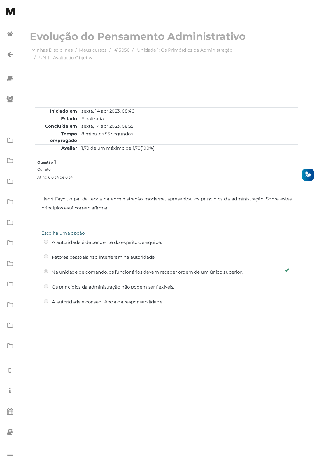 14/04/2023, 08:53 UN 1 - Avaliação Objetiva: Revisão da tentativa https://avap.multivix.edu.br/mod/quiz/review.php?attempt=2733231&cmid=1312394 1/4 Minhas Disciplinas / Meus cursos / 413056 / Unidade 1: Os Primórdios da Administração / UN 1 - Avaliação Objetiva Evolução do Pensamento Administrativo Iniciado em sexta, 14 abr 2023, 08:46 Estado Finalizada Concluída em sexta, 14 abr 2023, 08:55 Tempo empregado 8 minutos 55 segundos Avaliar 1,70 de um máximo de 1,70(100%) Questão 1 Correto Atingiu 0,34 de 0,34 Henri Fayol, o pai da teoria da administração moderna, apresentou os princípios da administração. Sobre estes princípios está correto a�rmar: Escolha uma opção: A autoridade é dependente do espírito de equipe. Fatores pessoais não interferem na autoridade. Na unidade de comando, os funcionários devem receber ordem de um único superior. Os princípios da administração não podem ser �exíveis. A autoridade é consequência da responsabilidade. https://avap.multivix.edu.br/my/ https://avap.multivix.edu.br/course/view.php?id=20060 https://avap.multivix.edu.br/course/view.php?id=20060§ion=2 https://avap.multivix.edu.br/mod/quiz/view.php?id=1312394 https://avap.multivix.edu.br/my/ https://avap.multivix.edu.br/course/view.php?id=20060 https://avap.multivix.edu.br/user/index.php?id=20060 https://avap.multivix.edu.br/course/view.php?id=20060§ion=1 https://avap.multivix.edu.br/course/view.php?id=20060§ion=2 https://avap.multivix.edu.br/course/view.php?id=20060§ion=3 https://avap.multivix.edu.br/course/view.php?id=20060§ion=4 https://avap.multivix.edu.br/course/view.php?id=20060§ion=5 https://avap.multivix.edu.br/course/view.php?id=20060§ion=6 https://avap.multivix.edu.br/course/view.php?id=20060§ion=7 https://avap.multivix.edu.br/course/view.php?id=20060§ion=8 https://avap.multivix.edu.br/course/view.php?id=20060§ion=9 https://avap.multivix.edu.br/course/view.php?id=20060§ion=10 https://avap.multivix.edu.br/course/view.php?id=20060§ion=11 https://avap.multivix.edu.br/hooks/portal/ https://avap.multivix.edu.br/mod/page/view.php?id=1252%2F%22%20target%3D%22_blank https://avap.multivix.edu.br/calendar/view.php/ https://avap.multivix.edu.br/local/staticpage/view.php?page=biblioteca https://portalweb.multivix.edu.br/gabaritos/login.aspx https://avap.multivix.edu.br/ https://avap.multivix.edu.br/ 14/04/2023, 08:53 UN 1 - Avaliação Objetiva: Revisão da tentativa https://avap.multivix.edu.br/mod/quiz/review.php?attempt=2733231&cmid=1312394 2/4 Questão 2 Correto Atingiu 0,34 de 0,34 O estudo das principais Teorias da Administração revela um conjunto de conhecimentos a respeito das organizações e do processo de sua administração, constituído por princípios, proposições e técnicas, que estão em permanente processo de transformação com a evolução da economia e o ambiente das organizações. Nesse contexto, as Teorias de Administração podem ser estudadas considerando várias correntes ou formas de abordagem. Assinale a alternativa correta. Escolha uma opção: Henry Ford observou que o homem é um animal complexo dotado de necessidades. Assim que uma necessidade é satisfeita, logo surge outra em seu lugar, dentro de um processo contínuo que não tem �m. São as necessidades que motivam o comportamento humano dando-lhe direção e conteúdo. Essa é a pedra angular da Teoria Contingencial. A Teoria Clássica de Fayol preconiza que a autoridade é o direito de dar ordens e o poder de esperar a obediência. A responsabilidade é uma consequência natural da autoridade e signi�ca o dever de prestar contas. O comportamento dos trabalhadores está condicionado a normas e padrões sociais. Tal observação está ligada à abordagem estruturalista da Administração. A especialização das tarefas e das pessoas contribui para aumentar a e�ciência. Esse princípio está ligado à Abordagem Sistêmica da Administração. O princípio da disciplina, conforme Fayol, consiste na observação de que a rotatividade do pessoal é prejudicial para a e�ciência da organização. https://avap.multivix.edu.br/my/ https://avap.multivix.edu.br/course/view.php?id=20060 https://avap.multivix.edu.br/user/index.php?id=20060 https://avap.multivix.edu.br/course/view.php?id=20060§ion=1 https://avap.multivix.edu.br/course/view.php?id=20060§ion=2 https://avap.multivix.edu.br/course/view.php?id=20060§ion=3 https://avap.multivix.edu.br/course/view.php?id=20060§ion=4 https://avap.multivix.edu.br/course/view.php?id=20060§ion=5 https://avap.multivix.edu.br/course/view.php?id=20060§ion=6 https://avap.multivix.edu.br/course/view.php?id=20060§ion=7 https://avap.multivix.edu.br/course/view.php?id=20060§ion=8 https://avap.multivix.edu.br/course/view.php?id=20060§ion=9 https://avap.multivix.edu.br/course/view.php?id=20060§ion=10 https://avap.multivix.edu.br/course/view.php?id=20060§ion=11 https://avap.multivix.edu.br/hooks/portal/ https://avap.multivix.edu.br/mod/page/view.php?id=1252%2F%22%20target%3D%22_blank https://avap.multivix.edu.br/calendar/view.php/ https://avap.multivix.edu.br/local/staticpage/view.php?page=biblioteca https://portalweb.multivix.edu.br/gabaritos/login.aspx https://avap.multivix.edu.br/ 14/04/2023, 08:53 UN 1 - Avaliação Objetiva: Revisão da tentativa https://avap.multivix.edu.br/mod/quiz/review.php?attempt=2733231&cmid=1312394 3/4 Questão 3 Correto Atingiu 0,34 de 0,34 Questão 4 Correto Atingiu 0,34 de 0,34 A evolução do pensamento administrativo, iniciado com Taylor e sua “Administração Cientí�ca”, passou por diversas teorias com focos distintos. Uma teoria iniciava-se pelos pontos críticos de sua antecessora, buscando-se alternativas para esses elementos. De acordo com esse preceito, analise as duas a�rmativas abaixo e depois indique a alternativa CORRETA. I – Tanto a Escola Clássica da Administração quanto a Escola de Relações Humanas buscavam a maior produtividade dos funcionários, porém com abordagens d