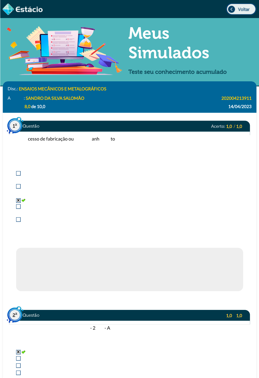 Meus Simulados Teste seu conhecimento acumulado Disc.: ENSAIOS MECÂNICOS E METALOGRÁFICOS Aluno(a): SANDRO DA SILVA SALOMÃO 202004213911 Acertos: 8,0 de 10,0 14/04/2023 Acerto: 1,0 / 1,0 O processo de fabricação ou o acompanhamento de peças mecânicas acabadas podem ser avaliados a partir dos diversos ensaios não destrutivos. A tomogra�a computadorizada é um exame com ampla utilização na medicina que há algum tempo seu princípio físico vem sendo aplicado para o exame não destrutivo de peças da engenharia. Em linhas gerais, o exame "reconstrói", a partir de imagem bidimensionais, uma imagem tridimensional da peça. Sobre esse ensaio qual a a�rmativa correta. Um efeito negativo é a superposição de defeitos que retira a qualidade da imagem em algumas pequenas regiões. Peças com espessuras grandes são as mais recomendadas para o exame de TC, pois a grande atenuação dos raios X pela matéria elevam a qualidade da imagem �nal. O ensaio de TC é amplamente aplicável a metais com baixa massa especí�ca. O tempo do ensaio depende da energia e intensidade dos raios X e da composição do material da amostra. Normalmente leva de 2 a 3 horas. A tomogra�a computadorizada requer um grande preparo da superfície da amostra a ser examinada a �m de que não ocorram interferências na qualidade da imagem. Respondido em 14/04/2023 15:50:10 Explicação: O ensaio de tomogra�a computadorizada utiliza a radiação dos raios X que atravessam a peça a ser ensaiada. Dessa forma, material menos densos absorverão menos a energia e, consequentemente, a imagem será de melhor qualidade. O ensaio de TC demanda pouco tempo de exposição da peça aos raios X e não apresenta o efeito de superposição de defeitos, típico do ensaio de raios X convencional. Em regra, não há exigências de preparação da amostra para o exame de TC. Acerto: 1,0 / 1,0 (BIO-RIO - Ensaios Não Destrutivos - 2014 - Adaptado). A inspeção de peças com eventuais descontinuidades super�ciais e/ou subsuper�ciais, por meio do ensaio com partículas magnéticas, é relativamente simples e rápida. Observando as técnicas de inspeção por partículas magnéticas veri�ca-se que na técnica de eletrodos: O campo magnético é circular e as linhas de campo circulam através da peça. O campo magnético apresenta a mesma direção de uma bobina indutora. As descontinuidades identi�cáveis estão perpendiculares à posição deles. O campo magnético é longitudinal e as linhas de campo penetram na peça. Questão1 a Questão2 a https://simulado.estacio.br/alunos/inicio.asp javascript:voltar(); Identi�ca-se qualquer tipo de descontinuidade que a�ore à superfície. Respondido em 14/04/2023 13:47:59 Explicação: Na técnica por eletrodos, em linhas gerais, dois eletrodos são diretamente apoiados sobre a superfície da peça �uindo uma corrente elétrica pela peça. Dessa forma, há a formação de um campo magnético em que as linhas de indução são circulares. Acerto: 1,0 / 1,0 UFPA - Engenheiro - 2017 - Aadaptada). A inspeção de peças com eventuais descontinuidades super�ciais e/ou subsuper�ciais, por meio do ensaio com partículas magnéticas, é relativamente simples e rápida. O ensaio de metais pelo método das partículas magnéticas se caracteriza como: Não destrutivo, utilizado principalmente na detecção de defeitos internos. Não destrutivo, utilizado principalmente na detecção de defeitos super�ciais e alguns subsuper�ciais. Não destrutivo, utilizado principalmente na detecção de campos magnéticos prejudiciais às estruturas aeroespaciais. Não destrutivo, utilizado principalmente na determinação da intensidade de campos magnéticos devido às tensões residuais em peças laminadas, tre�ladas e soldadas. Não destrutivo, utilizado principalmente na detecção de defeitos imantados. Respondido em 14/04/2023 13:48:21 Explicação: Dentre os ensaios não destrutivos utilizados para a detecção de descontinuidades super�ciais, destaca-se o ensaio por partículas magnéticas em que um campo magnético magnetiza a peça (material ferromagnético) e as partículas se agrupam na descontinuidade, revelando-a. Também é adequado para algumas descontinuidades subsuper�ciais. Acerto: 1,0 / 1,0 (EBTT - IF - SUDESTE-MG - 2018 - Adaptada). Na engenharia os ensaios mecânicos tem como função fornecer informações para a determinação de parâmetros mecânicos úteis no dimensionamento de projetos, bem como para o controle de qualidade da produção. Neste contexto, é correto a�rmar que a propriedade mecânica que representa uma medida da capacidade de deformação plástica suportada até a fratura do material é: a resistência mecânica. o coe�ciente de Poisson. a ductilidade. a resiliência. a tenacidade. Respondido em 14/04/2023 15:50:16 Explicação: Os materiais podem ser classi�cados em duas grandes classes: os frágeis e os dúcteis. Essa separação é realizada a partir da propriedade mecânica denominada ductilidade que se relaciona com a deformação plástica até a ruptura. Pode ser quanti�cada pelo alongamento percentual do corpo de provas no ensaio de tração ou pela redução percentual da seção reta. A resiliência relaciona-se com a deformação elástica e a tenacidade com a energia absorvida pelo CP até a ruptura. Questão3 a Questão4 a Acerto: 1,0 / 1,0 (BIORIO CONCURSOS - NUCLEPE - 2014 - Adaptada). Na engenharia os ensaios mecânicos tem como função fornecer informações para a determinação de parâmetros mecânicos úteis no dimensionamento de projetos, bem como para o controle de qualidade da produção. Neste contexto, dentre as alternativas apresentadas abaixo, assinale aquela que indica uma característica dos ferros fundidos cinzentos: baixa resistência ao desgaste. proporcionalidade entre tensão e deformação. difícil moldagem. resistência à tração menor do que a resistência à compressão. baixíssima c