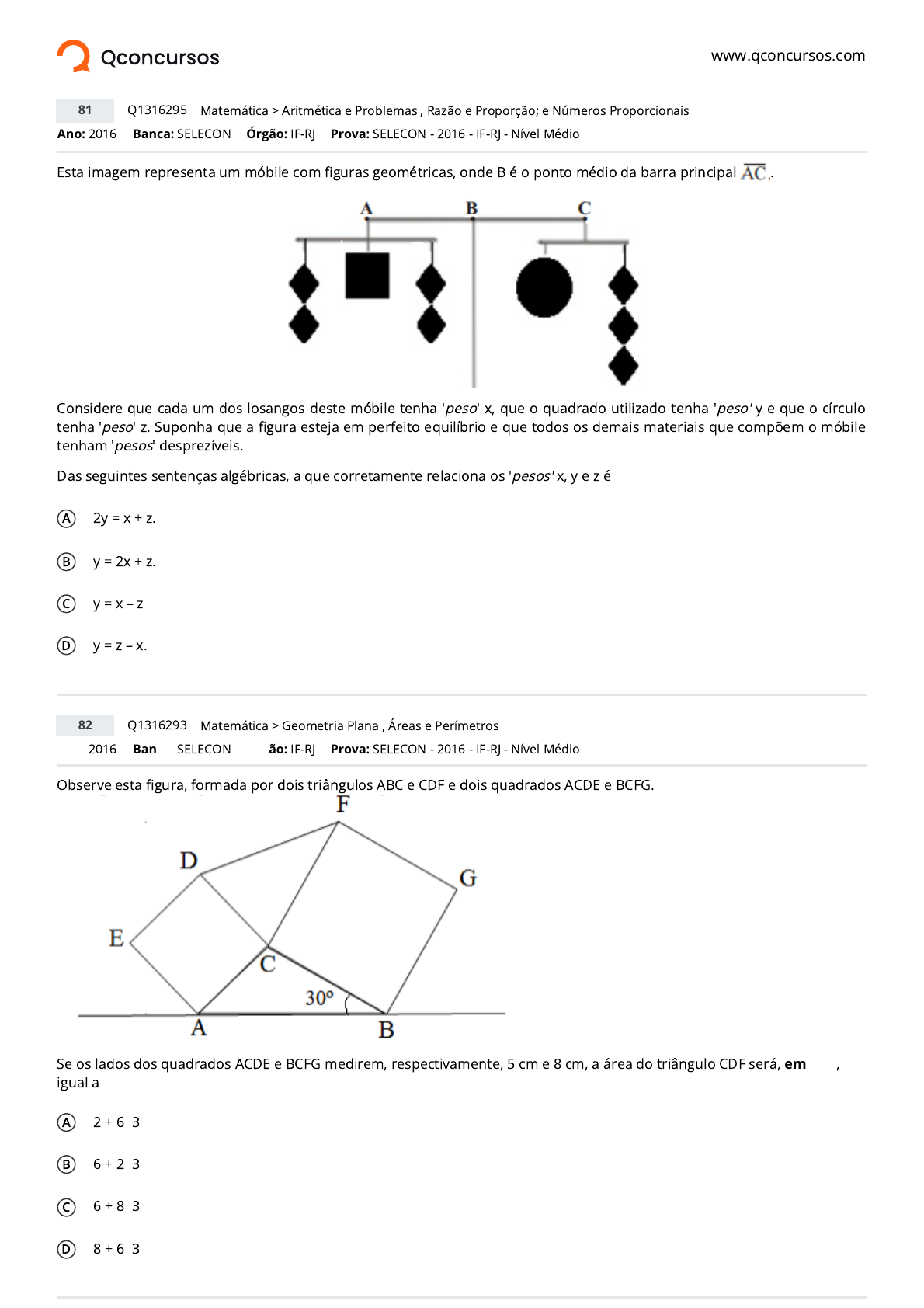 www.qconcursos.com Ano: 2016 Banca: SELECON Órgão: IF-RJ Esta imagem representa um móbile com �guras geométricas, onde B é o ponto médio da barra principal . Considere que cada um dos losangos deste móbile tenha 'peso' x, que o quadrado utilizado tenha 'peso' y e que o círculo tenha 'peso' z. Suponha que a �gura esteja em perfeito equilíbrio e que todos os demais materiais que compõem o móbile tenham 'pesos' desprezíveis. Das seguintes sentenças algébricas, a que corretamente relaciona os 'pesos' x, y e z é A 2y = x + z. B y = 2x + z. C y = x – z D y = z – x. Ano: 2016 Banca: SELECON Órgão: IF-RJ Observe esta �gura, formada por dois triângulos ABC e CDF e dois quadrados ACDE e BCFG. Se os lados dos quadrados ACDE e BCFG medirem, respectivamente, 5 cm e 8 cm, a área do triângulo CDF será, em cm², igual a A 2 + 6√3 B 6 + 2√3 C 6 + 8√3 D 8 + 6√3 81 Q1316295 >Matemática Aritmética e Problemas , Razão e Proporção; e Números Proporcionais Prova: SELECON - 2016 - IF-RJ - Nível Médio 82 Q1316293 >Matemática Geometria Plana , Áreas e Perímetros Prova: SELECON - 2016 - IF-RJ - Nível Médio https://www.qconcursos.com/ https://www.qconcursos.com/questoes-de-concursos/bancas/selecon https://www.qconcursos.com/questoes-de-concursos/institutos/if-rj https://www.qconcursos.com/questoes-de-concursos/bancas/selecon https://www.qconcursos.com/questoes-de-concursos/institutos/if-rj https://www.qconcursos.com/questoes-de-concursos/questoes/4a7dc1a2-cb https://www.qconcursos.com/questoes-de-concursos/disciplinas/matematica-matematica https://www.qconcursos.com/questoes-de-concursos/disciplinas/matematica-matematica/aritmetica-e-problemas https://www.qconcursos.com/questoes-de-concursos/disciplinas/matematica-matematica/razao-e-proporcao-e-numeros-proporcionais https://www.qconcursos.com/questoes-de-concursos/provas/selecon-2016-if-rj-nivel-medio https://www.qconcursos.com/questoes-de-concursos/questoes/4a77b257-cb https://www.qconcursos.com/questoes-de-concursos/disciplinas/matematica-matematica https://www.qconcursos.com/questoes-de-concursos/disciplinas/matematica-matematica/geometria-plana https://www.qconcursos.com/questoes-de-concursos/disciplinas/matematica-matematica/areas-e-perimetros https://www.qconcursos.com/questoes-de-concursos/provas/selecon-2016-if-rj-nivel-medio Ano: 2016 Banca: SELECON Órgão: IF-RJ A corrupção afeta muito o nosso país e, por conseguinte, a qualidade de vida da população. O Ministério Público de Goiás divulgou o número de procedimentos de Investigação Criminal, mês a mês, de janeiro de 2014 a fevereiro de 2015, conforme ilustra o seguinte grá�co: Disponível em: < http://www.mpgo.mp.br/portal/conteudo/dados-consolidados-2015 >. Acesso em: 21 out. 2016. Com base nessas informações, é correto a�rmar que a média aritmética de procedimentos mensais realizados pelo Ministério Público de Goiás no segundo semestre de 2014 foi, aproximadamente, de A 17,7 B 18,7. C 19,2. D 21,3. Ano: 2016 Banca: SELECON Órgão: IF-RJ A desonestidade na Escola Incon�dência Os amigos Joaquim e Silvério, alunos da Escola Incon�dência, decidiram montar uma banca para vender linha de pipa no Festival de Verão que aconteceria durante as férias escolares. Eles comprariam linha, diretamente dos fabricantes e revenderiam o produto a varejo na sua banca. Pelo acordo �rmado pelos sócios, Joaquim investiria diariamente R$ 36,00 e Silvério investiria, R$ 54,00 por dia. O lucro das vendas deveria ser repartido, ao �nal de cada dia, em partes proporcionais ao investimento de cada um. No primeiro dia, Joaquim, um moço muito correto, �cou encarregado de comprar o produto. Escolheu um fabricante de linha de boa qualidade e comprou um rolo com 120 metros por R$ 90,00. Naquele mesmo dia, na Escola Incon�dência, os sócios conseguiram vender toda a linha, aos pedaços, pelo preço de R$ 1,00 o metro. Feitas as contas, repartiram os lucros de acordo com o combinado. No segundo dia, Silvério, um rapaz trapaceiro, teve a tarefa de comprar e escolheu um produto de qualidade inferior. Comprou um rolo com 130 metros do produto pelo mesmo preço de R$ 90,00. Antes de voltar para a Escola Incon�dência, Silvério escondeu consigo 10 metros de linha e apresentou o restante ao seu sócio para venda na banca deles. Nesse dia, conseguiram vender todo o produto, aos pedaços, pelo mesmo preço de R$ 1,00 o metro. Feitas as contas, repartiram os lucros da venda de acordo com o combinado. Porém, em outro local de venda, e sem comunicar nada a Joaquim, Silvério vendeu os 10 metros, pelo preço de R$ 0,90 o metro. No terceiro dia, Joaquim foi comprar a linha para revenda. Lá, ao conversar com os comerciantes do dia anterior, descobriu que Silvério tinha comprado material a mais. Então, Joaquim decidiu não comprar nada e voltar à Escola Incon�dência, onde exigiu explicações de Silvério, que não pôde sustentar as suas mentiras. Por isso, os dois rapazes des�zeram a amizade e a sociedade. Para não ser punido pelo diretor da escola, Silvério teve que devolver a Joaquim, perante os colegas de turma, o correspondente a dois terços do que havia obtido na venda ilícita. Alinha comprada por Silvério foi relativamente mais barata que a linha comprada por Joaquim. Assim, a razão entre os preços de fábrica do metro da linha mais barata e da linha mais cara é igual a A 5/6. 83 Q1316292 >Matemática Estatística , Análise de Tabelas e Grá�cos Prova: SELECON - 2016 - IF-RJ - Nível Médio 84 Q1316291 >Matemática Aritmética e Problemas , Razão e Proporção; e Números Proporcionais Prova: SELECON - 2016 - IF-RJ - Nível Médio https://www.qconcursos.com/questoes-de-concursos/bancas/selecon https://www.qconcursos.com/questoes-de-concursos/institutos/if-rj https://www.qconcursos.com/questoes-de-concursos/bancas/selecon https://www.qconcursos.com/questoes-de-concursos/institutos/if-rj https://www.qconcursos.com/questoes-d