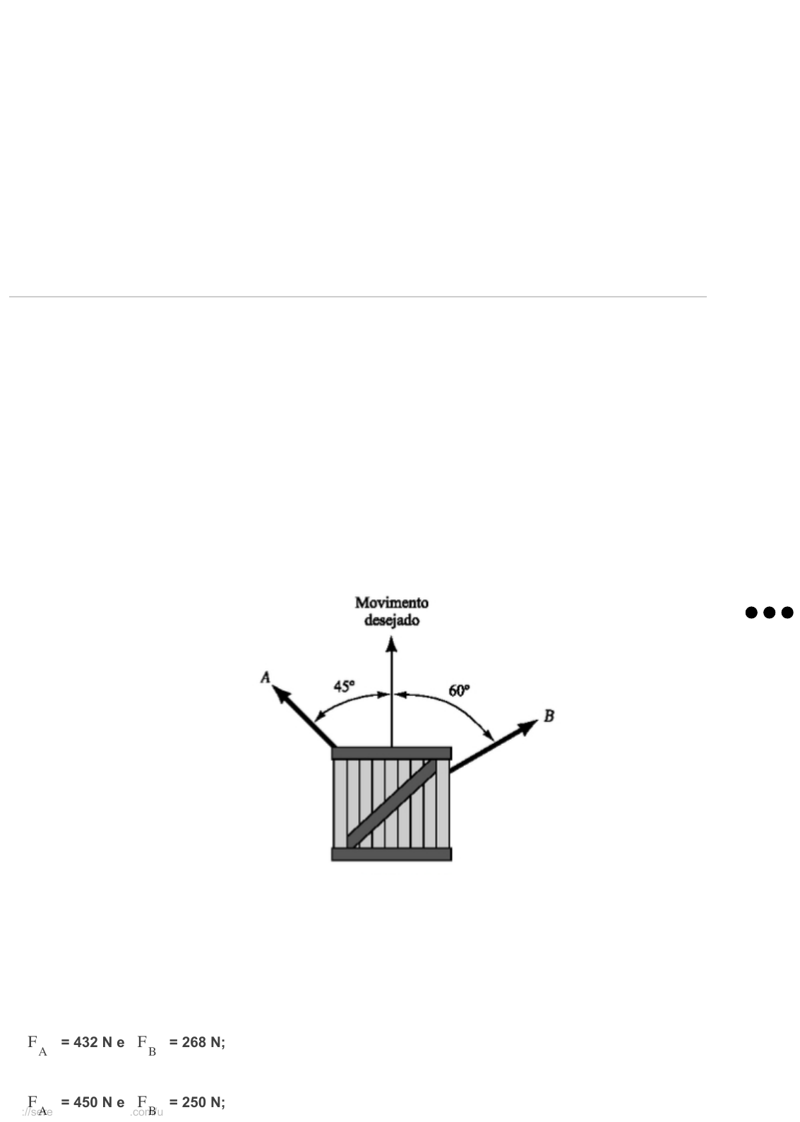 13/04/2023, 07:42 Comentários https://sereduc.blackboard.com/ultra/courses/_166183_1/outline/assessment/_7984254_1/overview/attempt/_25861138_1/review/inline-feedbac… 1/10 Conteúdo do exercício Ocultar opções de resposta Pergunta 1 0 / 1 Dois homens estão tentando puxar uma caixa que não se moverá até que uma força de 700 N seja aplicada em uma direção qualquer. O homem A pode puxar caixa em uma direção a 45° da direção desejada do movimento da caixa, enquanto o homem B pode puxá-la a 60 ° da direção desejada. Qual a força que cada homem deve exercer par que a caixa se mova na direção mostrada na figura? Resposta corretaFA = 628 N e FB = 512 N; FA = 432 N e FB = 268 N; FA = 450 N e FB = 250 N; Nota final Enviado em: 10/04/23 11:00 (BRT) 8/10 13/04/2023, 07:42 Comentários https://sereduc.blackboard.com/ultra/courses/_166183_1/outline/assessment/_7984254_1/overview/attempt/_25861138_1/review/inline-feedbac… 2/10 Ocultar opções de resposta Incorreta: FA = 600 N e FB = 450 N; FA = 521 N e FB = 245 N; Pergunta 2 1 / 1 Uma caixa de 500 N é suportada por três forças. Essas devem ter uma resultante de 500 N para cima. Quais os valores de F1 e F3 nessas condições? Todas as forças são coplanares. F1 = 231 N e F3 = 576 N Resposta corretaF1 = 480 N e F3 = 717 N F1 = 300 N e F3 = 200 N F1 = 256 N e F3 = 430 N F1 = 340 N e F3 = 834 N Pergunta 3 1 / 1 13/04/2023, 07:42 Comentários https://sereduc.blackboard.com/ultra/courses/_166183_1/outline/assessment/_7984254_1/overview/attempt/_25861138_1/review/inline-feedbac… 3/10 Ocultar opções de resposta Dois jogadores de futebol americano empurram uma barreira. O jogador A empurra a barreira com uma força de 400 N, enquanto o jogador B a empurra com uma força de 350 N, sendo que essas forças passam pelo ponto C. Qual a força resultante exercida sobre a barreira pelos jogadores? 750 N 589 N 634 N 50 N Resposta correta725 N Pergunta 4 1 / 1 Determine a intensidade das foças nos cabo CB e BD. Considere que o sistema de cabos é coplanar e o roldana em E pode girar sem oferecer qualquer resistência. 13/04/2023, 07:42 Comentários https://sereduc.blackboard.com/ultra/courses/_166183_1/outline/assessment/_7984254_1/overview/attempt/_25861138_1/review/inline-feedbac… 4/10 Ocultar opções de resposta FCB = 626 N e FBD = 1077 N; FCB = 100 N e FBD = 200 N; FCB = 124 N e FBD = 220 N; Resposta corretaFCB = 1215 N e FBD = 2154 N; FCB = 1500 N e FBD = 2500 N; Pergunta 5 0 / 1 Dois barcos rebocadores estão efetuando manobras em um navio. A força total desejada é de 13,5 kN a uma ângulo de 15°. Considerando as direções das forças dos rebocadores mostrada na figura. Quais devem ser os valores de F1 e F2? 13/04/2023, 07:42 Comentários https://sereduc.blackboard.com/ultra/courses/_166183_1/outline/assessment/_7984254_1/overview/attempt/_25861138_1/review/inline-feedbac… 5/10 Ocultar opções de resposta Dois barcos rebocadores estão efetuando manobras em um navio. A força total desejada é de 16,0 kN a uma ângulo de 15°. Considerando as direções das forças dos rebocadores mostrada na figura, qual deve ser o valore de F1 ? Resposta corretaF1 = 14,4 N; F1 = 3,62 N; Incorreta: F1 = 15,6 N; F1 = 12,1 N; F1 = 2,48 N; Pergunta 6 1 / 1 A treliça de uma ponte está sujeita a forças em suas barras com mostra o corte esquemático da figura. Qual é a força total sobre o pino A em virtude das forças nas barras, em kN? 13/04/2023, 07:42 Comentários https://sereduc.blackboard.com/ultra/courses/_166183_1/outline/assessment/_7984254_1/overview/attempt/_25861138_1/review/inline-feedbac… 6/10 Ocultar opções de resposta 10 130 Resposta correta51 65 31 Pergunta 7 1 / 1 Determine a intensidade força F necessária para manter o sistema de forças concorrente em equilíbrio. 13/04/2023, 07:42 Comentários https://sereduc.blackboard.com/ultra/courses/_166183_1/outline/assessment/_7984254_1/overview/attempt/_25861138_1/review/inline-feedbac… 7/10 Ocultar opções de resposta F = 2,33 kN Resposta corretaF = 1,61 kN F = 4,36 kN F = 4,32 kN F = 2,40 kN Pergunta 8 1 / 1 Representa a força F1 em termos de suas componentes cartesianas. 13/04/2023, 07:42 Comentários https://sereduc.blackboard.com/ultra/courses/_166183_1/outline/assessment/_7984254_1/overview/attempt/_25861138_1/review/inline-feedbac… 8/10 Ocultar opções de resposta Resposta corretaF1 = 212i + 150j - 150k F2 = 618,1i + 340j + 172k F2 = 618,1i + 340j - 172k F2 = 495i + 350j - 350k F2 = 150i - 150j + 150k Pergunta 9 1 / 1 Em uma cabo de guerra, quando o time B puxa a corda com uma força de 1,8 kN, qual deverá ser a força exercida pelo time C para o balanço de forças? Com que força o time A puxará a corda? 13/04/2023, 07:42 Comentários https://sereduc.blackboard.com/ultra/courses/_166183_1/outline/assessment/_7984254_1/overview/attempt/_25861138_1/review/inline-feedbac… 9/10 Ocultar opções de resposta Ocultar opções de resposta FA = 0,854 kN e FC = 0,946 kN; FA = 1,317 kN e FC = 0,931 kN; FA = 0, kN e FC = 250 kN; Resposta corretaFA = 0,931 kN e FC = 1,317 kN; FA = 0,946 kN e FC = 0,854 kN; Pergunta 10 1 / 1 Considere que FT seja a soma vetorial entre F1 e a força de 500 N, determine FT . 13/04/2023, 07:42 Comentários https://sereduc.blackboard.com/ultra/courses/_166183_1/outline/assessment/_7984254_1/overview/attempt/_25861138_1/review/inline-feedba… 10/10 980 N 510 N 786 N 430 N Resposta correta685 N