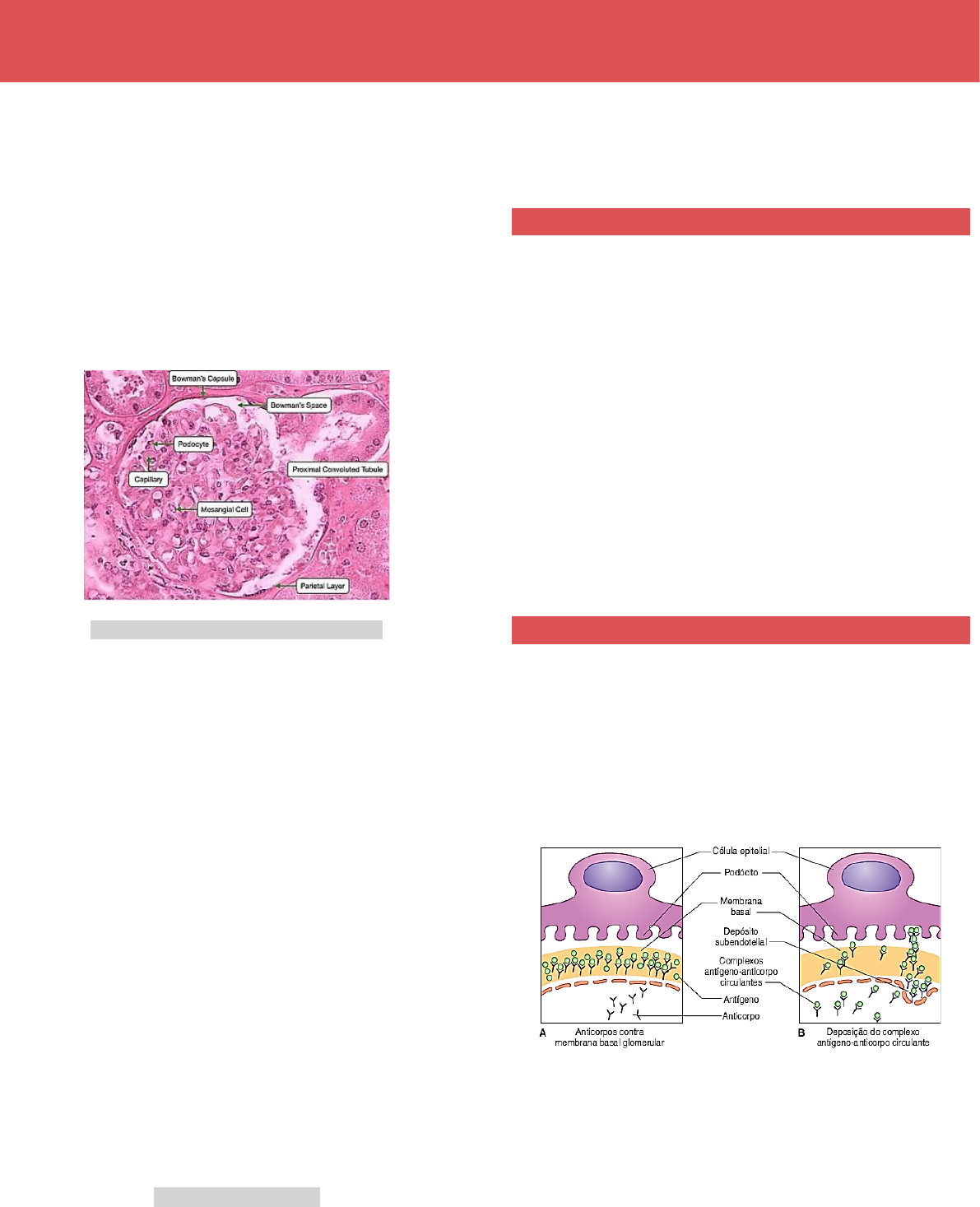 Maria Luiza Sena – Med XIV FASA Os capilares glomerulares filtram 120-180 litros por dia de água plasmática contendo vários solutos, que deverão ser recuperados ou expelidos pelos túbulos. A maioria das grandes proteínas e todas as células são excluídas da filtração por uma barreira físico-química, determinada pelo tamanho dos poros e pela carga eletrostática negativa. A gama de doenças que acometem o glomérulo é extensa, visto que o microambiente que suporta os capilares glomerulares pode ser lesionado de várias maneiras, culminando em lesões bastante distintas. MORFOFISIOLOGIA DOS GLOMÉRULOS Glomérulos são tufos de capilares situados entre as arteríolas aferentes e as arteríolas eferentes. Esses capilares estão dispostos em lóbulos e são sustentados por pedículos formados por células mesangiais e por matriz extracelular. A membrana dos glomérulos é formada por 3 camadas estruturais: ❖ Uma camada de células endoteliais, que reveste a superfície mais interna do capilar. ❖ Uma membrana basal, constituída por uma rede de proteínas matriciais. ❖ Uma camada de células epiteliais, que circunda a superfície mais externa do capilar e recobre a superfície mais interna da Cápsula de Bowman. As células epiteliais estão ligadas à membrana basal por prolongamentos longos, conhecidos como podócitos. Essa membrana tem permeabilidade seletiva, ou seja, possibilita que água e que partículas pequenas (eletrólitos e moléculas dissolvidas, inclusive glicose e aminoácidos) deixem o sangue e entrem no Espaço de Bowman, ao mesmo tempo que impedem que partículas maiores (proteínas plasmáticas e células sanguíneas) saiam do sangue. DOENÇA GLOMERULAR Glomerulonefrite é um processo inflamatório que envolve as estruturas glomerulares. A glomerulonefrite pode ser um distúrbio primário, no qual uma anormalidade glomerular é o único problema existente, ou pode ser uma condição secundária, na qual uma anormalidade glomerular resulta de uma outra doença. ETIOLOGIA DA LESÃO GLOMERULAR Os agentes ou eventos causadores de lesão glomerular incluem mecanismos imunológicos, mecanismos não imunológicos e mecanismos hereditários. Muitos casos de doença glomerular primária e de doença glomerular secundária, provavelmente, têm origem imune. Embora várias doenças glomerulares sejam suscitadas por eventos imunológicos, inúmeros estressores não imunológicos metabólicos (diabetes), hemodinâmicos (hipertensão arterial) e tóxicos (drogas ilícitas e fármacos), podem ocasionar uma lesão glomerular. Doenças glomerulares hereditárias, como uma Síndrome de Alport, apesar de, relativamente, raras, são uma importante categoria de doença glomerular, por conta da sua associação com uma perda progressiva da função renal e com sua transmissão para futuras gerações. PATOGÊNESE DA LESÃO GLOMERULAR 2 tipos de mecanismos imunes foram implicados na patogênese da doença glomerular: ❖ Lesão resultante de anticorpos que reagem com antígenos glomerulares fixos ou com antígenos depositados dentro do glomérulo. ❖ Lesão resultante de vários complexos (antígenos-anticorpos) circulantes retidos na membrana glomerular. Os antígenos responsáveis pelo desenvolvimento da reação imune podem ter origem endógena, como autoanticorpos contra o DNA no LES, ou podem ser exógenos, como os antígenos da membrana na glomerulonefrite pós-estreptocócica. Em muitos casos, a origem do antígeno não é conhecida. As alterações glomerulares podem ser: ❖ Difusas -> envolvendo todos os glomérulos e todos os seus componentes. ❖ Focais -> quando apenas glomérulos são afetados. APG 19 - SÍNDROME NEFRÍTICA Maria Luiza Sena – Med XIV FASA ❖ Segmentares -> quando há envolvimento apenas de determinado segmento de cada glomérulo. ❖ Mesangiais -> quando as células mesangiais são afetadas. As alterações celulares que ocorrem na doença glomerular aumentam as contagens finais de células inflamatórias (proliferativas ou hipercelulares), causam um espessamento da membrana basal (membranosa) e acarretam alterações dos componentes não celulares do glomérulo (esclerose e fibrose). AUMENTO DAS CÉLULAS Caracteriza-se por 1 ou mais das seguintes alterações: ❖ Proliferação das células endoteliais ou das células mesangiais. ❖ Infiltração dos leucócitos (neutrófilos, monócitos e linfócitos). ❖ Formação de crescentes no Espaço de Bowman. ESPESSAMENTO DA MEMBRANA BASAL Consiste em deposição de material acelular denso na superficie endotelial e na superfície epitelial da membrana basal, ou dentro da própria membrana. ESCLEROSE Aumento da quantidade de material extracelular em tecidos mesangiais, tecidos subendoteliais ou tecidos subepiteliais do glomérulo. FIBROSE Consiste na deposição de fibras de colágeno. TIPOS DE DOENÇAS GLOMERULARES As manifestações clínicas dos distúrbios glomerulares, geralmente, são classificadas em 5 grupos: ❖ Síndromes Nefríticas ❖ Glomerulonefrite rapidamente progressiva ❖ Síndrome Nefrótica ❖ Distúrbios assintomáticos do sedimento urinário ❖ Glomerulonefrite crônica As síndromes nefríticas desencadeiam uma resposta inflamatória proliferativa, enquanto uma síndrome nefrótica aumenta uma permeabilidade do glomérulo. Como uma maioria das doenças glomerulares pode causar uma síndrome nefrítica e uma síndrome nefrótica mistas, o diagnóstico definitivo, geralmente, depende de biópsia renal. SÍNDROME NEFRÍTICA Síndrome nefrítica aguda é o correspondente clínico da inflamação glomerular aguda. Em sua forma mais grave, caracteriza-se por início súbito de hematúria, graus variáveis de proteinúria, redução da TFG, oligúria e sinais de disfunção renal. As síndromes nefríticas agudas se manifestam, classicamente, com hipertensão, hematúria, cilindros hemáticos, piúria e proteinúria leve ou moderada. O dano inflamatório extenso dos gloméru