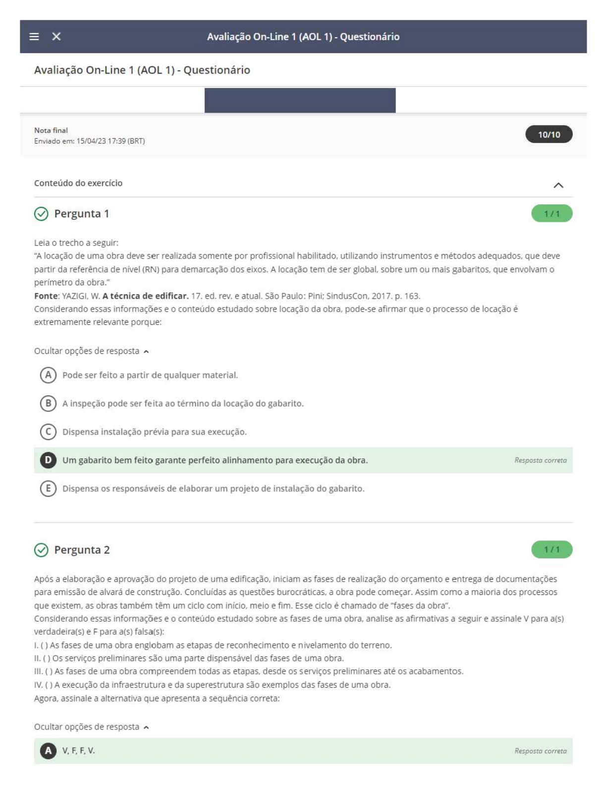 = X Avaliação On-line 1 (AOL 1)- Questionário Avaliação On-l ine 1 (AOL 1)- Questionário Nota fi nal Enviado em: 15/04/23 17:39 (BRD ♦HU+ Conteúdo do exercício 0 Pergunta 1 Leia o trecho a seguir: "A locação de uma obra deve ser realizada somente por profissional habilitado. utilizando instrumentos e métodos adequados. que deve partir da referência de nível (RN) para demarcação dos eixos. A locação tem de ser global. sobre um ou mais gabaritos, que envolvam o perímetro da obra." Fonte: YAZIGI, W. A técnica de edificar. 17. ed. rev. e atual. São Paulo: Pini; SindusCon. 2017. p. 163. Considerando essas informações e o conteúdo estudado sobre locação da obra, pode-se afirmar que o proce:sso de locação é extremamente relevante porque: Ocultar opções de resposta A @ Pode ser feito a partir de qualquer material. ® A inspeção pode ser feita ao término da locação do gabarito. @ Dispensa instalação prévia para sua execução. e Um gabarito bem feito garante perfeito alinhamento para execução da obra. © Dispensa os responsáveis de elaborar um projeto de instalação do gabarito. 0 Pergunta 2 Resposta correta Após a elaboração e aprovação do projeto de uma edificação, iniciam as fases de real ização do orçamento e entrega de documentações para emissão de alvará de construção. Concluídas as questões burocráticas, a obra pode começar. Assim como a maioria dos processos que existem, as obras também têm um ciclo com início, meio e fim. Esse ciclo é chamado de "fases da obra". Considerando essas informações e o conteúdo estudado sobre as fases de uma obra, anal ise as afirmativas a seguir e assinale V para a(s) verdadeira(s) e F para a(s) falsa(s): 1. () As fases de uma obra englobam as etapas de reconhecimento e n ivelamento do terreno. li. () Os serviços preliminares são uma parte dispensável das fases de uma obra. Ili. ( ) As fases de uma obra compreendem todas as etapas, desde os serviços preliminares até os acabamentos. IV. () A execução da infraestrutura e da superestrutura são exemplos das fases de uma obra. Agora. assina le a alternativa que apresenta a sequência correta: Ocultar opções de resposta A o V, F, F, V. Resposta correta ® F, F, V, V. © F, V, V, F. ® V, V, F, V. © V, F, V, F. 0 Pergunta 3 No acondicionamento do canteiro de obras estão previstas as instalações provisórias, que são espaços operacionais e de convivência. Esses espaços apresentam elementos específicos locados, conhecidos como elementos do canteiro de obras. Considerando essas informações e o conteúdo estudado sobre serviços prel iminares, terraplenagem e instalações provisórias, analise os elementos a segui r e os associe-os a suas respectivas características: 1) Elementos de produção. 2) Elementos de t ransporte. 3) Elementos de apoio técnico. 4) Elementos de vivência. () Elementos de uso comum a todos os funcionários, sendo suporte a atividades diversas como estacionamentos, guaritas, sala de reuniões e outros. () Todos aqueles necessários à execução da obra, como centra is de argamassa, de formas, de pré-moldados e de montagem das instalações. () Áreas que visam supri r as necessidades básicas dos seres humanos, como alimentação, higiene e descanso. () Elementos responsáveis pelo transporte de materiais dentro da obra, podendo ser manuais ou mecanizados. Agora, assina le a alternativa que apresenta a sequência correta: Ocultar opções de resposta A @ 4,1, 3, 2. ® 1, 4, 2, 3. © 2, 4, 1, 3. ® 3, 2, 1, 4. o 3, 1,4,2. 0 Pergunta 4 Resposta correta A movimentação de terra, mais conhecida como terraplenagem, é um procedimento de adequação do terreno aos requ isitos sol icitados em projeto. Tal adaptação é feita por meio do corte e/ou aterro de terra e transporte do material excedente. Considerando essas informações e o conteúdo estudado sobre terraplenagem, analise as afirmativas a seguir: 1. São dispensados quaisquer pré-requisitos à execução da terraplenagem de um terreno li. A adequação de um terreno é feita por meio de cortes de terra e aterro conforme a necessidade. Ili. O levantamento plania ltimétrico constitui o requ isito mínimo para executar a terraplenagem. IV. Em locais com pouca terra, é indicada a real ização do procedimento denominado corte. Está correto apenas o que se afirma em: Ocultar opções de resposta A @ 11e 1v. 0 11e111. @ 1e1 1. ® Ili e IV. © 1e1 11. 0 Pergunta 5 Leia o trecho a seguir: Resposta correta "O sistema de formas e escoramentos que moldam e sustentam, respectivamente, a estrutura durante o processo de concretagem deve ser removida de acordo com o plano de desforma previamente estabelecido e de maneira a não comprometer a segurança e o desempenho em serviço da estrutura." Fonte: ASSOCIAÇÃO BRASILEIRA DE NORMAS TÉCNICAS. NBR 14931: execução de estruturas de concreto - Procedimento. Rio de Janeiro: ABNT, 2004. p. 23. Considerando essas informações e o conteúdo estudado sobre a retirada do sistema de formas e escoramentos, analise as afirmativas a seguir e assinale V para a(s) verdadeira(s) e F para a(s) falsa(s): 1. () Dispensa-se a verificação das cond ições ambienta is às quais o concreto estará submetido poster iormente à retirada. li. () Deve-se considerar e anal isar a sequência de retirada das formas e escoramentos. Ili. ( ) O peso próprio da estrutura ou da parte a ser suportada pelo elemento estrutural deve ser considerado para a remoção das formas. IV. () Após a retirada das formas, as peças estão isentas da real ização de tratamentos superficiais posteriores. Agora, assina le a alternativa que apresenta a sequência correta: Ocultar opções de resposta A @ V,V, F, V. ® V, F, F, V. © F, V, V, V. e F,V,V,F. © V, F, V, F. 0 Pergunta 6 Leia o trecho a seguir: Resposta correta "Após o concreto passar pelo processo de cura adequado, pode-se remover o sistema de formas e escoramentos das peças. No entanto,