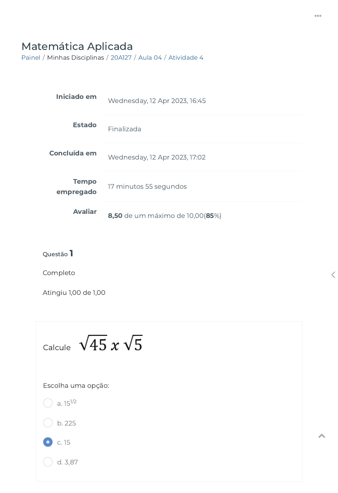 12/04/2023, 17:03 Atividade 4 https://ava.politecnicabr.com.br/mod/quiz/review.php?attempt=4713260 1/6 Painel / Minhas Disciplinas / 20A127 / Aula 04 / Atividade 4 Matemática Aplicada Iniciado em Wednesday, 12 Apr 2023, 16:45 Estado Finalizada Concluída em Wednesday, 12 Apr 2023, 17:02 Tempo empregado 17 minutos 55 segundos Avaliar 8,50 de um máximo de 10,00(85%) Questão 1 Completo Atingiu 1,00 de 1,00 Calcule Escolha uma opção: a. 151/2 b. 225 c. 15 d. 3,87 https://ava.politecnicabr.com.br/my/ https://ava.politecnicabr.com.br/course/view.php?id=964 https://ava.politecnicabr.com.br/course/view.php?id=964#section-5 https://ava.politecnicabr.com.br/mod/quiz/view.php?id=25963 https://ava.politecnicabr.com.br/ 12/04/2023, 17:03 Atividade 4 https://ava.politecnicabr.com.br/mod/quiz/review.php?attempt=4713260 2/6 Questão 2 Completo Atingiu 1,00 de 1,00 Calcule Escolha uma opção: Questão 3 Completo Atingiu 1,00 de 1,00 Calcule Escolha uma opção: a. 51/2 b. 25 c. 5 d. 2,24 a. 12 b. 3,46 c. 121/2 d. 144 https://ava.politecnicabr.com.br/ 12/04/2023, 17:03 Atividade 4 https://ava.politecnicabr.com.br/mod/quiz/review.php?attempt=4713260 3/6 Questão 4 Completo Atingiu 1,00 de 1,00 Calcule Escolha uma opção: Questão 5 Completo Atingiu 0,00 de 1,50 Calcule Escolha uma opção: a. 10*101/2 b. 100.000 c. 1.000 d. 1.000.000.000 a. 1.000 b. 10*101/2 c. 100 d. 10 https://ava.politecnicabr.com.br/ 12/04/2023, 17:03 Atividade 4 https://ava.politecnicabr.com.br/mod/quiz/review.php?attempt=4713260 4/6 Questão 6 Completo Atingiu 1,50 de 1,50 Aplicando a radiciação, calcule Escolha uma opção: Questão 7 Completo Atingiu 1,50 de 1,50 Aplicando a radiciação, calcule Escolha uma opção: a. 1/(7 )1/2 b. 21/(7 )1/2 c. 3*(7 )/71/2 d. 3/7 a. 72/9 b. 79/2 c. 7 d. 7² https://ava.politecnicabr.com.br/ 12/04/2023, 17:03 Atividade 4 https://ava.politecnicabr.com.br/mod/quiz/review.php?attempt=4713260 5/6 Questão 8 Completo Atingiu 1,50 de 1,50 Aplicando a radiciação, calcule Escolha uma opção: a. 7/10 b. 14/[5*(2 )]1/2 c. 7*(2 )/51/2 d. 7*(2 )/101/2 Entre em Contato https://www.politecnicabr.com.br 0800 084 2627 0800 084 2627 Links Úteis Dicas da nossa Diretora Acadêmica Planner de Estudos Declaração de Matrícula Orientações do AVA Abertura de Ticket Fale com o Tutor Cronograma de Estudos Manual de Estágio Manual de Competência Siga-nos nas redes sociais https://www.politecnicabr.com.br/ https://soundcloud.com/user-501638417/sets/escola-politecnica-brasileira https://storage.googleapis.com/sirius-pubstore/semestre_plannerdeestudo%20poli.pdf https://storage.googleapis.com/sirius-pubstore/declaracao_matricula.pdf https://storage.googleapis.com/sirius-pubstore/orientacoes_ava.pdf https://storage.googleapis.com/sirius-pubstore/abertura_ticket.pdf https://storage.googleapis.com/sirius-pubstore/fale_com_tutor.pdf https://storage.googleapis.com/sirius-pubstore/cronograma_estudos.pdf https://storage.googleapis.com/sirius-pubstore/manual_estagio.pdf https://storage.googleapis.com/sirius-pubstore/manual_competencia.pdf https://ava.politecnicabr.com.br/ 12/04/2023, 17:03 Atividade 4 https://ava.politecnicabr.com.br/mod/quiz/review.php?attempt=4713260 6/6 © 2022 - Escola Politécnica Brasileira https://ava.politecnicabr.com.br/mod/quiz/0 https://www.facebook.com/politecnicabr https://www.instagram.com/politecnicabr_oficial https://ava.politecnicabr.com.br/