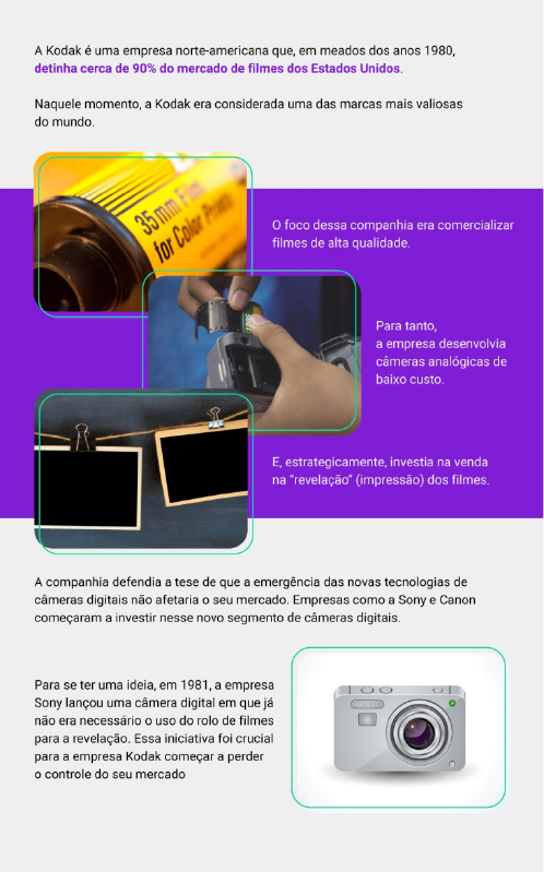 Desafio A teoria organizacional estuda as forças que atuam nas organizações em um ambiente geral global, bem como no ambiente de tarefa, que é o ambiente mais próximo e imediato em que uma organização pode ser afetada. Nela, aplica-se a capacidade dos administradores em obter recursos e os disponibilizar à produção da empresa. Assim, essas decisões são afetadas pelas forças do ambiente que têm impacto significativo na tomada de decisões no curto prazo. O planejamento e a execução das atividades devem sempre levar em conta e se utilizar dessas forças, de modo a obter os resultados desejados de forma mais consistente. A fim de ilustrar os conceitos expostos, conheça o caso da empresa Kodak: Com base no caso exposto, o seu desafio é propor uma alternativa à empresa Kodak com base no estudo das forças que atuam nas organizações. Portanto, responda: quais são as forças que atuam no ambiente de tarefa de uma organização e como elas afetaram a empresa Kodak? Padrão de resposta esperado As forças no ambiente de tarefa resultam das ações de fornecedores, distribuidores, clientes e concorrentes tanto no mercado doméstico como no mercado externo. No caso da empresa Kodak, a organização acabou perdendo espaço no mercado simplesmente por não acompanhar as mudanças de hábito e cultura do seu público consumidor. Com a emergência das novas tecnologias, os consumidores migraram da fotografia analógica para a digital, e a marca acabou não acompanhando essa transformação no mercado.