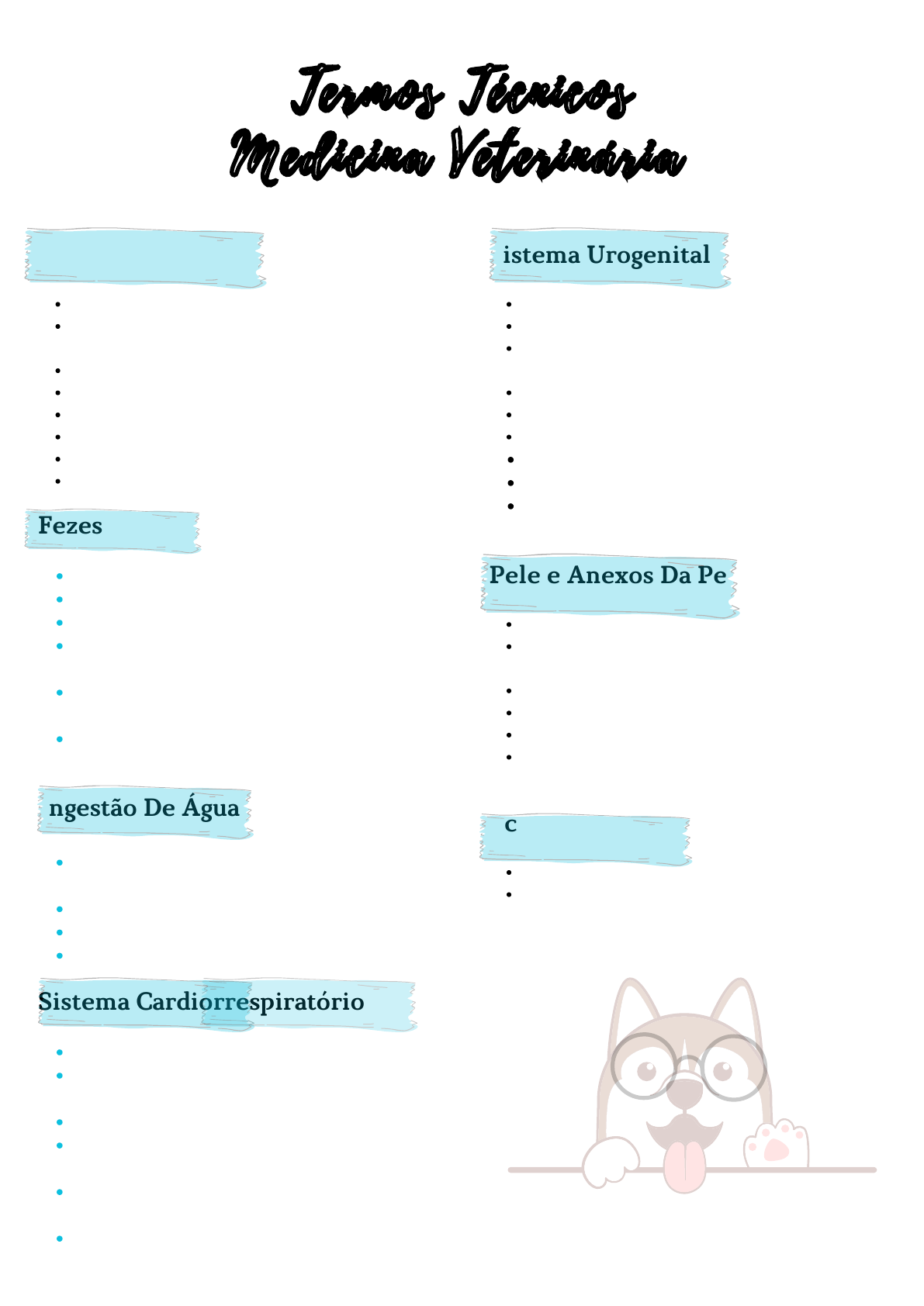 Normorexia - ingestão normal Hiporexia - alimentar-se em pouca quantidade Anorexia - não se alimenta Polifagia - comer em grande quantidade Parorexia - apetite inapropriado Disfagia - dificuldade de deglutição Coprofagia - ingestão de fezes Emese - vomito Normoquesia - fezes normais Disquesia - dificuldade ao defecar Tenesmo - dor ao defecar Hematoquesia - presença de sangue vivo nas fezes Diarreia - perda da consistência das fezes Melena - presença de sangue escuro nas fezes Normodipsia - ingestão normal de agua Polidpsia - beber muita água Oligodpsia - beber pouca água Adpsia - sem ingestão de água Dispnéia - dificuldade respiratória Taquipnéia - aumento da frequência respiratória Apnéia - parada respiratória Síncope - perda momentânea da consciência Cianose - mucosas roxas/azuladas falta de oxigenação Ascite - acumulo de liquido no peritônio Sistema Digestório Fezes Ingestão De Água Sistema Cardiorrespiratório Anúria - nao produz urina Oligúria - redução da produção de urina Poliúria - aumento da produção de urina Disúria - dificuldade ao urinar Estranguria - dor ao urinar Polaquiúria - aumento da frequência Colúria - alteração na cor da urina Incontinência - perda do controle Hematúria - sangue na urina Prurido - coceira Meneios cefálicos - balançar a cabeça, ouvidos Normoacusia - audição normal Anacusia - surdez total Hipoacusia - perda parcial da audição Hiperacusia - sensibilidade a alguns sons Puliciose - presença de pulgas Ixodidiose - presença de carrapatos Sistema Urogenital Pele e Anexos Da Pele Ectoparasitas Termos Técnicos Medicina Veterinária Termos Técnicos Medicina Veterinária