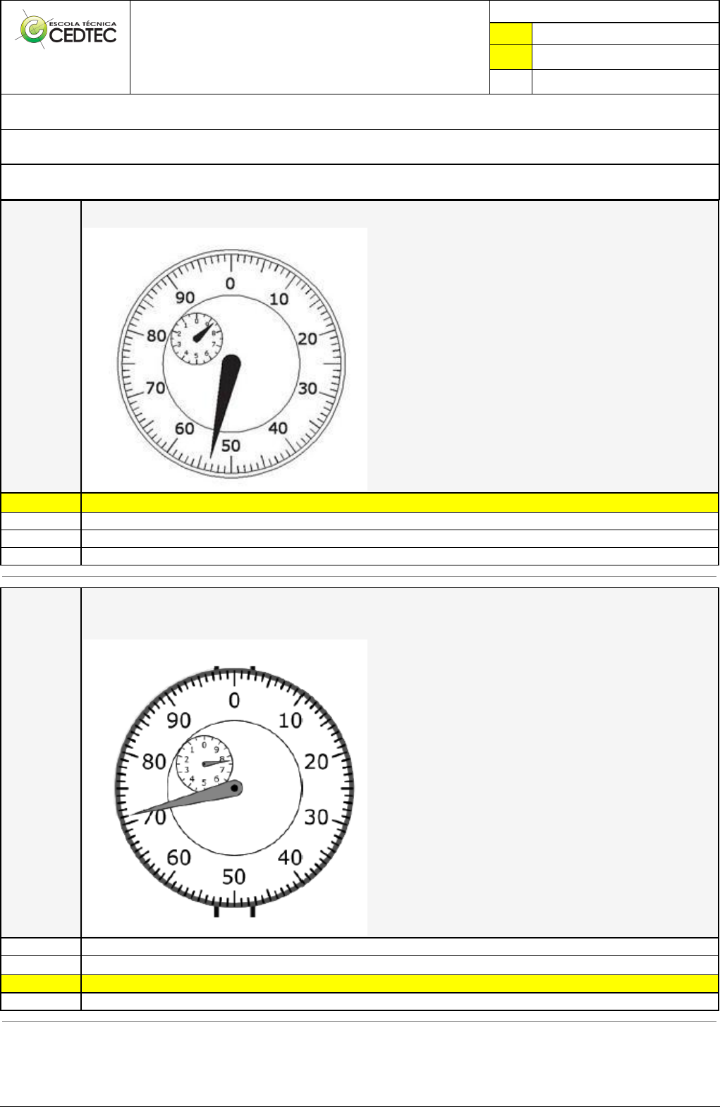 Pincel Atômico - 16/04/2023 15:04:52 1/2 RONIERY RODRIGUES GEGENHEIMER JUNIOR Exercício Caminho do Conhecimento - Etapa 14 (15349) Atividade finalizada em 22/08/2022 12:27:45 (445028 / 2) LEGENDA Resposta correta na questão # Resposta correta - Questão Anulada X Resposta selecionada pelo Aluno Disciplina: METROLOGIA [453564] - Avaliação com 4 questões, com o peso total de 6,50 pontos [capítulos - 106] Turma: Curso Técnico: Mecânica - Grupo: ABRIL/22 PRES - MECCAR [66400] Aluno(a): 91312163 - RONIERY RODRIGUES GEGENHEIMER JUNIOR - Respondeu 2 questões corretas, obtendo um total de 3,25 pontos como nota [350185_28189] Questão 001 Um relógio comparador com VERNIER igual a 0,01 mm foi utilizado para medir o desalinhamento máximo de uma roda. Qual é, em mm, a leitura indicada ? X 8,53 ± 0,005 mm 8,54 ± 0,001 mm 8,53 ± 0,01 mm 53,08 ± 0,005 mm [350186_28190] Questão 002 Um relógio comparador foi montado em uma base magnética com intuito de ser utilizado para medir as dimensões de sucessivas peças produzidas por uma máquina. Para definir uma posição zero a partir da qual o relógio deveria medir as peças, um bloco-padrão com comprimento de 50 mm foi utilizado. O relógio foi zerado no seu curso máximo, com 10 mm de contração. A primeira peça medida resultou na indicação do relógio comparador mostrada abaixo. 57,71 mm X 7,71 mm 47,71 mm 2,29 mm Pincel Atômico - 16/04/2023 15:04:52 2/2 [350185_604] Questão 003 Marque a alternativa correta que corresponde a leitura do instrumento abaixo: X -2,78 mm; 2,78 mm; -3,78 mm; 1,78 mm; 5,78 mm; [350184_597] Questão 004 Nos relógios comparadores comuns, cada volta completa do equipamento vale 1mm. Como o mostrador tem 100 divisões, cada divisão vale (em mm): X 0,01 0,1 0,015 0,001 0,002