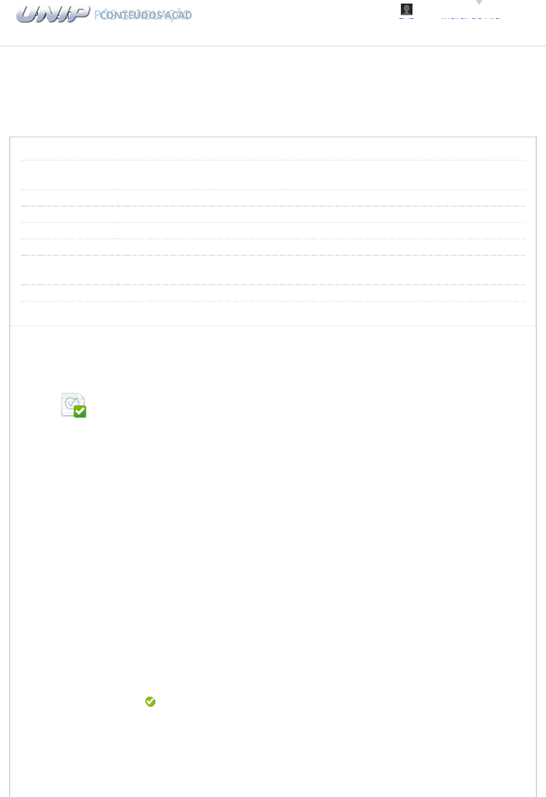 10/04/2023, 23:23 Revisar envio do teste: Questionário - Unidade IV – ... https://ava.ead.unip.br/webapps/assessment/review/review.jsp?attempt_id=_93004527_1&course_id=_54099_1&content_id=_846419_1&return_… 1/9 Revisar envio do teste: Questionário - Unidade IV Autorregulação e Funções Cognitivas, Executivas e Metacognitivas: Implicações na Aprendizagem 14333-40- ED11392_06_01-202331 Unidade IV Usuário Talita Nunes dos Santos Curso Autorregulação e Funções Cognitivas, Executivas e Metacognitivas: Implicações na Aprendizagem Teste Questionário - Unidade IV Iniciado 10/04/23 23:13 Enviado 10/04/23 23:23 Status Completada Resultado da tentativa 0,225 em 0,375 pontos Tempo decorrido 10 minutos Resultados exibidos Todas as respostas, Respostas corretas, Comentários, Perguntas respondidas incorretamente Pergunta 1 Respostas: a. b. c. d. e. Atenção: habilidade que permite a seleção de estímulos a serem processados a serem processados, facilitando que o aparato cerebral faça um uso criterioso e sensato dos seus recursos cognitivos. (DIAS, p. 98, 2019). Baseado nos conceitos de Atenção, coloque (V) para Verdadeiro ou (F) para Falso nas assertivas abaixo: ( ) A atenção é responsável também pelo monitoramento da interação da pessoas com o seu meio, seja por intermédio de processos controlados ou automáticos, com maior ou menor grau de consciência da situação e utiliza mais ou menos recursos atencionais. ( ) Atenção e funções executivas são fundamentais para a interação humana com o seu ambiente, sejam comportamentos, cognições ou emoções. ( ) São importantes: a Atenção Dividida (a qual permite executar tarefas que exigem mudanças rápidas no repertório de respostas) e a Atenção Seletiva (que é a capacidade de separar o foco atencional entre dois estímulos simultâneos). Assinale a alternativa correta: V, F, V V, V, F F, V, V F, F, V V, F, F PÓS EAD COMUNIDADES BIBLIOTECAS Mural do AlunoCONTEÚDOS ACADÊMICOS 0,0375 em 0,0375 pontos Talita Santos 4 https://ava.ead.unip.br/webapps/blackboard/execute/courseMain?course_id=_54099_1 https://ava.ead.unip.br/webapps/blackboard/content/listContent.jsp?course_id=_54099_1&content_id=_846401_1&mode=reset https://ava.ead.unip.br/webapps/portal/execute/tabs/tabAction?tab_tab_group_id=_66_1 https://ava.ead.unip.br/webapps/portal/execute/tabs/tabAction?tab_tab_group_id=_69_1 https://ava.ead.unip.br/webapps/portal/execute/tabs/tabAction?tab_tab_group_id=_67_1 https://ava.ead.unip.br/webapps/portal/execute/tabs/tabAction?tab_tab_group_id=_68_1 https://ava.ead.unip.br/webapps/portal/execute/tabs/tabAction?tab_tab_group_id=_70_1 https://ava.ead.unip.br/webapps/login/?action=logout 10/04/2023, 23:23 Revisar envio do teste: Questionário - Unidade IV – ... https://ava.ead.unip.br/webapps/assessment/review/review.jsp?attempt_id=_93004527_1&course_id=_54099_1&content_id=_846419_1&return_… 2/9 Comentário da resposta: Alternativa correta: B Comentário: A atenção é responsável também pelo monitoramento da interação das pessoas com o seu meio, seja por intermédio de processos controlados ou automáticos, com maior ou menor grau de consciência da situação e utiliza mais ou menos recursos atencionais. (CASTRO, RUEDA & CISTO, 2010 apud DIAS, p. 98, 2019). Atenção e funções executivas são fundamentais para a interação humana com o seu ambiente, sejam comportamentos, cognições ou emoções. Atenção dividida: Capacidade de dividir o foco atencional entre dois estímulos simultâneos. (escrever e conversar. Ex. Escrever uma informação e a outra pessoa dita o que é para ser escrito). Atenção Seletiva: Possibilita realizar uma tarefa de modo contínuo na presença de estímulos distratores. (Ler um livro ou estudar e no fundo ter uma música e continuar concentrado no estudo). Unidade IV - 4.1.1 Modalidades de Atenção, p. 80. Pergunta 2 Respostas: a. b. c. d. De acordo com Dias (p. 98, 2019), dentre as várias modalidades da atenção é correto afirmar que: I. Atenção Sustentada: capacidade de manter a atenção durante uma atividade contínua como ouvir atentamente a explicação do professor durante um longo período. II. Atenção dividida: Capacidade de dividir o foco atencional entre duas atividades motoras e cinestésicas simultâneas. (Escrever e conversar). III. Atenção Seletiva: Possibilita realizar uma tarefa de modo contínuo na presença de estímulos distratores. (Ler um livro ou estudar e no fundo ter uma música e continuar concentrado no estudo). IV. Atenção dividida: Capacidade de dividir o foco atencional entre dois estímulos simultâneos. (Escrever e conversar. Ex. Escrever uma informação e a outra pessoa dita o que é para ser escrito). V. Atenção alternada: Permite executar tarefas que exigem mudanças rápidas no repertório de respostas. (O ato de dirigir). Assinale a alternativa correta: São corretas somente as assertivas I, II, IV e V São corretas somente as assertivas I, III, IV e V São corretas somente as assertivas II, III, IV e V São corretas somente as assertivas I, II, III e IV 0,0375 em 0,0375 pontos 10/04/2023, 23:23 Revisar envio do teste: Questionário - Unidade IV – ... https://ava.ead.unip.br/webapps/assessment/review/review.jsp?attempt_id=_93004527_1&course_id=_54099_1&content_id=_846419_1&return_… 3/9 e. Comentário da resposta: São corretas somente as assertivas I, II, III e V Alternativa correta: B Comentário: Entre as várias modalidades da atenção citadas por Dias (p. 98, 2019), evidenciam-se as: Atenção Sustentada: capacidade de manter a atenção durante uma atividade contínua como ouvir atentamente a explicação do professor durante um longo período. Atenção dividida: Capacidade de dividir o foco atencional entre dois estímulos simultâneos. (escrever e conversar Ex Escrever uma informação e a outra pessoa dita o que é para ser escrito) Atenção Seletiva: Possibilita realizar uma tarefa de modo contínuo na pr