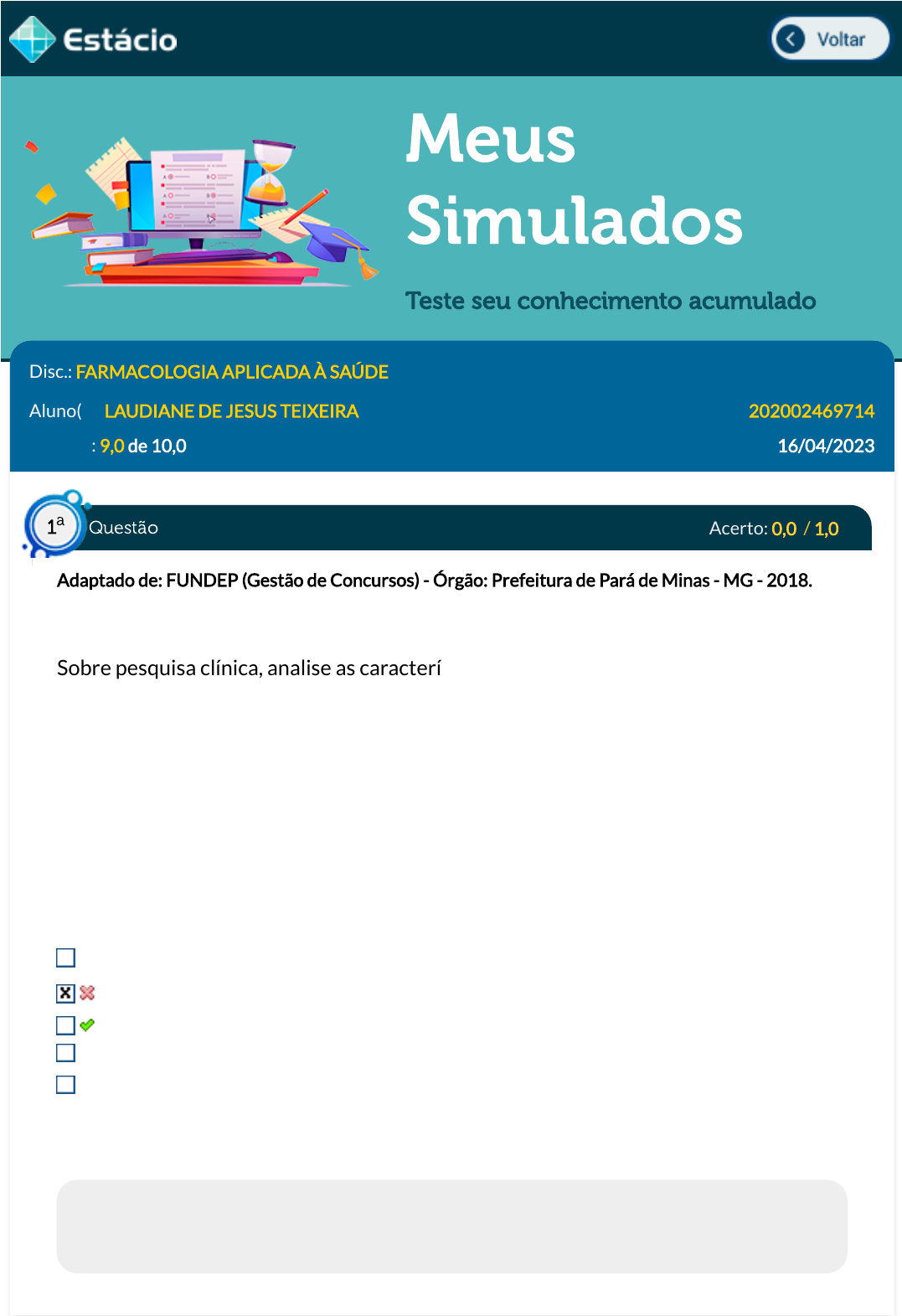 Meus Simulados Teste seu conhecimento acumulado Disc.: FARMACOLOGIA APLICADA À SAÚDE Aluno(a): LAUDIANE DE JESUS TEIXEIRA 202002469714 Acertos: 9,0 de 10,0 16/04/2023 Acerto: 0,0 / 1,0 Adaptado de: FUNDEP (Gestão de Concursos) - Órgão: Prefeitura de Pará de Minas - MG - 2018. Sobre pesquisa clínica, analise as características a seguir. I. Ensaio randomizado e controlado. II. Participação no ensaio de 50 mil indivíduos, sexo masculino e feminino, de 18 a 49 anos de idade. III. Alocação aleatória de indivíduos no grupo controle e no grupo tratamento. IV. O objeto do ensaio é a mensuração da e�cácia e segurança do fármaco. As características relacionadas representam o seguinte tipo de estudo de intervenção: Ensaio Fase I. Ensaio de fase pré-clínica. Ensaio Fase III. Ensaio Fase II. Ensaio Fase IV. Respondido em 16/04/2023 19:03:25 Explicação: A resposta correta é: Ensaio Fase III. Questão1 a https://simulado.estacio.br/alunos/inicio.asp javascript:voltar(); Acerto: 1,0 / 1,0 Medicamentos que apresentam formatos e cores diferentes, assim como a validade do produto, mas que apresentam a mesma e�cácia e segurança, princípio ativo, concentração, via de administração e posologia iguais, são conhecidos como: Medicamentos Biossimilares. Medicamentos de Referência. Medicamentos Similares. Medicamentos Genéricos. Medicamentos Inovadores. Respondido em 16/04/2023 19:12:48 Explicação: Os medicamentos similares contêm mesmo princípio ativo, mesma concentração, forma farmacêutica, via de administração, posologia e indicação terapêutica dos medicamentos de referência, mas podem ser diferentes no tamanho e na forma do produto, no prazo de validade, na embalagem, rotulagem, em excipientes e no veículo e devem sempre ser identi�cados pelo nome comercial (marca). Testes de e�cácia e segurança se fazem necessários para qualquer medicamento. Porém, os estudos de biodisponibilidade relativa e bioequivalência são obrigatórios no caso dos medicamentos classi�cados como tarjados. Acerto: 1,0 / 1,0 Em uma infusão contínua de um fármaco, a concentração no estado de equilíbrio será alcançada quando: A taxa de administração for superior à taxa de eliminação. A taxa e eliminação se igualar à taxa de eliminação. A absorção �nalizar e apenas a eliminação ocorrer. A taxa de eliminação for superior à taxa de administração. Após 1 tempo de meia-vida. Respondido em 16/04/2023 19:12:01 Explicação: A resposta correta é: A taxa e eliminação se igualar à taxa de eliminação. Acerto: 1,0 / 1,0 Questão2 a Questão3 a Questão 4 a Sobre os fármacos laxativos, marque a opção que apresenta a correta relação entre a classe terapêutica e o fármaco de escolha: Agente osmótico - bisacodil. Agente umectante ou emoliente - óleo mineral. Agente estimulante ou irritante - macrogol. Agente osmótico - misoprostol. Agente modulador da motilidade intestinal - lactulose. Respondido em 16/04/2023 19:03:47 Explicação: A resposta correta é: Agente umectante ou emoliente - óleo mineral. Acerto: 1,0 / 1,0 Paciente masculino, pardo, 60 anos, portador de DPOC, há 4 dias com febre não aferida, tosse produtiva com expectoração amarelada e dispneia aos pequenos esforços. O paciente é admitido na UTI para tratamento de pneumonia comunitária grave com vancomicina e amoxicilina-clavulanato. Após 24 horas do referido tratamento o paciente apresenta quadro de intensa vermelhidão nas pernas, braços, barriga, pescoço e face; coceira nas regiões avermelhadas; inchaço aos redor dos olhos; e espasmos musculares. Assinale a opção que melhor representa hipótese diagnóstica e mecanismo: Síndrome do homem vermelho, trombocitopenia induzida por anticorpos. Síndrome de Johnson. Reação ana�lática à vancomicina. Síndrome de Reye, vaso dilatação periférica. Síndrome do homem vermelho, degranulação mastocística. Respondido em 16/04/2023 19:10:25 Explicação: A resposta correta é: Síndrome do homem vermelho, degranulação mastocística. Acerto: 1,0 / 1,0 Sobre a ceftriaxona podemos dizer: Questão5 a Questão6 a É extremamente tóxica e por isto está caindo em desuso. É um exemplo de penicilina com efeito anti-pseudomonas. É um exemplo de cefalosporina de terceira geração e�caz no tratamento de meningite por ter boa penetração pela barreira hemato-encefálica. É uma penicilina anti-MRSA. É uma �uoroquinolona de segunda geração. Muito utilizada no tratamento ambulatorial de infecção urinária não complicada. Respondido em 16/04/2023 19:09:06 Explicação: A resposta correta é: É um exemplo de cefalosporina de terceira geração e�caz no tratamento de meningite por ter boa penetração pela barreira hemato-encefálica. Acerto: 1,0 / 1,0 Um fármaco será considerado mais seguro quando: Seu índice terapêutico for alto e a janela terapêutica estreita Seu índice terapêutico for zero e a janela terapêutica estreita Seu índice terapêutico for baixo e a janela terapêutica estreita Seu índice terapêutico for baixo e a janela terapêutica larga Seu índice terapêutico for alto e a janela terapêutica larga Respondido em 16/04/2023 19:08:21 Explicação: A resposta correta é: Seu índice terapêutico for alto e a janela terapêutica larga Acerto: 1,0 / 1,0 A sobredosagem com drogas de abuso, como anfetaminas e cocaína, pode levar a hipertensão grave por causa de suas ações simpaticomiméticas. Esta hipertensão pode ser controlada pelo uso de qual medicamento? Pralidoxima Ipatrópio Dobutamina Piridostigmina Questão7 a Questão8 a Prazosina Respondido em 16/04/2023 19:07:32 Explicação: A resposta correta é: Prazosina Acerto: 1,0 / 1,0 Em uma situação em que um paciente que está medicado com anticoagulante oral ¿ varfarina e este apresenta uma hemorragia de grande proporção, qual antídoto você prescreveria? concentrado de plaquetas sulfato de protamina plasma fresco vitamina K com