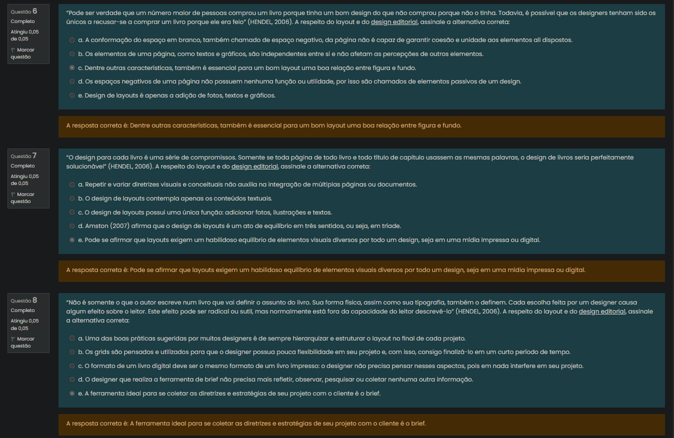 Questão 7 "O design para cada livro é uma série de compromissos. Somente se toda página de todo livro e todo título de capitulo usassem as mesmas palavras, O design de livros seria perfeitamente Completo (HENDEL, 2006). A respeito do layout e do design editorial, assinale a alternativa correta:"