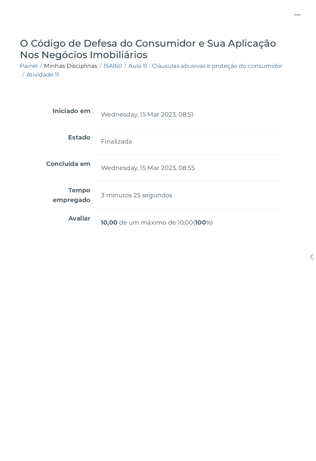 15/03/2023 08:55 Atividade 11 https://ava.politecnicabr.com.br/mod/quiz/review.php?attempt=4551382 1/7 Painel / Minhas Disciplinas / 15A160 / Aula 11 - Cláusulas abusivas e proteção do consumidor / Atividade 11 O Código de Defesa do Consumidor e Sua Aplicação Nos Negócios Imobiliários Iniciado em Wednesday, 15 Mar 2023, 08:51 Estado Finalizada Concluída em Wednesday, 15 Mar 2023, 08:55 Tempo empregado 3 minutos 25 segundos Avaliar 10,00 de um máximo de 10,00(100%) https://ava.politecnicabr.com.br/my/ https://ava.politecnicabr.com.br/course/view.php?id=919 https://ava.politecnicabr.com.br/course/view.php?id=919#section-13 https://ava.politecnicabr.com.br/mod/quiz/view.php?id=31784 https://ava.politecnicabr.com.br/ 15/03/2023 08:55 Atividade 11 https://ava.politecnicabr.com.br/mod/quiz/review.php?attempt=4551382 2/7 Questão 1 Correto Atingiu 2,00 de 2,00 No que diz respeito às normas previstas no CDC que regem a proteção contratual, as cláusulas abusivas e os contratos de adesão, julgue os itens seguintes. O contrato não deve ser invalidado em razão da existência de cláusula abusiva, exceto quando da ausência da cláusula, apesar dos esforços de integração, decorrer ônus excessivo a qualquer das partes. Escolha uma opção: Verdadeiro Falso https://ava.politecnicabr.com.br/ 15/03/2023 08:55 Atividade 11 https://ava.politecnicabr.com.br/mod/quiz/review.php?attempt=4551382 3/7 Questão 2 Correto Atingiu 2,00 de 2,00 Como revelador do movimento do dirigismo contratual, o CDC somente poderia atingir seu objetivo de proteger a parte vulnerável da relação contratual estabelecendo disposições cogentes, de ordem pública, que reduzissem o campo da autonomia da vontade na celebração dos contratos. Como corolário disso, prevê-se a nulidade de pleno direito das cláusulas contratuais abusivas. A respeito dessas cláusulas, julgue os itens subseqüentes. Em matéria de cláusulas abusivas, o CDC enumera hipóteses em que o caráter abusivo estaria con�gurado, adotando, no entanto, um sistema aberto ao admitir outras situações. Escolha uma opção: Verdadeiro Falso https://ava.politecnicabr.com.br/ 15/03/2023 08:55 Atividade 11 https://ava.politecnicabr.com.br/mod/quiz/review.php?attempt=4551382 4/7 Questão 3 Correto Atingiu 2,00 de 2,00 Acerca de direito do consumidor, julgue os itens subsequentes. A cláusula considerada ilícita pela presença de um abuso de direito contratual gera nulidade absoluta e, quando presente dano, a responsabilidade civil do fornecedor ou prestador de serviço. Escolha uma opção: Verdadeiro Falso https://ava.politecnicabr.com.br/ 15/03/2023 08:55 Atividade 11 https://ava.politecnicabr.com.br/mod/quiz/review.php?attempt=4551382 5/7 Questão 4 Correto Atingiu 2,00 de 2,00 Como revelador do movimento do dirigismo contratual, o CDC somente poderia atingir seu objetivo de proteger a parte vulnerável da relação contratual estabelecendo disposições cogentes, de ordem pública, que reduzissem o campo da autonomia da vontade na celebração dos contratos. Como corolário disso, prevê-se a nulidade de pleno direito das cláusulas contratuais abusivas. A respeito dessas cláusulas, julgue os itens subseqüentes. O CDC veda expressamente cláusulas que impossibilitem, exonerem ou atenuem a responsabilidade do fornecedor por vícios de qualquer natureza dos produtos ou serviços. No entanto, essa disposição é mitigada na relação de consumo entre fornecedor e consumidor pessoa jurídica, haja vista que, em determinadas situações, a indenização poderá ser limitada. Escolha uma opção: Verdadeiro Falso https://ava.politecnicabr.com.br/ 15/03/2023 08:55 Atividade 11 https://ava.politecnicabr.com.br/mod/quiz/review.php?attempt=4551382 6/7 Questão 5 Correto Atingiu 2,00 de 2,00 Sobre as cláusulas abusivas à luz do Código de Defesa do Consumidor, é correto a�rmar: Escolha uma opção: a. são assim consideradas aquelas que estabeleçam a inversão do ônus da prova em prejuízo do fornecedor. b. são abusivas as cláusulas que possibilitem a violação de normas ambientais. c. não será considerada abusiva a cláusula que prever solução de controvérsias exclusivamente pela via arbitral. d. as cláusulas contratuais não podem estabelecer qualquer tipo de limitação da indenização ao consumidor, sob pena de serem consideradas abusivas. Entre em Contato https://www.politecnicabr.com.br 0800 084 2627 0800 084 2627 Links Úteis Dicas da nossa Diretora Acadêmica Planner de Estudos Declaração de Matrícula Orientações do AVA Abertura de Ticket Fale com o Tutor Cronograma de Estudos Manual de Estágio Manual de Competência https://www.politecnicabr.com.br/ https://soundcloud.com/user-501638417/sets/escola-politecnica-brasileira https://storage.googleapis.com/sirius-pubstore/semestre_plannerdeestudo%20poli.pdf https://storage.googleapis.com/sirius-pubstore/declaracao_matricula.pdf https://storage.googleapis.com/sirius-pubstore/orientacoes_ava.pdf https://storage.googleapis.com/sirius-pubstore/abertura_ticket.pdf https://storage.googleapis.com/sirius-pubstore/fale_com_tutor.pdf https://storage.googleapis.com/sirius-pubstore/cronograma_estudos.pdf https://storage.googleapis.com/sirius-pubstore/manual_estagio.pdf https://storage.googleapis.com/sirius-pubstore/manual_competencia.pdf https://ava.politecnicabr.com.br/ 15/03/2023 08:55 Atividade 11 https://ava.politecnicabr.com.br/mod/quiz/review.php?attempt=4551382 7/7 © 2022 - Escola Politécnica Brasileira Siga-nos nas redes sociais https://ava.politecnicabr.com.br/mod/quiz/0 https://www.facebook.com/politecnicabr https://www.instagram.com/politecnicabr_oficial https://ava.politecnicabr.com.br/