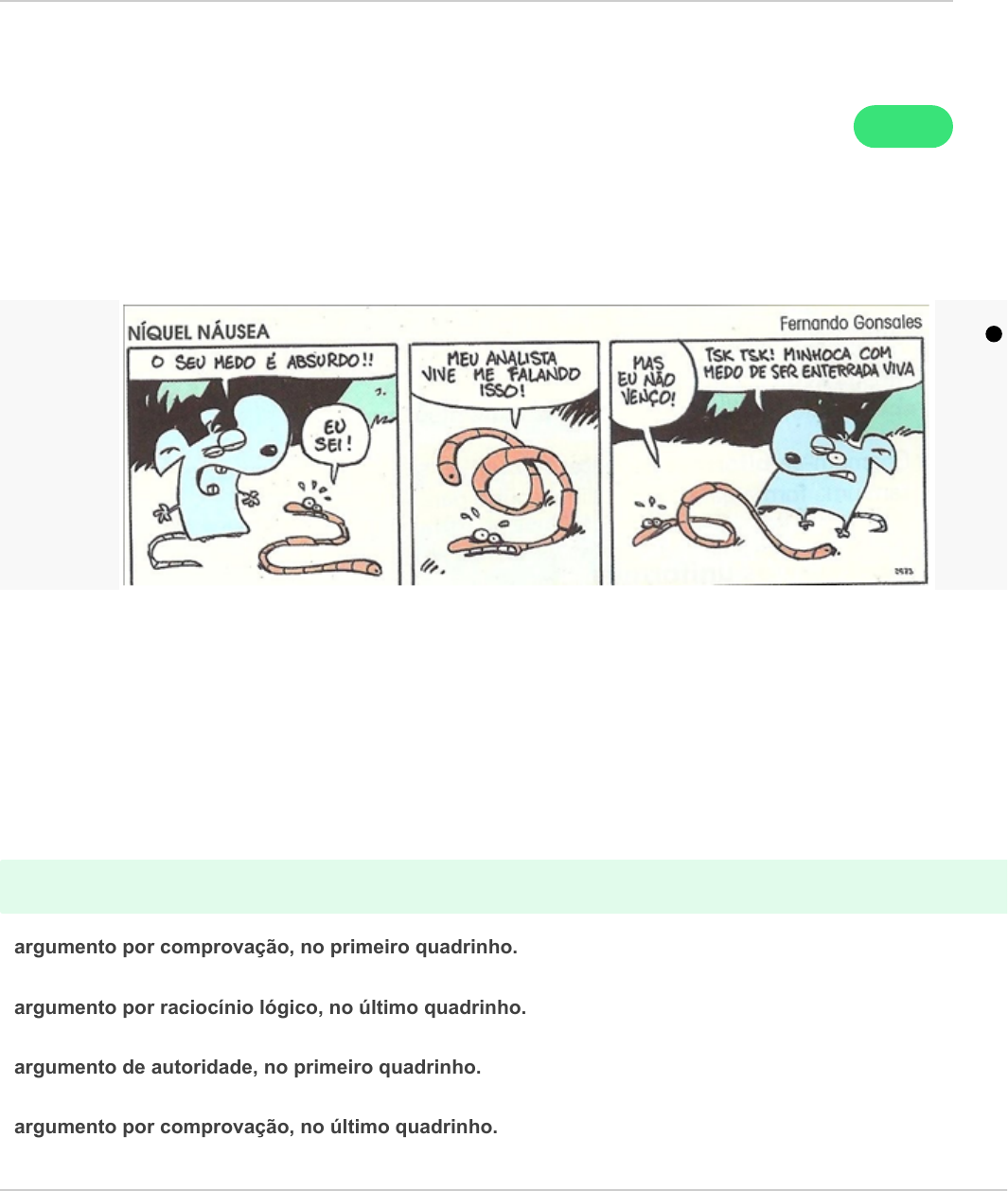 Conteúdo do exercício Ocultar opções de resposta Pergunta 1 1 / 1 Leia a tirinha a seguir: Fonte: GONSALES, F. Níquel Náusea. Disponível em: <https://deposito-de-tirinhas.tumblr.com/post/40380801991/ fernando-gonsales> Acesso em: 14 set. 2019. Apresentar uma argumentação corresponde a apresentar ideias, provas, documentos, alegações, trazendo um raciocínio, uma demonstração que dá base a um ponto de vista. Considerando essas informações e os estudos sobre argumentos, pode-se afirmar que o tipo de argumento usado tirinha é o: Resposta corargumento de autoridade, no segundo quadrinho. argumento por comprovação, no primeiro quadrinho. argumento por raciocínio lógico, no último quadrinho. argumento de autoridade, no primeiro quadrinho. argumento por comprovação, no último quadrinho. Ocultar opções de resposta Pergunta 2 1 / 1 Leia o excerto a seguir: “Tipologia corresponde ao ‘estudo dos traços característicos de um conjunto de dados e determinação dos seus tip ou sistemas’; isso quer dizer que, quando falamos em tipologias textuais, observamos o objetivo, a temática e as marcas linguísticas específicas de cada tipo de texto.” Fonte: TIPOLOGIA. In: Dicionário Infopédia da Língua Portuguesa. Porto: Porto Editora, 2019. Considerando essas informações e o conteúdo estudado sobre tipologias textuais e suas marcas linguísticas, pode afirmar que a descrição é caracterizada por: uso de verbos com valor imperativo, mesmo que não estejam no modo imperativo; uso de pronomes. uso de verbos, advérbios, conjunções, verbos no presente ou no pretérito perfeito do indicativo. uso de operadores discursivos, como conjunções e preposições; modalizadores, verbos no presente do indicativo. Resposta cor uso de substantivos, adjetivos, verbos no presente ou no pretérito imperfeito do modo indicativo. uso de operadores discursivos, expressões denotativas, modalizadores, verbos no futuro. Pergunta 3 1 / 1 Leia o excerto a seguir: “Gênero textual é um conceito geral que engloba textos com características comuns em relação à linguagem, ao conteúdo e à estrutura, utilizados em determinadas situações comunicacionais, orais ou escritas.” Fonte: SARMENTO, L. L. Oficina de Redação. São Paulo: Moderna, 2003. p. 13. Considerando essas informações e os estudos sobre gêneros textuais, analise as tipologias a seguir e associe-as seus respectivos exemplos. 1) descrição. 2) narração. 3) t ã Ocultar opções de resposta ( ) “Coloque o óleo, o açúcar, o leite e o chocolate e bata mais. Coloque a farinha de trigo e o fermento e mistura delicadamente até encorpar. Leve ao forno por cerca de quarenta minutos” (CEREJA, W.; COCHAR, T. Texto e interação. São Paulo: Atual, 2013. p. 83). ( ) “As filmagens começaram e, no fim, o diretor não continha seu entusiasmo. O cachorro magro tinha atuado de forma magnífica. Jogara-se da ponte e, depois de improvisar uma cena dramática de afogamento…” (CAPPARELL 30 fábulas contemporâneas para crianças. Porto Alegre: L&PM, 2008. p. 15). ( ) “Exigir o veloz, o imediato e o sintético, sem ter a consciência de que estes valores são injetados em nossas mentes, é ter a confirmação de que o ‘Panis et circenses’ da Roma antiga é tão contemporâneo quanto o advento globalização” (CEREJA, W.; COCHAR, T. Texto e interação. São Paulo: Atual, 2013. p. 391). ( ) “No meio dos campos de trigo e beterraba, a aldeia dos Deux-Cent-Quarante dormia sob a noite negra. Distingu se vagamente os quatro imensos corpos de pequenas casas encostadas umas às outras” (ZOLA, É. O germinal. In CEREJA, W.; COCHAR, T. Texto e interação. São Paulo: Atual, 2013. p. 34). Agora, assinale a alternativa que apresenta a sequência correta: Resposta cor4, 2, 3, 1. 3, 2, 1, 4. 2, 4, 2, 3. 1, 2, 3, 4. 4, 1, 3, 2. Pergunta 4 1 / 1 Leia o excerto a seguir: “Eu e minha prima éramos duas jovens estudantes, eu estudava Direito e ela, Medicina; chegamos à noite a uma v pensão, a dona era uma velha balofa, de peruca mais negra que a asa da graúna, alugou-nos um quarto. Logo descobrimos pequenos ossos de um anão, ali deixados pelo antigo morador, o fato despertou grande interesse em minha prima. Enquanto discutíamos se daríamos fim aos ossinhos, percebemos um cheiro diferente no quarto e, à noite, apareceram formigas que se dirigiam ao caixote de ossos. O fato de repetia e, aos poucos, o corpo do anão era recomposto por elas. Na última noite em que passamos na velha casa, minha prima percebeu que as formigas haviam completado seu ‘trabalho’: ‘O esqueleto está inteiro, só falta o fêmur’. Aterrorizadas, fugimos, abandonando a casa.” Fonte: TELLES, L. F. As formigas. In: Seminário dos ratos. 6. ed. São Paulo: Nova Fronteira, 1998. (Adaptado). Ocultar opções de resposta Parte dos textos que pertencem à tipologia narrativa apresentam enredo, isto é, suas histórias dividem-se em situa inicial, conflito, complicação, clímax e desfecho. Assim, considerando as informações dadas, o trecho narrativo, e o estudos sobre gêneros textuais e a estrutura do enredo, analise os elementos a seguir e associe-os com as informações do trecho. 1) Situação inicial. 2) Conflito. 3) Complicação. 4) Clímax. 5) Desfecho. ( ) Acontecer a fuga. ( ) Aparecer um cheiro diferente no quarto e o aparecimento das formigas. ( ) Encontrar pequenos ossos de um anão. ( ) Ocorrer a recomposição do esqueleto até a falta de um osso. ( ) Chegar à pensão, encontrar a velha, alugar um quarto. Agora, assinale a alternativa que apresenta a sequência correta: 1, 4, 5, 3, 2. Resposta cor5, 3, 2, 4, 1. 2, 3, 4, 5, 1. 4, 1, 3, 2, 5. 3, 5, 1, 2, 4. Pergunta 5 1 / 1 Quanto às intenções comunicativas como usuários da língua, podemos relatar, informar, descrever, argumentar ou orientar; para isso, fazemos escolhas entre as estruturas textuais que melhor atendem a nossos objetivos. Considerando o excerto e o conte