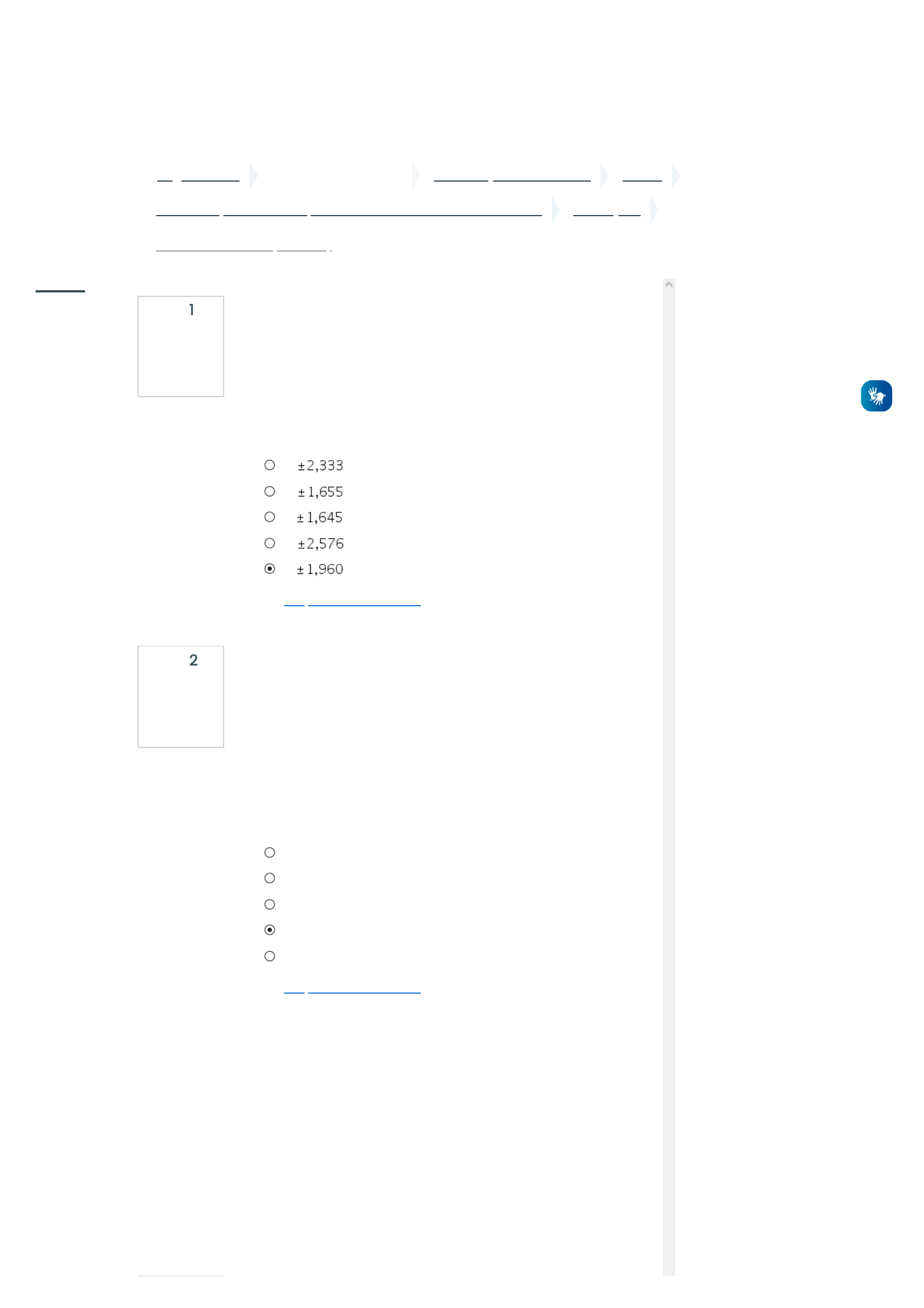 02/05/2022 20:38 P2 - Prova On-line (Acessar) https://ava.candidomendes.edu.br/moodle/mod/quiz/attempt.php?attempt=197928&cmid=283303 1/5 ... Página inicial Disciplinas e Espaços GRADUAÇÃO A DISTÂNCIA 2022-1 Métodos Quantitativos Aplicados a Gestão II - 2022_01_EAD_A Avaliações P2 - Prova On-line (Acessar) Questão 1 Ainda não respondida Vale 1,00 ponto(s). Questão 2 Ainda não respondida Vale 1,00 ponto(s). Para determinarmos um intervalo com α = 5% de nível de significância (erro), considerando uma amostra com 40 elementos e conhecido o Desvio Padrão Populacional, utilizaremos um valor de escore (Desvio Reduzido) determinado na Tabela de Distribuição Normal. O valor desse escore é: Escolha uma opção: a. b. c. d. e. Limpar minha escolha Num teste de inteligência aplicado a um grupo de 80 pessoas, considerou-se uma distribuição aproximadamente Normal com Média de 50 pontos e Desvio Padrão 6 pontos. Solicitou-se que fosse determinada a proporção de pessoas que alcançou notas superiores a 60 pontos. O que resultou numa proporção de 4,75%. O processo utilizado para determinar essa proporção a partir da nota dada é chamado de: Escolha uma opção: a. "Volta" b. "Ida e Volta" c. "Binomial" d. "Ida" e. "Poisson" Limpar minha escolha https://ava.candidomendes.edu.br/moodle/ https://ava.candidomendes.edu.br/moodle/course/index.php?categoryid=8 https://ava.candidomendes.edu.br/moodle/course/index.php?categoryid=110 https://ava.candidomendes.edu.br/moodle/course/view.php?id=8764 https://ava.candidomendes.edu.br/moodle/course/view.php?id=8764§ion=4 https://ava.candidomendes.edu.br/moodle/mod/quiz/view.php?id=283303 https://ava.candidomendes.edu.br/moodle/mod/quiz/attempt.php?attempt=197928&cmid=283303 https://ava.candidomendes.edu.br/moodle/mod/quiz/attempt.php?attempt=197928&cmid=283303 javascript:void(0); https://ava.candidomendes.edu.br/moodle/user/index.php?id=8764 https://ava.candidomendes.edu.br/moodle/grade/report/index.php?id=8764 https://ava.candidomendes.edu.br/moodle/course/view.php?id=8764&stopjsnav=1 https://ava.candidomendes.edu.br/moodle/course/view.php?id=8764&datapref=1 https://ava.candidomendes.edu.br/moodle/ https://ava.candidomendes.edu.br/moodle/my/ https://ava.candidomendes.edu.br/moodle/course/view.php?id=892 javascript:void(0); 02/05/2022 20:38 P2 - Prova On-line (Acessar) https://ava.candidomendes.edu.br/moodle/mod/quiz/attempt.php?attempt=197928&cmid=283303 2/5 Questão 3 Ainda não respondida Vale 1,00 ponto(s). Questão 4 Ainda não respondida Vale 1,00 ponto(s). Questão 5 Ainda não respondida Vale 1,00 ponto(s). Considerando a Resolução 886/66 do IBGE, que normatiza os arredondamentos de dados realizados nos Estudos Estatísticos no Território Nacional, podemos afirmar que o número 24,50001, sendo aproximado para a sua unidade mais próxima, ficará representado por: Escolha uma opção: a. 25 b. 23 c. 26 d. 24 e. 24,0 Limpar minha escolha Após verificações anteriores, um Fábrica de Pilhas observou que seu produto apresentava uma Vida Útil Média de 500 horas, com Desvio Padrão de 100 horas, supondo que esse estudo apresente uma Distribuição Normal, a resistência máxima (dada em horas) de 75% das pilhas produzidas pela fábrica, é de: Escolha uma opção: a. 577 horas b. 433 horas c. 588 horas d. 567 horas e. 576 horas Limpar minha escolha Cinco porcento dos blocos de cimento produzidos por uma fábrica apresentaram-se com defeitos em sua estrutura. Foi realizado um estudo numa amostra de dez desses blocos. A probabilidade de exatamente dois deles apresentarem defeito é de: Escolha uma opção: a. 20,03% b. 15,50% c. 6,74% d. 7,46% e. 10,12% Limpar minha escolha https://ava.candidomendes.edu.br/moodle/mod/quiz/attempt.php?attempt=197928&cmid=283303 https://ava.candidomendes.edu.br/moodle/mod/quiz/attempt.php?attempt=197928&cmid=283303 https://ava.candidomendes.edu.br/moodle/mod/quiz/attempt.php?attempt=197928&cmid=283303 javascript:void(0); https://ava.candidomendes.edu.br/moodle/user/index.php?id=8764 https://ava.candidomendes.edu.br/moodle/grade/report/index.php?id=8764 https://ava.candidomendes.edu.br/moodle/course/view.php?id=8764&stopjsnav=1 https://ava.candidomendes.edu.br/moodle/course/view.php?id=8764&datapref=1 https://ava.candidomendes.edu.br/moodle/ https://ava.candidomendes.edu.br/moodle/my/ https://ava.candidomendes.edu.br/moodle/course/view.php?id=892 javascript:void(0); 02/05/2022 20:38 P2 - Prova On-line (Acessar) https://ava.candidomendes.edu.br/moodle/mod/quiz/attempt.php?attempt=197928&cmid=283303 3/5 Questão 6 Ainda não respondida Vale 1,00 ponto(s). Ao serem lançados simultaneamente, dois dados diferentes e não viciados, a probabilidade de que a soma dos valores das faces voltadas para cima seja igual a cinco é de: Escolha uma opção: a. 16,66% b. 16,67% c. 83,33% d. 11,11% e. 12,22% Limpar minha escolha https://ava.candidomendes.edu.br/moodle/mod/quiz/attempt.php?attempt=197928&cmid=283303 javascript:void(0); https://ava.candidomendes.edu.br/moodle/user/index.php?id=8764 https://ava.candidomendes.edu.br/moodle/grade/report/index.php?id=8764 https://ava.candidomendes.edu.br/moodle/course/view.php?id=8764&stopjsnav=1 https://ava.candidomendes.edu.br/moodle/course/view.php?id=8764&datapref=1 https://ava.candidomendes.edu.br/moodle/ https://ava.candidomendes.edu.br/moodle/my/ https://ava.candidomendes.edu.br/moodle/course/view.php?id=892 javascript:void(0); 02/05/2022 20:38 P2 - Prova On-line (Acessar) https://ava.candidomendes.edu.br/moodle/mod/quiz/attempt.php?attempt=197928&cmid=283303 4/5 Questão 7 Ainda não respondida Vale 2,00 ponto(s). O tempo que os alunos de uma turma gastam para fazer uma avaliação de estatística é normalmente distribuído com média de 72 minutos e desvio-padrão de 5 minutos. Determine a probabilidade de um aluno escolhido ao acaso gastar menos de 75 minutos na realização desta avaliação. Tamanho máximo para arquivos: 1Gb, número máximo de anexos: 1 Arqu