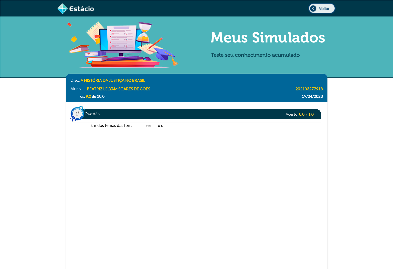 Meus Simulados Teste seu conhecimento acumulado Disc.: A HISTÓRIA DA JUSTIÇA NO BRASIL Aluno(a): BEATRIZ LELYAM SOARES DE GÓES 202103277918 Acertos: 9,0 de 10,0 19/04/2023 Acerto: 0,0 / 1,0 Ao tratar dos temas das fontes do direito ou do controle da constitucionalidade das leis, Hespanha vê o grupo de juristas como participante da luta política, na luta pelo poder de dizer o direito: "A questão da criação do direito (ou da legitimação de normas de comportamento como normas jurídicas) tinha ganho, no século XIX, uma nova centralidade, em virtude do destaque dado a princípios como o de primado do direito ou de Estado de direito." HESPANHA, António Manuel. Um poder pouco mais que simbólico: juristas e legisladores em luta pelo poder de dizer o direito. Curitiba: Juruá Editora, 2008. p. 151. Sobre o processo de consolidação dessa nova con�guração do campo jurídico brasileiro no período do século XVIII da colônia, veja as a�rmações a seguir. I. A consolidação do Estado de direito se dá pelo aprimoramento das estruturas políticas coloniais, seu afastamento das normas religiosas, fruto da secularização do poder, em curso desde os meados do século XVIII. II. Os juristas acolhem a doutrina de que mais importante é a vontade de quem ordena e não o conselho de quem dispõe da autoridade do saber, reforçando a supremacia da autoridade das maiorias parlamentares e a autoridade do rei. Questão1 a https://simulado.estacio.br/alunos/inicio.asp javascript:voltar(); III. Uma vez que o Estado tinha novas estruturas jurídicas com a mudança para o Rio, sem a perda de prestígio de Salvador, é notório que a política tinha que obedecer aos processos jurídicos. Os campos político e jurídico aparecem largamente sobrepostos, como lugar das lutas simbólicas pela apropriação da competência de constituir direito, como visto na Conjuração Baiana. Agora assinale a alternativa correta. I e III I apenas II e III I e II II apenas Respondido em 19/04/2023 13:17:27 Explicação: A resposta correta é; I e III Acerto: 1,0 / 1,0 O processo de conquista-colonização europeia na América não só forjou novos espaços de poder e dominação, como também atuou nas �ssuras das relações já estabelecidas e reforçou ideias parcialmente desenvolvidas nas relações de poder entre os próprios povos do continente. Pesquisas apontam que ideias dicotômicas, como os povos das "terras altas" dos Andes serem mais desenvolvidos e re�nados, e os povos das "terras baixas" na costa leste serem inferiores, "sem fé, sem lei, sem rei", estiveram presentes em alguns dos primeiros relatos europeus, mas também foram parcialmente desenvolvidas no próprio período anterior à chegada dos europeus. Entre as medidas que jurídico-administrativamente ignoravam a necessidade de debater a presença ameríndia, podemos citar: I. Ordenações Manoelinas II. Distribuição de Sesmaria e Capitanias Hereditárias III. Direito a Livre escravização Agora assinale a alternativa correta. I apenas Questão2 a I e III II e III I e II II apenas Respondido em 19/04/2023 12:42:54 Explicação: A resposta correta é: I e II Acerto: 1,0 / 1,0 Sobre a tensão relacional entre o direito laico e o direito canônico no Brasil podemos a�rmar que: O direito canônico e o direito aristocrático têm origens na colonização brasileira, sendo um arranjo local. O direito canônico predomina na justiça brasileira durante o período imperial. O direito canônico é entendido como um inimigo do direito laico. A laicização do direito foi inicializada com o Império e �nalizada na República. O direito canônico in�uencia a institucionalização jurídica brasileira. Respondido em 19/04/2023 12:49:50 Explicação: A resposta correta é: O direito canônico in�uencia a institucionalização jurídica brasileira. Acerto: 1,0 / 1,0 A escravidão no Brasil, em termos jurídicos, pode ser corretamente associada a: Luta de classes, com os trabalhadores escravos lutando por direitos. Crise religiosa, que via na escravidão uma ofensa. Uma mudança articulada pela aristocracia e quem tem �m por obras da princesa Isabel. Manutenção do status �nanceiro e garantia da propriedade privada. A compra de alforrias como um processo jurídico. Respondido em 19/04/2023 12:51:28 Questão3 a Questão4 a Explicação: A resposta correta é: Manutenção do status �nanceiro e garantia da propriedade privada. Acerto: 1,0 / 1,0 (FCC/2018) Referindo-se à Constituição de 1891, José Afonso da Silva faz o seguinte comentário: "O coronelismo fora o poder real e efetivo, a despeito de as normas constitucionais traçarem esquemas formais da organização nacional com teoria e divisão de poderes e tudo. A relação de forças dos coronéis elegia os governadores, os deputados e os senadores. Os governadores impunham o presidente da República. Nesse jogo, os deputados e senadores dependiam da liderança dos governadores. Tudo isso forma uma Constituição material em desconsonância com o esquema normativo da Constituição então vigente e tão bem estruturada formalmente". (Curso de direito constitucional positivo . São Paulo: Malheiros, 2008. p. 80) Ao retratar a distância entre os preceitos constitucionais e a política real, o texto permite considerar que o coronelismo prevaleceu na política após a proclamação da Republica. Sobre o tema abordado é correto a�rmar que: na federação instituída pela Constituição de 1891, para não haver con�itos entre as diversas esferas do poder estadual foi estimulada a participação das forças militares municipais, controladas por seus coronéis, por representarem o maior poder local. a relação direta entre os poderes locais, submetidos às práticas coronelísticas, impediu que representantes de São Paulo exercessem a presidência da República nas primeiras décadas após sua instauração. o constitucionalismo republicano cumpriu suas funções essenciais, isto 