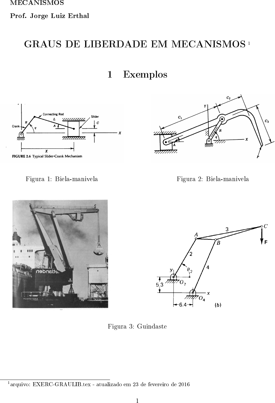 MECANISMOS Prof. Jorge Luiz Erthal GRAUS DE LIBERDADE EM MECANISMOS 1 1 Exemplos Figura 1: Biela-manivela Figura 2: Biela-manivela Figura 3: Guindaste 1arquivo: EXERC-GRAULIB.tex - atualizado em 23 de fevereiro de 2016 1 Figura 4: Mini Pá-Carregadeira Figura 5: Caçamba Figura 6: Suspensão de braços sobrepostos 2 2 Exercícios Calcular o número de graus de liberdade dos mecanismos a seguir: Figura 7: Bomba mecânica Figura 8: Hidrante Figura 9: Capô do motor Figura 10: Cadeia composta (a) 3 Figura 11: Cadeia composta (b) Figura 12: Elos deslizantes Figura 13: Caixa maluca Figura 14: Plaina 4 Figura 15: Retorno rápido Figura 16: Retroescavadeira Figura 17: Mecanismo ou treliça? 5 3 Respostas Fig. 7: 1 g.l. Fig. 8: 1 g.l. (Clamping Screw apertado), 2 g.l. (Clamping Screw solto) Fig. 9: 1 g.l. Fig. 10: 4 g.l. Fig. 11: 2 g.l. Fig. 12: 2 g.l. Fig. 13: 1 g.l. Fig. 14: 1 g.l. Fig. 15: 1 g.l. Fig. 16: 3 g.l. Fig. 17: a) 0 g.l; b) 1 g.l. 6 Exemplos Exercícios Respostas