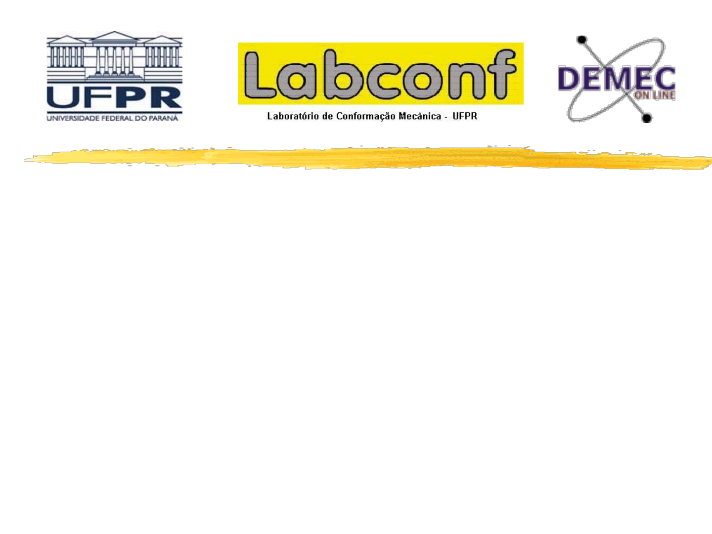 Laminação Prof. Paulo Marcondes, PhD. DEMEC / UFPR Laminador de preparação Cilindros para obteção de perfis laminados Laminação O objetivo é mudar a seção transversal (geralmente reduzir) Tipos de produtos: Planos • Placas e chapas Não planos • Barras, peris, trilhos, vergalhões, tubos, etc. • Para desbaste – aço carbono e aços-liga • Para trabalhos intermediários – aços liga e ferro fundido; • Para acabamento – ferro fundido de diversos tipos. Material dos rolos. Laminação Típico laminador duo com cilindro regulável durante a operação Partes de um cilidro de laminação Cilindros de um laminador fixo durante a operação com abertura variável ao longo de seucomprimento Trem de laminação Cadeira de Laminação Trem de laminação • Conjunto de cadeiras • Laminação a quente e a frio • Laminadores primários ou de desbaste • Laminadores secundários os de acabamento • Classificação das cadeiras quanto ao número e disposição dos cilindros Determine o percentual total de redução do processo %20100 10 510 100% xx t tt o fo %68100 5 6,15 % x Correto %84100 10 6,110 100% xx t tt o fo 50% Laminação Laminação Duo Laminação Trio 1 2 3 4 6 5 DESENROLADEIRA ENROLADEIRA#1 ENROLADEIRA#2 7 8 ROLO PUXADOR/NIVELADOR ROLO MEDIDOR APLAINAMENTO MEDIDOR DE ESPESSURA PRENSA AJUSTE DE PASS-LINE MEDIDOR DE VELOCIDADE 11 11 9 PARAFUSO HIDRÁULICO 10 REFRIGERAÇÃO SELETIVA 11 LRF - LAMINADOR REVERSÍVEL A FRIO CONTROLE DE ESPESSURA - AGC MEDIDOR DE VELOCIDADE 01 MEDIDOR DE VELOCIDADE 02 MEDIDOR DE ESPESSURA 02 MEDIDOR DE ESPESSURA 01 ROLO MEDIDOR DE TENSÃO 01 ROLO MEDIDOR DE TENSÃO 02 LRF - LAMINADOR REVERSÍVEL A FRIO Se as laterais estiverem livres para se mover a porção do centro da chapa é tracionada e as laterais são comprimidas na direção de laminação. O resultado será uma lateral ondulada ou flambada. A solução: • Cilindro mais largo no centro do que nas beiradas; • Cilindro apresentando um abaulamento e • Macaco hidráulico • Corrigir a deformação elástica dos cilindros. Obs. Se o cilindro tem uma deflexão convexa excessiva o centro da chapa será mais alongado do que nas laterais. A distribuição de tensões é oposta e a chapa é dita ter centro livre e laterais presas. Deflexão Côncava dos Cilindros Possíveis defeitos em laminação com insuficiente “camber” Com a diminuição da espessura as beiradas sofrem um alargamento lateral • Arredondamento no seu final e começo de laminação As faixas laterais se alongam menos do que o centro e ficam submetidas a tensões secundárias trativas. Em casos severos pode ocorrer: • Fendilhamento (trincamento das bordas) e • Fissuras rabo de peixe. Defeitos resultantes do alargamento lateral Deflexão Convexa dos Cilindros Possíveis defeitos em laminação com laminadores “over-cambeder” Laminação Edge distribution resulting from rolling with (a) light reduction, (b) heavy reduction and (c) allingatoring. Se existe algum defeito metalúrgico ao longo da linha central do tarugo a fratura é do tipo boca de jacaré • é acentuada se ocorre qualquer empenamento da chapa. Com redução severas presentes: • bordas embarriladas As tensões de tração secundárias criadas pelo embarrilamento são a causa real do aparecimento das trincas de beira ou borda. As trincas de bordas são minimizados utilizando: • cilindros verticais; • usinar as bordas para a forma quadrada depois de cada passe; • barras de restrição da borda da chapa e • enlatamento das bordas em ambos os lados com um material que apresente tensão de escoamento similar a peça. (a) Representação esquemática do processo de conformação em laminadores de dobra usados para converter chapas ou placas em tubos. (b) Algumas formas típicas produzidas por esse processo. Laminador seqüencial de perfis Tubos – ‘Roll Forming’ Cilindro de laminação Representação esquemática das aberturas dos cilindros de um laminador trio para a produção de blocos e tarugos de aço Laminação de barra de seção quadrada e perfil U Laminação Perfil I Sequência I Sequência II Passes para produção de perfilados em U e em L de aço Perfis laminados Manufatura de tubos Pipe blank piercing, λ=1.3 to 5 Endireitadores Straightening rolled stock in roller (a) and cross roll (b), straightteners Pipe rolling in continuous mill 1-round and oval pass rolls; 2 –blanks; 3 - mandrel Relações geométricas na laminação de planos Dado que R >> hi Arco de contato ~ L 22 ) 2 ( h RRL 2 4 h hRL hRL ou 2 – Ângulo de contato R h R hR R L sen Se α pequeno = R h 1 – Arco de contato 4 – Deformação logarítmica 3 – Deformação convencional Para um ponto genérico de altura h, admitindo deformação homogênea na espessura: hi h hi hhi e 1 e hi hi 1 1 lnln ehi h e hi h 1 1 lnln1 Relações geométricas na laminação de planos 6 – Condições de mordida e arrastamento da chapa pelos cilindros de laminação N = Força normal ao cilindro T = Força de atrito (tangente) Para que exista arraste: Notas: • α cresce com o passe, logo pode ser necessário para certos passes aumentar o atrito ou adicionar força seguindo a direção x • a condição limite μ = tgα, pode ser estimada para ângulos α pequenos: R h tgsen R hmax2 logo Rh 2max • a condição limite μ = tgα, é pessimista: (não considera deformação plástica no ponto de contato) • Obviamente, uma vez que a chapa foi arrastada, as condições dentro do arco de contato levam a estabilidade assegurando o processo contínuo. Fx > 0 Tcosα – Nsenα > 0 Se atrito coulombiano: T=μN N(μcosα – senα) > 0 μcosα – senα > 0 μ > tg α 7 – Ângulo Neutro (ou de deslocamento nulo) Relações geométricas na laminação de planos Fatos: (a) V saída > V periférica (b) V entrada < V periférica (c) Deve então existir um plano onde: V chapa = V periférica Este plano é chamado de plano “neutro”. (d) As forças de atrito