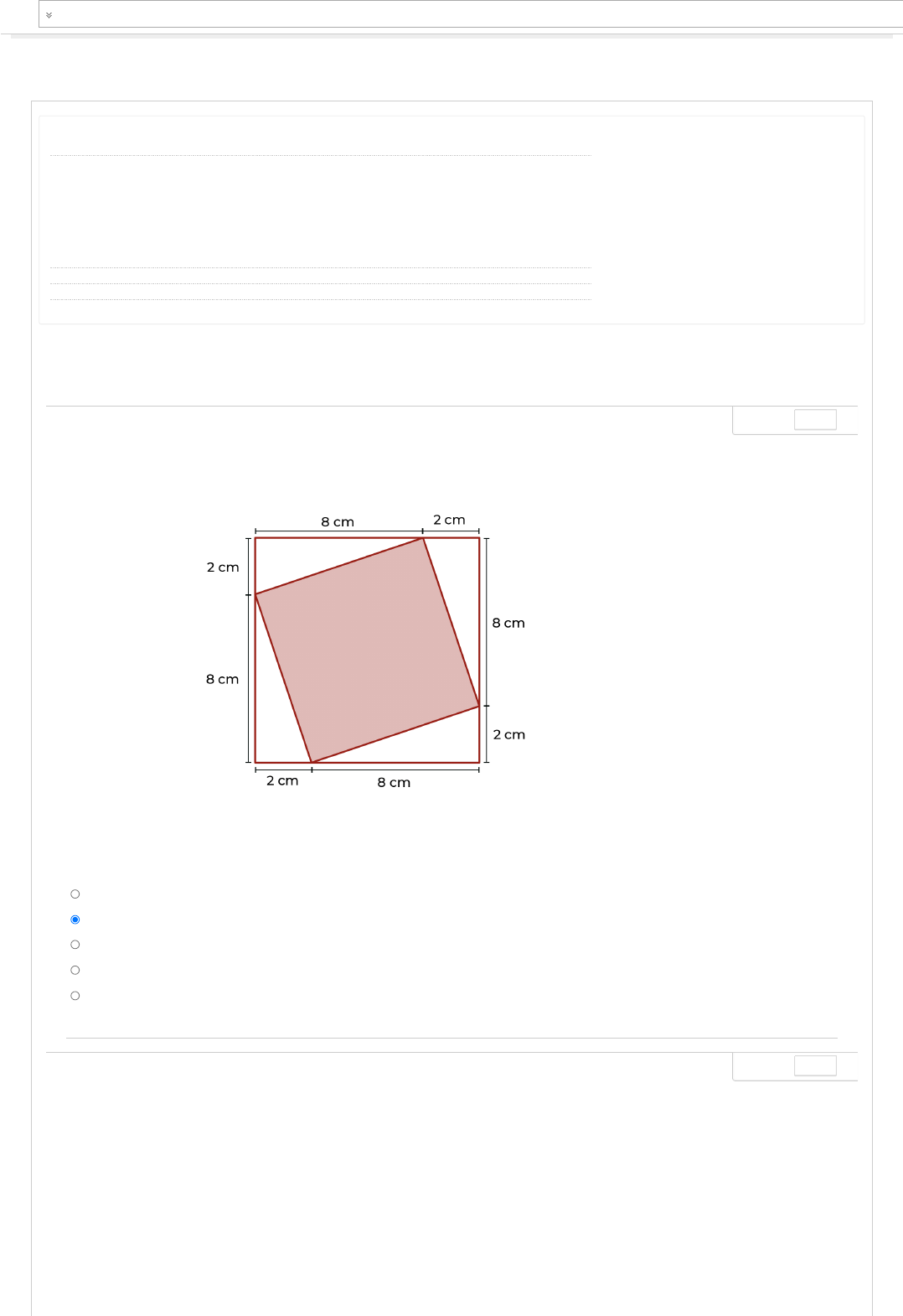 19/04/2023, 15:58 Fazer teste: Semana 1 - Atividade Avaliativa – Geometria... https://ava.univesp.br/ultra/courses/_8458_1/cl/outline 1/3 Fazer teste: Semana 1 - Atividade AvaliativaGeometria Espacial - MGE001 - Turma 001 Atividades Fazer teste: Semana 1 - Atividade Avaliativa Informações do teste Descrição Instruções Várias tentativas Este teste permite 3 tentativas. Esta é a tentativa número 1. Forçar conclusão Este teste pode ser salvo e retomado posteriormente. Suas respostas foram salvas automaticamente. 1. Para responder a esta atividade, selecione a(s) alternativa(s) que você considerar correta(s); 2. Após selecionar a resposta correta em todas as questões, vá até o fim da página e pressione “Enviar teste”. 3. A cada tentativa, você receberá um conjunto diferente de questões. Olá, estudante! Pronto! Sua atividade já está registrada no AVA. a. b. c. d. e. PERGUNTA 1 Considere a figura a seguir, na qual são apresentados dois quadrados, sendo um deles (sombreado) inscrito no outro de acordo com as medidas descritas. Fonte: Elaborada pelo autor. Determine a área do quadrado sombreado. 70 cm2. 68 cm2. 72 cm2. 76 cm2. 74 cm2. 2,5 pontos Salva PERGUNTA 2 Há um hexágono regular inscrito em um círculo de centro . Sabe-se que o raio desse círculo mede . Há, também, uma região sombreada (destacada). 2,5 pontos Salva ? Estado de Conclusão da Pergunta: https://ava.univesp.br/webapps/blackboard/execute/courseMain?course_id=_8458_1 https://ava.univesp.br/webapps/blackboard/content/listContent.jsp?course_id=_8458_1&content_id=_1288679_1&mode=reset 19/04/2023, 15:58 Fazer teste: Semana 1 - Atividade Avaliativa – Geometria... https://ava.univesp.br/ultra/courses/_8458_1/cl/outline 2/3 a. b. c. d. e. Fonte: Elaborada pelo autor. Nessas condições, determine, em cm2, a medida da área da região sombreada. 15 3 + 10π 15 2 − 10π 10π + 15 3 10π − 15 3 15 3 − 10π a. b. c. d. e. PERGUNTA 3 Considere uma praça circular de 10 m de raio que será coberta de grama pela prefeitura. Para ganhar tempo, o representante do bairro em que será executado o serviço calculou a área a ser coberta de grama e considerou π = 3. Nessas condições, a área da praça é: 3 000 m2; 3 m2; 30 m2; 300 m2; 15 m2. 2,5 pontos Salva PERGUNTA 4 Há um trapézio ABCD no qual a base maior mede a (AB = a), e a base menor mede b (CD = b). Sabemos que a > b e que a altura do trapézio mede h , conforme ilustrado na figura abaixo. Fonte: Elaborada pelo autor. Esses triângulos têm por bases AB e CD respectivamente e por vértice oposto a intersecção das diagonais Sendo 2,5 pontos Salva 19/04/2023, 15:58 Fazer teste: Semana 1 - Atividade Avaliativa – Geometria... https://ava.univesp.br/ultra/courses/_8458_1/cl/outline 3/3 Clique em Salvar e Enviar para salvar e enviar. Clique em Salvar todas as respostas para salvar todas as respostas. a. b. c. d. e. Esses triângulos têm por bases AB e CD, respectivamente, e por vértice oposto a intersecção das diagonais. Sendo assim, desenvolva a diferença entre as áreas desses triângulos. (a − b ) ⋅ h 2 (h − b ) ⋅ a 2 (a − h ) ⋅ b 2 (a + b ) ⋅ h 2 (a + h ) ⋅ b 2 Salvar todas as respostas Salvar e Enviar
