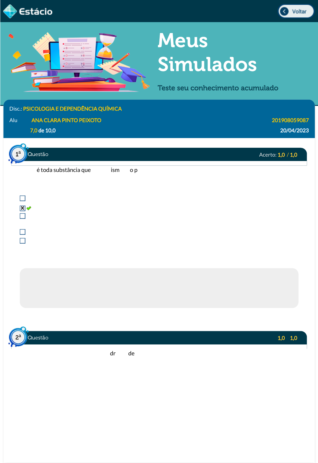 20/04/2023, 13:08 Estácio: Alunos https://simulado.estacio.br/alunos/ 1/6 Meus Simulados Teste seu conhecimento acumulado Disc.: PSICOLOGIA E DEPENDÊNCIA QUÍMICA Aluno(a): ANA CLARA PINTO PEIXOTO 201908059087 Acertos: 7,0 de 10,0 20/04/2023 Acerto: 1,0 / 1,0 Droga é toda substância que o organismo não produz, mas que ao entrar em contato com ele, tem a capacidade de modi�car o funcionamento de um ou mais sistemas orgânicos. Denomina-se como substância psicoativa aquela que produz alteração no sistema urinário, aumentando a micção. altera o funcionamento cerebral e modi�ca o humor, a consciência e a cognição. ao entrar em contato com o corpo produz alteração no aparelho digestivo alterando a atividade do estômago. altera o sistema cardiovascular e altera batimentos cardíacos, pressão arterial e incursões respiratórias. altera o sistema endócrino e aumenta os níveis de glicose. Respondido em 20/04/2023 12:13:19 Explicação: As SPAs têm tropismo pelo cérebro e atuam na modi�cação de seu funcionamento. Uma substância psicoativa tem ação no SNC, portanto, não atua no aparelho digestivo , nem no sistema urinário, não tem ação direta no sistema cardiorrespiratório,, nem no sistema endócrino. Acerto: 1,0 / 1,0 O avanço da ciência permitiu que as drogas deixassem de ter um aparato de curandeirismo quando foram sintetizadas em laboratórios e passaram a ter um uso medicinal, ligado a pesquisas e prescrições médicas. Sobre as drogas e seus efeitos, analise as a�rmativas abaixo: I) Os barbitúricos tinham o consumo difundido com a �nalidade de induzir o sono na década de 50, mas foi suspenso quando associado a algumas tentativas de suicídio. II) As anfetaminas têm efeito antidepressivos porque são drogas de ação estimulante do SNC. III) Os benzodiazepínicos substituíram as anfetaminas no tratamento da depressão nos anos 60. IV) Os barbitúricos são drogas que diminuem a ansiedade, a fome e o cansaço. Estão corretas as a�rmativas: Questão1 a Questão2 a https://simulado.estacio.br/alunos/inicio.asp javascript:voltar(); 20/04/2023, 13:08 Estácio: Alunos https://simulado.estacio.br/alunos/ 2/6 II, IV I, IV II, III III, IV I, II Respondido em 20/04/2023 12:16:01 Explicação: Os barbitúricos eram drogas usadas para manter o sono, mas tiveram o uso suspenso por causa de casos de suicídio em pessoas que faziam uso da droga. As anfetaminas são estimulantes do SNC e diminuem a fome e o cansaço. Os Benzodiazepínicos são usados no tratamento da ansiedade. Acerto: 1,0 / 1,0 O movimento hippie, nos anos 60, pregava a vida em comunidade e trazia como lemas: ¿"aça amor não faça guerra" e "paz e amor". Além disso, pregavam o uso de drogas como haxixe, maconha, LSD e cogumelos, argumentando que as drogas alucinógenas facilitavam experiências místicas, mas não permitiam o aumento da capacidade de alterar a realidade. as drogas estimulantes permitiam que pudessem trabalhar com mais resistência e facilitavam o sono. as drogas alucinógenas aumentavam a capacidade criativa e alteravam a percepção da realidade. as drogas psicodélicas aumentavam a capacidade física e alteravam a percepção da realidade. as drogas depressoras ajudavam a conciliar o sono e permitiam experiências místicas mais intensas. Respondido em 20/04/2023 12:16:21 Explicação: As drogas alucinógenas eram as preferidas e mais usadas nos movimentos hippies porque entendiam que a capacidade criativa aumentava e a percepção da realidade era alterada. As drogas psicodélicas não aumentam a capacidade física (opção B). As drogas alucinógenas alteram a percepção da realidade. As drogas estimulantes não induzem ao sono. As drogas depressoras não alteram a capacidade de experiências místicas. Acerto: 0,0 / 1,0 Durante o processo de tratamento da dependência química o indivíduo pode passar pelo estágio em que há uma ambivalência de pensamento. Nessa fase, ele já admite um consumo excessivo e quer parar. Entretanto, em outros momentos alega que consegue parar se e quando quiser e que por isso não há necessidade de interromper o consumo. Assinale a opção que indica como essa fase é conhecida. fase da manutenção. fase da contemplação. fase de pré-contemplação. fase da determinação. fase da ação. Respondido em 20/04/2023 12:27:00 Explicação: Questão3 a Questão4 a 20/04/2023, 13:08 Estácio: Alunos https://simulado.estacio.br/alunos/ 3/6 A seguir são apresentadas as seis fases vivenciadas durante o processo de tratamento da dependência química, conforme a teoria dos estágios motivacionais para mudança de comportamento: a fase de pré-contemplação ocorre no primeiro momento, no qual o paciente chegará sem conhecer ou se importar com a própria condição; a fase de contemplação é aquela em que o paciente já admite um consumo excessivo, mas alega conseguir parar se e quando quiser; a fase de determinação é aquela em que o paciente reconhece que precisa mudar, deseja a mudança, toma a decisão e formula o compromisso; na fase da ação ele começa a executar e investir tempo e energia para a mudança; a fase de manutenção ocorre quando a psicoterapia já iniciou e o paciente está ativo no processo de tratamento, mas ainda com fragilidades; por �m, a fase de recaída ocorre quando uma falha na manutenção e prevenção faz com que o paciente retorne ao consumo da droga, mesmo que por uma única vez. Acerto: 0,0 / 1,0 Alguns itens serão levados em consideração durante a avaliação do estado mental. Descrição do local, aparência, atitudes, comunicação e sentimentos do examinador são aspectos examinados em qual item propriamente dito? Consciência Orientação Linguagem Apresentação Juízo crítico Respondido em 20/04/2023 12:27:57 Explicação: Na apresentação são examinados a descrição do local, aparência, atitudes, comunicação e sentimentos do examinador. Na orientação é examinada a capacidad
