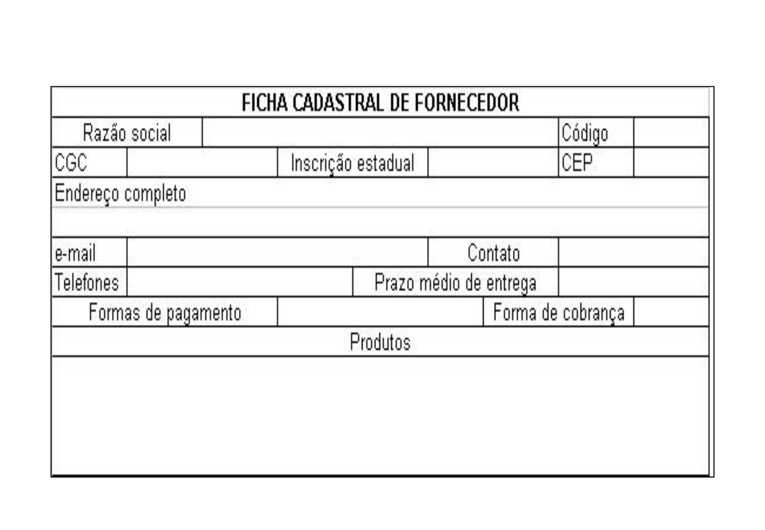 Ficha cadastral do fornecedor Ficha do produto Relatório Diário do Almoxarifado Ficha de estoque Unidade Código Jan Fev Mar Abr Mai Jun Jul Ago Set Out Nov Dez Média/ano Custo totalEntrada Saída Saldo Custo unitário FICHA DE ESTOQUE Produto Fornecedor Estoque máximo Estoque mínimo Ponto de ressuprimento Data da compra Número da nota fiscal Consumo médio anual Requisição à despensa Nome do Fornecedor Obs.: Especificações técnicas ( ) Itens que não conferem com o pedido Ficha de recepção nº.: Pedido nº.: Ficha de avaliação do fornecedor Especificações técnicas ( ) Quantidade ( ) Qualidade ( ) Preço ( ) Prazo de entrega ( ) Data: ___/___/______ Condições de pagamento ( ) Resp.: Solicitação interna de compra Cotação de preço entre fornecedores Pedido de compra ao fornecedor