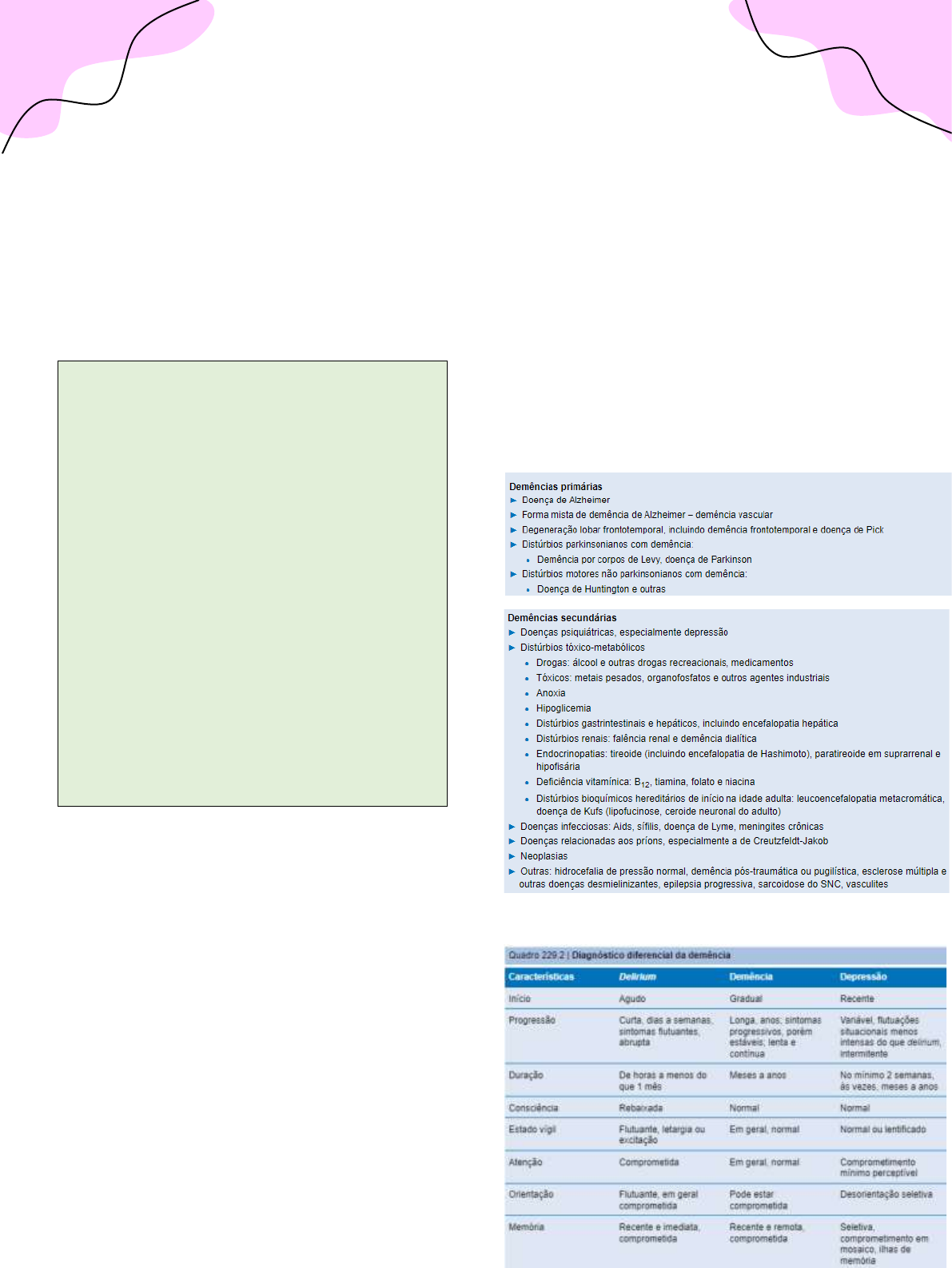 Carla Bertelli – 5° Período Síndromes Demenciais Síndromes Demenciais • Identificar os tipos de demência na pessoa idosa. • Abordar a conduta para pessoa com demência na APS (quando referenciar). • Conhecer prognóstico e complicações. • Abordar sobre a atuação da Atenção básica no processo de demência Referência: GUSSO, Gustavo; LOPES, José M.C.; DIAS, Lêda C. (Organizadores.). Tratado de Medicina de Família e Comunidade: Princípios, Formação e Prática. Porto Alegre: ARTMED, 2018, p. 2388. Cap. 229 Pontos Principais A demência é uma condição muito prevalente na população geriátrica, sendo comum a presença de múltiplas comorbidades. É preciso estabelecer a diferença entre demência, delirium e depressão, mas o diagnóstico etiológico nas demências primárias é menos importante. As demências primárias não têm tratamento farmacológico estabelecido. Nesse caso, o cuidador é uma figura muito importante. Alertas amarelos: relação com a família e rede social e organização do cuidado. Alertas vermelhos: excesso de medicalização, causas tratáveis, presença de delirium ou sintomas psicóticos. Demência (ou transtorno neurocognitivo) é a perda progressiva das funções cognitivas e emocionais de uma pessoa, com impacto em sua relação com o mundo, em geral com prejuízo à sua qualidade de vida. Caracteriza- se por distúrbios de memória associados a comprometimento do raciocínio lógico, da orientação espacial, da afetividade, da linguagem, das habilidades construtivas e de outras funções cognitivas, como capacidade de aprendizado, pensamento abstrato e julgamento. Os critérios do Manual diagnóstico e estatístico (DMS-V) podem ajudar na compreensão da demência de Alzheimer, a mais comum entre as causas • Alzheimer, demência vascular, mista, de corpos de Lewy e frontotemporal • Condição adquirida. Declínio cognitivo, comprometimento funções sociais e funcionais. Ligado ao sistema límbico e córtex frontal. Dobra de 5–10 anos. Quanto menor a escolaridade mais chance. • A mais comum é Alzheimer, Quando Pensar? Quando ocorrerem relatos de perdas de funções notáveis da pessoa, em geral pelos cuidadores ou familiares,2,3 ou com observações ao longo do acompanhamento pelo médico de família e comunidade. É incomum que a pessoa perceba e identifique a própria demência. A pessoa se queixa de perda da própria memória, que é um preditor de depressão, principalmente em conjunto com perda de atenção e sensação de piora na parte da manhã. Delirium X Demência X Depressão Carla Bertelli – 5° Período Anamnese O miniexame do estado mental é um teste simples, que pode ser aplicado na prática clínica como auxílio ao diagnóstico e ao seguimento, documentando a perda progressiva de funções mentais. Seu uso para rastreamento de demência como medida de prevenção primária é contraindicado devido ao baixo valor preditivo positivo (VPP), associado à alta frequência de falso- positivos.. Na aplicação do miniexame, é importante que o médico de família e comunidade tenha conhecimento das etapas do teste, bem como clareza ao realizá-las junto ao paciente. Aconselha-se ao médico que irá aplicá-lo um treinamento adequado para a sua realização. O diagnóstico de demência é essencialmente clínico, mas pode ser dificultado pela presença de múltiplas comorbidades. Na primeira consulta, em geral, a queixa de perda de memória parte do acompanhante, sendo que diversas informações devem ser coletadas com ele, a fim de compreender o quadro. Isso significa, avaliar as capacidades funcionais atuais e perdas progressivas do paciente. Nesse momento, devem-se afastar quadros de delirium e depressão, tratá-los, se presentes, e cogitar causas secundárias e sobrepostas. Lembrar que o Minimental se baseia em: orientação, atenção e cálculo, memória e linguagem. • Pontuação de 0 a 30 • Abaixo de 24 quadro demencial • Paciente com escolaridade elevada usa 28 • Paciente analfabeto usa 18 • Normal acima de 27 • Se menos de 4 anos de escolaridade usa 17 em vez de 24 Manifestações da Demência Cognitivas (Neuropsicológicas) – Amnesia, afasia, apaxia, agonia Carla Bertelli – 5° Período Comportamentais (Neuropsiquiátricas) – Sintomas psicológicos e comportamentais, agitação, delírio, alucinações, depressão. Atividades – Socioprofissionais, instrumentais, básicas Apatia – Isolamento, desmotivação, perda de interesse Agressão – Física, verbal, resistência agressiva Agitação psicomotora – Andar sem objetivo (deambular), andar atrás de outros, inquietação, repetição de atos diversos, vestir e despir, perturbações do sono Psicose – Alucinações, delírios, falsas identificações. Depressão – Tristeza, choro fácil, desespero, baixa autoestima, ansiedade, culpabilidade. É importante realizar uma primeira avaliação mental. Para isso, pode-se utilizar o miniexame do estado mental bem como o teste do desenho do relógio e testes de fluência verbal. Esses testes são úteis para avaliação e acompanhamento clínico. O miniexame pode contribuir com o diagnóstico de demências em contextos de baixa prevalência, não devendo ser usado isoladamente para definição do diagnóstico. Uma dica com alto grau de subjetividade é observar como a pessoa com demência tenta realizar os testes com mais vigor e responde incorretamente às questões, ao passo que a pessoa com depressão empenha-se menos para respondê-las. O miniexame do estado mental também pode ser usado para verificar a competência da pessoa em tomar decisões sobre seu próprio tratamento. O teste do desenho do relógio é realizado solicitando-se que a pessoa desenhe um relógio analógico corretamente, desenhando os ponteiros na hora referida pelo examinador. É importante ater-se a detalhes do relógio que são significativos para sua leitura, como a diferença de tamanho entre o 
