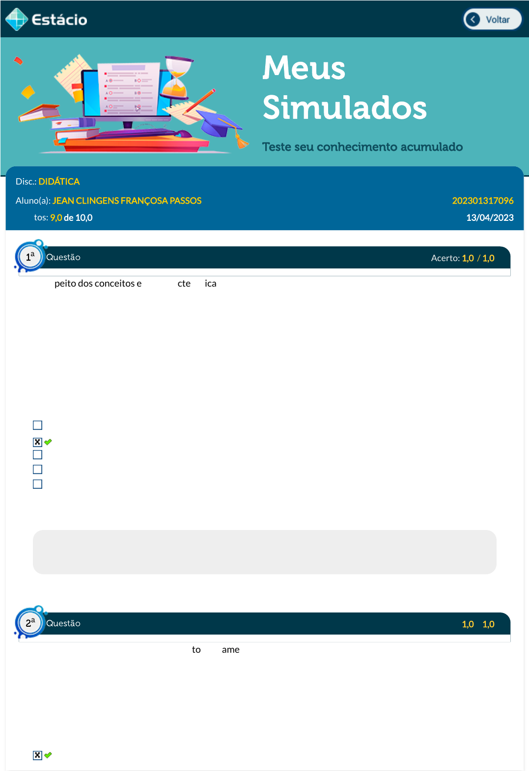 13/04/2023, 01:37 Estácio: Alunos https://simulado.estacio.br/bdq_simulados_avaliacao_parcial_resultado.asp?cod_hist_prova=306065859&cod_prova=6174189696&f_cod_disc= 1/6 Meus Simulados Teste seu conhecimento acumulado Disc.: DIDÁTICA Aluno(a): JEAN CLINGENS FRANÇOSA PASSOS 202301317096 Acertos: 9,0 de 10,0 13/04/2023 Acerto: 1,0 / 1,0 A respeito dos conceitos e das características da Didática, analise as a�rmativas abaixo: I- É a articulação de conteúdos, métodos e técnicas. II- É considerada uma parte imprescindível do processo de Formação de Professores. III- Atua, no processo de ensino e aprendizagem, como uma ferramenta para auxiliar a escolha de estratégias adequadas. IV- Está voltada apenas ao ensino de crianças. Estão corretas apenas as a�rmativas: II, III e IV I, II e III III e IV II e IV I, III e IV Respondido em 13/04/2023 00:42:30 Explicação: A Didática é uma ciência pedagógica fundamental para a docência de um modo geral. Acerto: 1,0 / 1,0 A dinâmica da aprendizagem é um ponto fundamental para entendermos e aplicarmos os conceitos da Didática. Por essa razão, podemos a�rmar que além de estudar técnicas e métodos, a Didática precisa: I - se inclinar para estudar as situações instrucionais que decorrem dos processos de aprendizagem II - buscar entender as situações instruções e situá-las dentro da realidade na qual se encontram professor e alunos III - entender o conteúdo a ser aprendido e fundamentá-lo em pressupostos �losó�cos A única alternativa correta é: I, II e III estão corretas Questão1 a Questão2 a https://simulado.estacio.br/alunos/inicio.asp javascript:voltar(); 13/04/2023, 01:37 Estácio: Alunos https://simulado.estacio.br/bdq_simulados_avaliacao_parcial_resultado.asp?cod_hist_prova=306065859&cod_prova=6174189696&f_cod_disc= 2/6 I está correta I e III estão corretas I e II estão corretas II e III estão correta Respondido em 13/04/2023 00:47:01 Explicação: A dinâmica da aprendizagem é um ponto fundamental para entendermos e aplicarmos os conceitos da Didática. Por essa razão, podemos a�rmar que além de estudar técnicas e métodos, a Didática precisa se inclinar para estudar as situações instrucionais que decorrem dos processos de aprendizagem, com a �nalidade de melhor entende-los e situá-los dentro da realidade na qual se encontram professor, alunos e conteúdo a ser aprendido e suportá-los em pressupostos �losó�cos Acerto: 0,0 / 1,0 Compreender as características de cada tendência pedagógica é importante para direcionar o professor no processo de ensino-aprendizagem. Sobre a tendência pedagógica progressista, pode-se dizer que, nessa concepção, as ideias dos pensadores John Locke e Adam Smith servem como in�uência. como um dos marcos do período, destaca-se o desenvolvimento de uma Revolução Cientí�ca. a escola deve preparar o indivíduo para atender às demandas sociais. os papéis que os indivíduos devem desempenhar são voltados para a sociedade. a escola deve contribuir para que o indivíduo possa discutir a sua atuação em sociedade. Respondido em 13/04/2023 00:51:22 Explicação: A tendência progressista parte do pressuposto de que a escola deve preparar o aluno para atuar como protagonista, fornecendo os instrumentos necessários para que o indivíduo possa discutir a sua atuação em sociedade. Acerto: 1,0 / 1,0 (Prefeitura do Ceará - 2019) De acordo com os Parâmetros Curriculares Nacionais, muitas questões sociais poderiam ser eleitas como temas transversais para o trabalho escolar, uma vez que o que os norteia, a construção da cidadania e a democracia, são questões que envolvem múltiplos aspectos e diferentes dimensões da vida social. Nesse sentido, foram então estabelecidos alguns critérios para de�nir e escolher os temas transversais. Relacione cada um dos critérios a seguir com sua respectiva justi�cativa. 1 - Urgência social. 2 - Abrangência nacional. 3 - Possibilidade de ensino e aprendizagem no ensino fundamental. 4 - Favorecer a compreensão da realidade e a participação social. ( ) Por ser um parâmetro nacional, a eleição dos temas buscou contemplar questões que, em maior ou menor medida e mesmo de formas diversas, fossem pertinentes a todo o País. Isso não exclui a possibilidade e a necessidade de que as redes estaduais e municipais, e mesmo as escolas, acrescentem outros temas relevantes à sua realidade. ( ) Esse critério norteou a escolha de temas ao alcance da aprendizagem nessa etapa da escolaridade. A experiência pedagógica brasileira, ainda que de modo não uniforme, indica essa possibilidade, em especial no Questão3 a Questão4 a 13/04/2023, 01:37 Estácio: Alunos https://simulado.estacio.br/bdq_simulados_avaliacao_parcial_resultado.asp?cod_hist_prova=306065859&cod_prova=6174189696&f_cod_disc= 3/6 que se refere à Educação para a Saúde, Educação Ambiental e Orientação Sexual, já desenvolvidas em muitas escolas. ( ) Esse critério indica a preocupação de eleger como Temas Transversais questões graves, que se apresentam como obstáculos para a concretização da plenitude da cidadania, afrontando a dignidade das pessoas e deteriorando sua qualidade de vida. ( ) A �nalidade última dos Temas Transversais se expressa neste critério: que os alunos possam desenvolver a capacidade de posicionar-se diante das questões que interferem na vida coletiva, superar a indiferença, intervir de forma responsável. Assim, os temas eleitos, em seu conjunto, devem possibilitar uma visão ampla e consistente da realidade brasileira e sua inserção no mundo, além de desenvolver um trabalho educativo que possibilite uma participação social dos alunos. Assinale a alternativa que indica a sequência correta. 2 - 3 - 1 - 4 2 - 3 - 4 - 1. 1 - 2 - 4 - 3. 4 - 1 - 3 - 2. 3 - 4 - 2 - 1. Respondido em 13/04/2023 00:55:07 Explicação: A sequência correta é 2 3 1 4 Acerto: 1,0 / 1,0 Segundo Libâneo: "Um professor comp