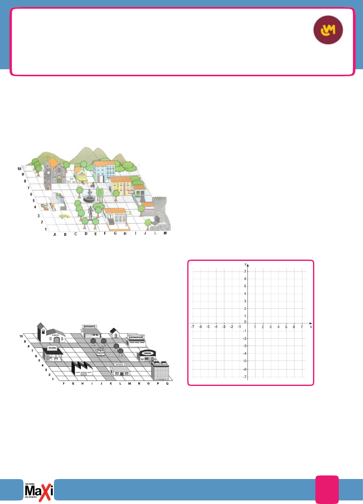 Plano Cartesiano Básica 1 Álgebra – Plano Cartesiano Questão 01. A figura seguinte nos mostra uma parte de uma cidade e um sistema de referência indicado por letras e números. Vamos combinar que a letra deve ser o primeiro elemento do par, e o número deve ser o segundo elemento. Observando o quadro qual é a localização do menino andando de bicicleta. a) (7, G) b) (G, 7) c) (10, F) d) (G, 5) Questão 02. A figura mostra o mapa de um bairro, no qual estão localizados alguns edifícios. Para localizar um dos edifícios, deve-se utilizar uma letra para indicar a coluna, seguido de um número para indicar a linha na qual o edifício está posicionado. Segundo as informações apresentadas, a localização Q5 se refere a que edifício? a) Cinema b) Posto c) Restaurante d) Supermercado Questão 03. Sobre o plano cartesiano, julgue as afirmativas a seguir: I - O eixo horizontal é conhecido também como eixo das abscissas. II - O ponto A (-5, 3) é um ponto do terceiro quadrante. III - O eixo vertical é conhecido também como eixo das coordenadas. Podemos afirmar que: a) Somente a afirmativa I é verdadeira. b) Somente a afirmativa II é verdadeira. c) Somente a afirmativa III é verdadeira. d) Somente as afirmativas II e III são verdadeiras. e) Somente as afirmativas I e III são verdadeiras. Questão 04. Em um plano cartesiano, foram marcados os pontos A (2, 3), B(–1, 2), C (2, –3) e D (1, 0). O único quadrante em que não há nenhum ponto marcado é: a) I b) II c) III d) IV Questão 05. Considere um quadrilátero formado pelos pontos A(–2, 4), B(–4, 4), C(–4, –6) e D(–2, –6). Questão 06. (Enem Digital 2020) O gráfico mostra o início da trajetória de um robô que parte do ponto A (2; 0), movimentando-se para cima ou para a direita, com velocidade de uma unidade de comprimento por segundo, no plano cartesiano. Colégio Vinícius Moraes – Educação de excelência Professor: Ronny Paiva Data: 19/04/2023 Plano Cartesiano Básica 2 O gráfico exemplifica uma trajetória desse robô, durante 6 segundos. Supondo que esse robô continue essa mesma trajetória, qual será sua coordenada, após 18 segundos de caminhada, contando o tempo a partir do ponto A? A) (0; 18) B) (18; 2) C) (18; 0) D) (14; 6) E) (6; 14) Questão 07. Questão 08. Observe a figura abaixo: Quais as coordenadas de A, B e C, respectivamente, no gráfico? a) (1, 4), (5, 6) e (4, 2) b) (4, 1), (6, 5) e (2, 4) c) (5, 6), (1, 4) e (4, 2) d) (6, 5), (4, 1) e (2, 4) Questão 09. Veja o triângulo LMN desenhado no plano cartesiano. Os vértices L, M e N desse triângulo correspondem, respectivamente, aos pontos. a) (1, – 1); (2, – 3) e (2, 3). b) (1, – 1); (– 3, 2) e (3, 2). c) (1, – 1); (–3, 2) e (2, 3). d) (– 1, 1); (– 3, 2) e (2, 3). e) (– 1, 1); (2, – 3) e (3, 2). Questão 10. No plano cartesiano a seguir, estão marcados alguns pontos. Podemos afirmar que pertencem ao quarto quadrante os pontos: a) G e E b) D e A c) D, A e J d) F e J e) G, E, O e B “Aqueles que passam por nós, não vão sós, não nos deixam sós. Deixam um pouco de si, levam um pouco de nós.” Antoine de Saint Exupéry