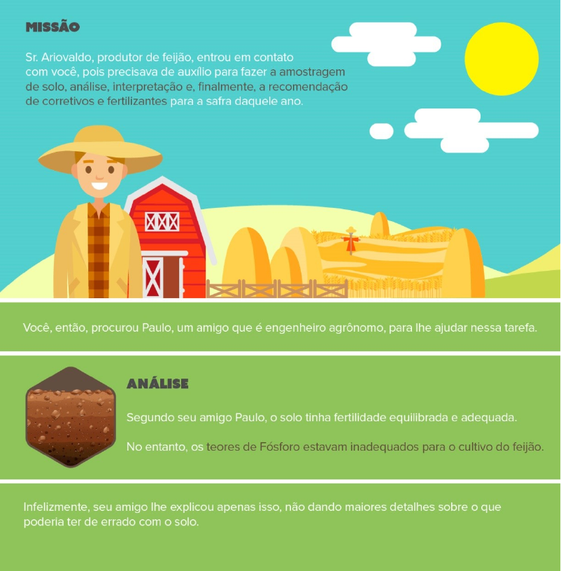 Desafio A fração orgânica constitui, geralmente, 20 a 80% do fósforo total nos horizontes superficiais do solo. Porém, as práticas agrícolas, muitas vezes, fazem com que a quantidade de nutrientes presentes nos solos (como é o caso do fósforo) acabem ficando deficientes, afetando negativamente a produção. Desta forma, é de suma importância a realização de análises nos solos, a fim de saber exatamente quais são os teores de nutrientes (tanto micro como macronutrientes) e quais são as possíveis medidas para a correção. Considerando que o teor de P (resina) mostrado na análise de solo é de 3 mg.dm-3 e a correção da camada (caso a correção seja necessária) é 0-20cm, responda: A) Paulo está certo ou errado quanto ao posicionamento que ele deu? Justifique. B) Caso Paulo esteja certo, qual seria a sua recomendação de fosfatagem utilizando a fonte Fosfato Natural? Padrão de resposta esperado A) Paulo está correto. Os teores médios adequados para o cultivo do feijoeiro ficam entre 16 e 40 mg.dm-3 de P (Resina). Dessa forma, será necessária a realização de uma fosfatagem para elevar os teores disponíveis de P no solo para o intervalo adequado. B) A conta é a seguinte: 16 mg.dm-3(teor adequado) - 3 mg.dm-3 (teor atual da análise do solo) = 13 mg.dm-3 (necessidade de reposição). Ou seja, deve-se buscar o incremento de 13 mg.dm-3 na camada 0-20cm do solo. Na camada 0-20cm de um hectare existem 2.000.000dm3 de solo (2dm x 1000dm x 1000dm). Dessa forma, devem ser adicionados 13 (necessidade de reposição) x 2.000.000 dm³ (volume de solo da camada 0-20cm para 1ha) = 26.000.000mg de P por hectare é o que deve ser adicionado. Cortando-se os zeros, chegamos ao valor de 26kg/ha de P que devem ser adicionados. Agora só falta o estudante verificar qual é a dose de fertilizante da fonte fosfato natural que ele deve adicionar. As concentrações dos fertilizantes não são trazidas na forma elementar, e sim na forma de óxidos, ou seja, o estudante deve fazer a conversão de P para o seu óxido: P2O5. Para fazer essa conversão, basta fazer a multiplicação pelo fator 2.29, ou, então, fazer as contas da massa molecular. Sendo assim, o estudante deve fazer a seguinte conta: 26 kg/ha de P x 2.29 = 59,54 kg/ha de P2O5. Aproximadamente, 60 kg/ha de P2O5 devem ser adicionados. Como a fonte disponível é o fosfato natural e ele apresenta 24% de P2O5, basta realizar uma regra de três para chegar ao valor final que será utilizado na fosfatagem. 24% ------ 60 kg 100%------- x x = 250 kg/ha de Fosfato Natural devem ser aplicados via fosfatagem (área total) para que os níveis de fósforo estejam adequados para o cultivo do feijoeiro.