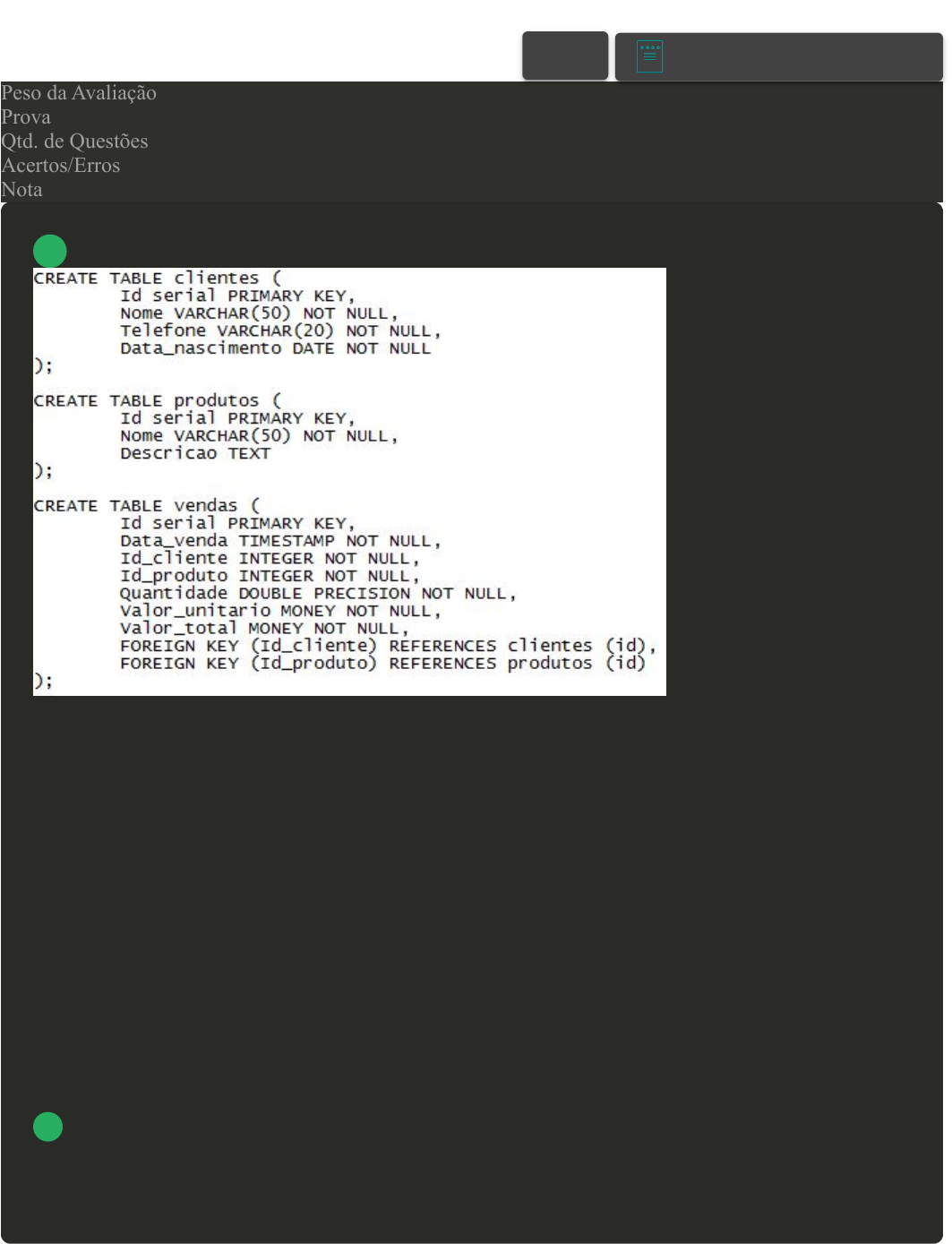 13/04/2023, 11:10 Avaliação II - Individual about:blank 1/7 Prova Impressa GABARITO | Avaliação II - Individual (Cod.:828862) Peso da Avaliação 1,50 Prova 62462262 Qtd. de Questões 10 Acertos/Erros 9/1 Nota 9,00 Segue os comandos SQLs para criação das tabelas “clientes”, "produtos" e “vendas”: Com relação às informações dadas, classifique V para as sentenças verdadeiras e F para as falsas: ( ) Para saber quais foram os clientes que compraram no última dia que houve vendas, executamos a consulta SELECT c.* FROM vendas v INNER JOIN clientes c ON v.Id_cliente = c.Id WHERE v.Data_venda IN (SELECT MAX(data_venda) ultima_venda FROM vendas). ( ) Para saber qual produto apresenta o maior valor total de venda, executamos a consulta SELECT p.* FROM vendas v INNER JOIN produtos p ON v.Id_produto = p.Id WHERE v.Valor_total IN (SELECT MAX(v.Valor_total) maior_venda FROM vendas v). ( ) Para saber os produtos que os clientes compraram, executamos a consulta SELECT * FROM clientes, produtos. ( ) Para somar todos os valores vendidos, executamos a consulta SELECT COUNT(Valor_total) FROM vendas. Assinale a alternativa que apresenta a sequência CORRETA: A F - V - F - V. B V - V - V - V. C V - V - F - F. D F - F - F - V. VOLTAR A+ Alterar modo de visualização 1 13/04/2023, 11:10 Avaliação II - Individual about:blank 2/7 A cláusula JOIN é usada para combinar linhas de 2 ou mais tabelas, baseadas nas relações existentes entre elas. Além dos JOINs para combinar tabelas, a linguagem SQL permite funções de agregação que nos ajuda com a análise dos dados, apresentando de forma resumida as informações de uma consulta. Referente à extração de dados utilizando JOINs e funções de agregação, analise o comando SELECT a seguir: SELECT p.id, p.nome, AVG(m.valor_unitario) as media_valor FROM produto p INNER JOIN movimento mON p.id = m.id_produto GROUP BY p.id, p.nome. Com relação ao comando anterior, classifique V para as sentenças verdadeiras e F para as falsas: ( ) A função AVG nos retorna a média dos valores de um grupo. ( ) Esta consulta está agrupando o “id” e “nome” do produto para retornar a média dos valores unitários. ( ) A função AVG nos retorna à soma dos valores de um grupo. ( ) A cláusula INNER JOIN presente no comando de consulta irá retornar todos os produtos, mesmo os que não apresentam um registro correspondente na tabela de movimento. Assinale a alternativa que apresenta a sequência CORRETA: A V - V - V- F. B F - V - V - F. C V - F - V - F. D V - V - F - F. Para que seja possível efetuar consultas SQL utilizando mais de uma tabela, é necessário trabalharmos a cláusula FROM do nosso comando SELECT. Para isto, podemos informar as tabelas dentro da cláusula FROM separando elas por vírgula e na cláusula WHERE ligando as tabelas em suas respectivas chaves primárias e estrangeiras. Da mesma forma, a cláusula JOIN é usada para combinar linhas de 2 ou mais tabelas, baseadas nas relações existentes entre elas. Referente à cláusula JOIN, analise as sentenças a seguir: I- INNER JOIN retorna todos os registros correspondentes tanto da direita como da esquerda, trazendo NULO quando o registro correspondente não existir. II- LEFT JOIN retorna todos os registros da esquerda e seus correspondentes da direita. Quando o correspondente da direita não existir, seus registros serão apresentados como NULO por padrão. III- INNER JOIN retorna todos os registros da esquerda, apenas se houver o seu correspondente na direita, ou seja, irá apresentar apenas os registros correspondentes. IV- RIGHT JOIN não é um comando válido em um banco de dados MySQL Server. Assinale a alternativa CORRETA: A I e IV, apenas. B I e II, apenas. C II e III, apenas. D I e III, apenas. 2 3 13/04/2023, 11:10 Avaliação II - Individual about:blank 3/7 Analise as tabelas a seguir: Tabela: VENDEDOR ID NOME 1 JOSÉ DE ASSIS 2 PEDRO LOBATO 3 MARTA MEIRELES 4 GEISA FONTANA Tabela: VEICULOS ID DESCRICAO PLACA ID_VENDEDOR 1 GOL AAA-1230 1 2 HB20 BBB-5555 2 3 HB20 CCC-3333 3 4 S10 DDD-1010 4 A partir das tabelas apresentadas e sabendo que na tabela VEICULOS o campo ID_VENDEDOR referencia o campo ID da tabela VENDEDOR, analise o comando SQL a seguir e assinale o resultado que a execução irá retornar: SELECT VEICULOS.DESCRICAO, VEICULOS.PLACA, VENDEDOR.NOME FROM VEICULOS INNER JOIN VENDEDOR ON VEICULOS.ID_VENDEDOR = VENDEDOR.ID WHERE VEICULOS.ID_VENDEDOR = 3; A HB20 / CCC-3333 / MARTA MEIRELES. B UNO / UUU-0909 / CLEITON PIRES. C S10 / DDD-1010 / GEISA FONTANA. D HB20 / BBB-5555 / PEDRO LOBATO. Analise o comando SQL a seguir: SELECT c.id as id_cliente, c.nome as nome_cliente, SUM(v.valor_total) as valor_venda FROM vendas v INNER JOIN clientes c ON v.id_cliente = c.cliente WHERE v.data_venda BETWEEN ‘2018-09-01' and ‘2018-09-30’ GROUP BY c.id, c.nome; Considerando o exposto, analise as sentenças a seguir: I- O comando SELECT retorna o valor de todas as vendas relacionadas aos clientes, agrupando a soma das venda por “id” e “nome” do cliente. II- O comando SELECT retorna o valor de vendas agrupados por clientes e apresenta valor nulo para os clientes que não tiveram vendas no período. III- O comando SELECT retorna apenas as vendas que ocorreram no mês de setembro de 2018. IV- O comando SELECT retorna a média do valor de venda, agrupando o resultado por cliente. Assinale a alternativa que apresenta a sequência CORRETA: 4 5 13/04/2023, 11:10 Avaliação II - Individual about:blank 4/7 A I e IV, apenas. B I e III, apenas. C I, II, III e IV. D I e II, apenas. A Linguagem SQL oferece subconsultas ou “subqueries”, que são um forma de se fazer consulta aninhadas ou de criar uma expressão de SELECT – FROM – WHERE utilizada dentro de outra consulta. Essas subconsultas ajudam a extrair resultados mais precisos e complexos. Com relação às subconsultas, classifique V para as sentenças verdadeiras e F para as falsas: ( ) A linguagem SQL permite criar