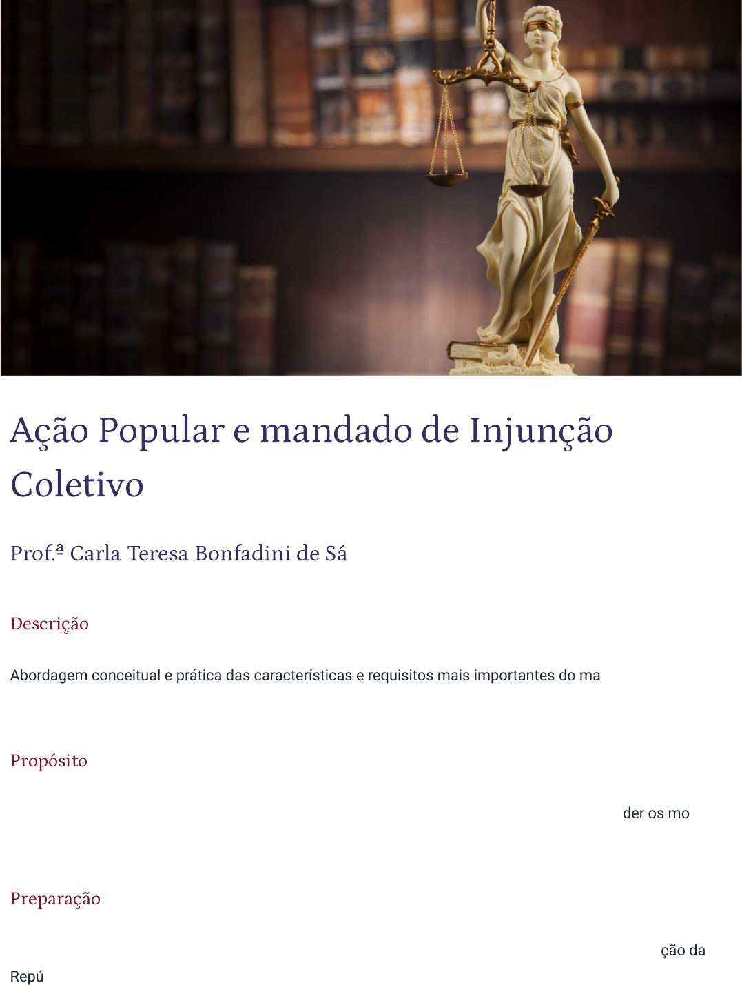 22/04/2023, 12:28 Ação Popular e mandado de Injunção Coletivo https://stecine.azureedge.net/repositorio/00212hu/04024/index.html#imprimir 1/32 Ação Popular e mandado de Injunção Coletivo Prof.ª Carla Teresa Bonfadini de Sá Descrição Abordagem conceitual e prática das características e requisitos mais importantes do mandado de injunção e da ação popular. Propósito O aprendizado do mandado de injunção e da ação popular permitirá ao estudante compreender os modos de utilização de duas das mais relevantes ações constitucionais e que são formas de tutela coletiva. Preparação Antes de iniciar o estudo, tenha em mãos as Leis nº 4.717/1965 e 13.300/2016, além da Constituição da República de 1988 aberta no art. 5º, incisos LXXI e LXXIII. 22/04/2023, 12:28 Ação Popular e mandado de Injunção Coletivo https://stecine.azureedge.net/repositorio/00212hu/04024/index.html#imprimir 2/32 Objetivos Módulo 1 O mandado de injunção e os direitos fundamentais Analisar conceito, objeto, características e hipóteses de cabimento do mandado de injunção. Módulo 2 A ação popular e a defesa da coletividade Analisar conceito, objeto, características e hipóteses de cabimento da ação popular. Considerando que, embora seja assegurado o direito de greve, não existe disciplina desse direito para o setor público, como poderiam os titulares desse direito obter a sua concretização? Como obter o suprimento da omissão, de modo a se conseguir exercer o direito? Como veremos ao longo deste conteúdo, o mandado de injunção é um instrumento de controle incidental da inconstitucionalidade por omissão, pois o seu objetivo primordial é tutelar diretos subjetivos constitucionais frustrados pela inércia inconstitucional do órgão responsável pela regulamentação. Além do mandado de injunção individual, há o coletivo destinado a tutelar os direitos, as liberdades e as prerrogativas constitucionais pertencentes, indistintamente, a uma coletividade indeterminada de pessoas ou determinada por grupo, classe ou categoria, cujo exercício seja frustrado pela falta de norma regulamentadora. Após estudarmos o mandado de injunção, ingressaremos no aprendizado de um remédio constitucional que encerra esse ciclo de técnicas para a tutela de direitos fundamentais, nesse caso, direitos difusos da coletividade lesados ou ameaçados de lesão. Introdução 22/04/2023, 12:28 Ação Popular e mandado de Injunção Coletivo https://stecine.azureedge.net/repositorio/00212hu/04024/index.html#imprimir 3/32 1 - O mandado de injunção e os direitos fundamentais Ao �nal deste módulo, você será capaz de analisar conceito, objeto, características e hipóteses de cabimento do mandado de injunção. A ação popular é o remédio constitucional de que dispõe o cidadão para anular ato lesivo ao patrimônio público ou de entidade de que o Estado participe, à moralidade administrativa, ao meio ambiente e ao patrimônio histórico e cultural. Se houver um empreendimento lesivo ao meio ambiente, poderá o cidadão postular a sua cessação, bem como a reparação ao meio ambiente (reparação específica e ressarcimento pecuniário), por meio da propositura de uma ação popular. Do mesmo modo, poderá um cidadão postular a invalidação de um contrato celebrado sem licitação e fora das hipóteses de contratação direta, além do devido ressarcimento ao erário. Assim como a ação civil pública, a ação popular é uma espécie do gênero ação coletiva. 22/04/2023, 12:28 Ação Popular e mandado de Injunção Coletivo https://stecine.azureedge.net/repositorio/00212hu/04024/index.html#imprimir 4/32 Cabimento O mandado de injunção é remédio constitucional previsto no art. 5º, LXXI, da Constituição da República e disciplinado pela Lei nº 13.300/2016, destinado a assegurar o exercício de direitos, liberdades constitucionais e prerrogativas inerentes à nacionalidade, à soberania e à cidadania sempre que a falta de norma regulamentadora impeça o seu exercício. Seus requisitos são: Competência Hipóteses O constituinte fixou a regra de competência para o julgamento com base na fonte responsável pela omissão regulamentadora. No entanto, não se trata de competência em razão da pessoa. Vejamos as hipóteses que se seguem: Existência de um direito subjetivo constitucional ligado às liberdades fundamentais, à nacionalidade, à soberania e à cidadania (mandado de injunção individual). No caso do mandado de injunção coletivo, devem existir os direitos, as liberdades e as prerrogativas pertencentes, indistintamente, a uma coletividade indeterminada de pessoas ou determinada por grupo, classe ou categoria. Ausência de norma regulamentadora que frustre o exercício do referido direito subjetivo constitucional ou, no caso do mandado de injunção coletivo, os direitos coletivos constitucionais. Quanto à falta de norma regulamentadora, a omissão pode ser tanto parcial como total. 22/04/2023, 12:28 Ação Popular e mandado de Injunção Coletivo https://stecine.azureedge.net/repositorio/00212hu/04024/index.html#imprimir 5/32 Supremo Tribunal Federal i. Competência originária para processamento do mandado de injunção quando a elaboração da norma regulamentadora deva ser feita pelo Presidente da República, da Câmara dos Deputados, do Senado, das Mesas de uma das casas legislativas, do Tribunal de Contas da União, de um dos Tribunais Superiores e do próprio STF (art. 102, I, “q” da Constituição da República). ii. Competência para julgar em recurso ordinário o mandado de injunção denegado, em instância única, em Tribunais Superiores (art. 102, II, “a” da Constituição da República). Superior Tribunal de Justiça i. Competência originária para o mandado de injunção quando a norma regulamentadora deva ser feita por órgão, entidade ou autoridade federal, da administração direta ou indireta, excetuados aqueles de competência do STF