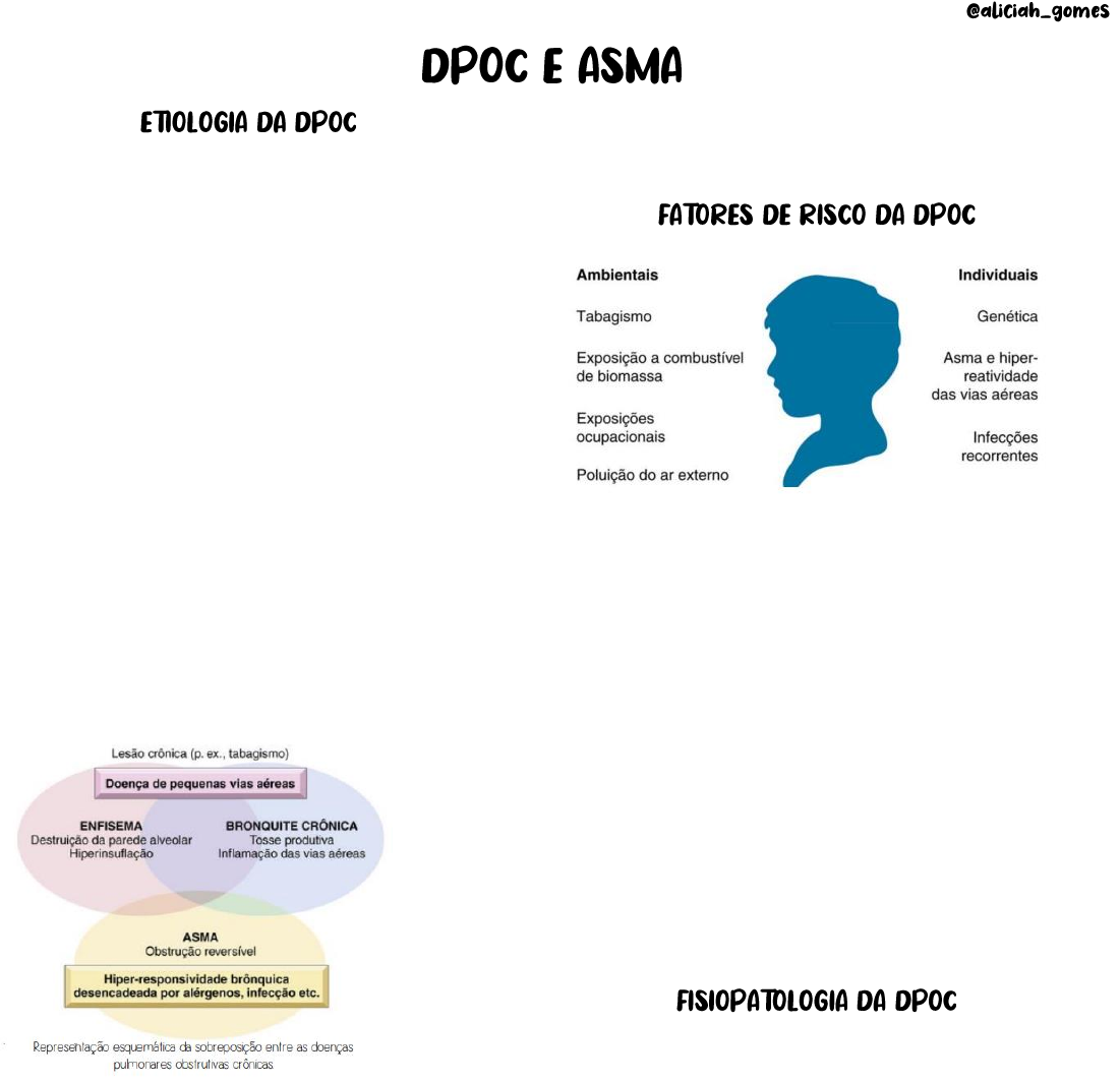 ↠ A doença pulmonar obstrutiva crônica (DPOC) se caracteriza por obstrução crônica e recorrente do fluxo de ar nas vias respiratórias pulmonares. A obstrução do fluxo aéreo geralmente é progressiva e acompanhada por uma reação inflamatória a partículas ou gases nocivos (PORTH, 10ª ed.) O termo doença pulmonar obstrutiva crônica (DPOC) engloba o enfisema e a bronquite obstrutiva crônica. Os mecanismos envolvidos são diversos e incluem inflamação e fibrose da parede brônquica, hipertrofia das glândulas submucosa e hipersecreção de muco, perda de fibras elásticas pulmonares e tecido alveolar. A inflamação e fibrose da parede brônquica obstruem o fluxo aéreo e buscam impedir a correspondência entre a ventilação e a perfusão. EPIDEMIOLOGIA DPOC é uma das principais causas de morbidade e mortalidade em todo o mundo. Segundo as estimativas, quase 30 milhões de americanos apresentam algum grau de DPOC e 16 milhões estão diagnosticados com a doença. Nos EUA, a DPOC é a quarta principal causa de morte, atrás apenas da cardiopatia, câncer e lesões não intencionais. Ocorre mais em homens (15.7%) do que em mulheres (9.93%). É mais comum em idosos, principalmente os que estão acima de 65 anos. A prevalecia é maior na região das Américas e menor nas regiões do Sudeste Asiático e do Pacífico Ocidental da OMS. ↠ Nos países desenvolvidos, o tabagismo é o principal fator etiológico, ultrapassando qualquer um dos outros fatores de risco. No entanto, nos países em desenvolvimento, a principal causa é a exposição a combustíveis de biomassa (BROADDUS, 6ª ed.). ↠ A causa mais comum de DPOC é o tabagismo e aproximadamente 80% das mortes relacionadas com DPOC estão associadas à história de tabagismo. Uma segunda causa, menos comum, é a deficiência hereditária de alfa1-antitripsina (AAT). A deficiência de AAT (DAAT) é um fator de risco genético para DPOC (PORTH 10ª ed.). A doença pulmonar obstrutiva crônica engloba dois tipos de doença obstrutiva das vias respiratórias: enfisema (alargamento do espaços aéreos e destruição do tecido pulmonar) e bronquite obstrutiva crônica (aumento da produção de muco, obstrução das vias aéreas menores e tosse crônica). Enfisema É a perda da elasticidade pulmonar e aumento anormal dos alvéolos distais aos bronquíolos terminais, com destruição das paredes alveolares e dos leitos capilares. Esse aumento dos alvéolos é a hiperinflação dos pulmões, levando a um aumento da capacidade pulmonar total (CPT). Uma das causas do enfisema, é o tabagismo, que inicia a lesão pulmonar e uma deficiência herdada de AAT, que é uma enzima que protege o pulmão de lesões. A deficiência dessa enzima, é um fator de risco genético para DPOC. Acredita-se que o enfisema seja resultado da degradação da elastina e de outros componentes da parede dos alvéolos por enzimas, chamadas proteases, que digerem proteínas. A fumaça do cigarro estimula o movimento de células inflamatórias nos pulmões, aumentando a liberação de elastase e outras proteases. Então, quando o fumante desenvolve a DPOC, a produção e a liberação de antiprotease pode ser inadequada para neutralizar o excesso de protease, então o processo de destruição do tecido elástico permanece sem controle. O tipo e a quantidade de AAT são determinados por um par de genes. Quando as pessoas são fumantes ou adquirem infecções repetidas das vias respiratórias, diminuem o nível de AAT, contribuindo para o risco de desenvolvimento de enfisema em pessoas com DAAT. Existem dois tipos de enfisema: centroacinar ou centrolobular e pan-acinar. Centoacinar: está associado ao tabagismo e existe o comprometimento dos bronquíolos respiratórias, predominante nos lobos superiores e nos segmentos superiores dos lobos inferiores, sendo comum no sexo masculino fumante. Pan-acinar: produz inicialmente o envolvimento inicial dos alvéolos periféricos e depois se estende para envolver os bronquíolos mais centrais. Esse tipo é mais comum em pessoas com DAAT, mas também é encontrado em fumantes, associados ao enfisema centroacinar, sendo mais observado nas porções superiores do pulmão. Bronquite obstrutiva crônica Representa uma obstrução das pequenas e grandes vias respiratórias. É mais comum em homens de meia-idade e está associada a irritação crônica causada pelo tabagismo e infecções recorrentes. A característica principal é a hipersecreção de muco nas grandes vias respiratórias, associada a hipertrofia das glândulas submucosa na traqueia e nos brônquios. Histologicamente, essas alterações incluem o aumento nas células caliciformes e um excesso de produção de muco, com obstrução do lúmen das vias respiratórias, infiltração inflamatória e fibrose da parede bronquiolar. A hipertrofia da submucosa das grandes vias e o aumento das células caliciformes das pequenas vias, representam uma reação de proteção contra o fumo do tabaco e outros poluentes. Ç Geralmente o início da manifestações clínicas é insidioso. Apresenta inicialmente fadiga, intolerância ao exercício, tosse, produção de escarro ou dificuldade respiratória. A tosse produtiva ocorre na parte da manhã e a dispneia se torna mais grave a medida em que a doença progride. Os estágios mais finais se caracterizam por infecções respiratórias de repetição e insuficiência respiratória crônica. Pessoas com predominância das manifestações de enfisema são referidos como “sopradores rosados” devido a ausência da cianose, uso de músculos acessórios e a respiração com os lábios semicerrados (soprador). Há a perda da elasticidade e a hiperinsuflação dos pulmões, fazendo com o que haja um colapso das vias respiratórias durante a expiração. O ar irá permanecer retido nos alvéolos e pulmões, provocando um aumento da dimensão anteroposterior do tórax, chamado “tórax de barril”. Já as manifestações de bronqu