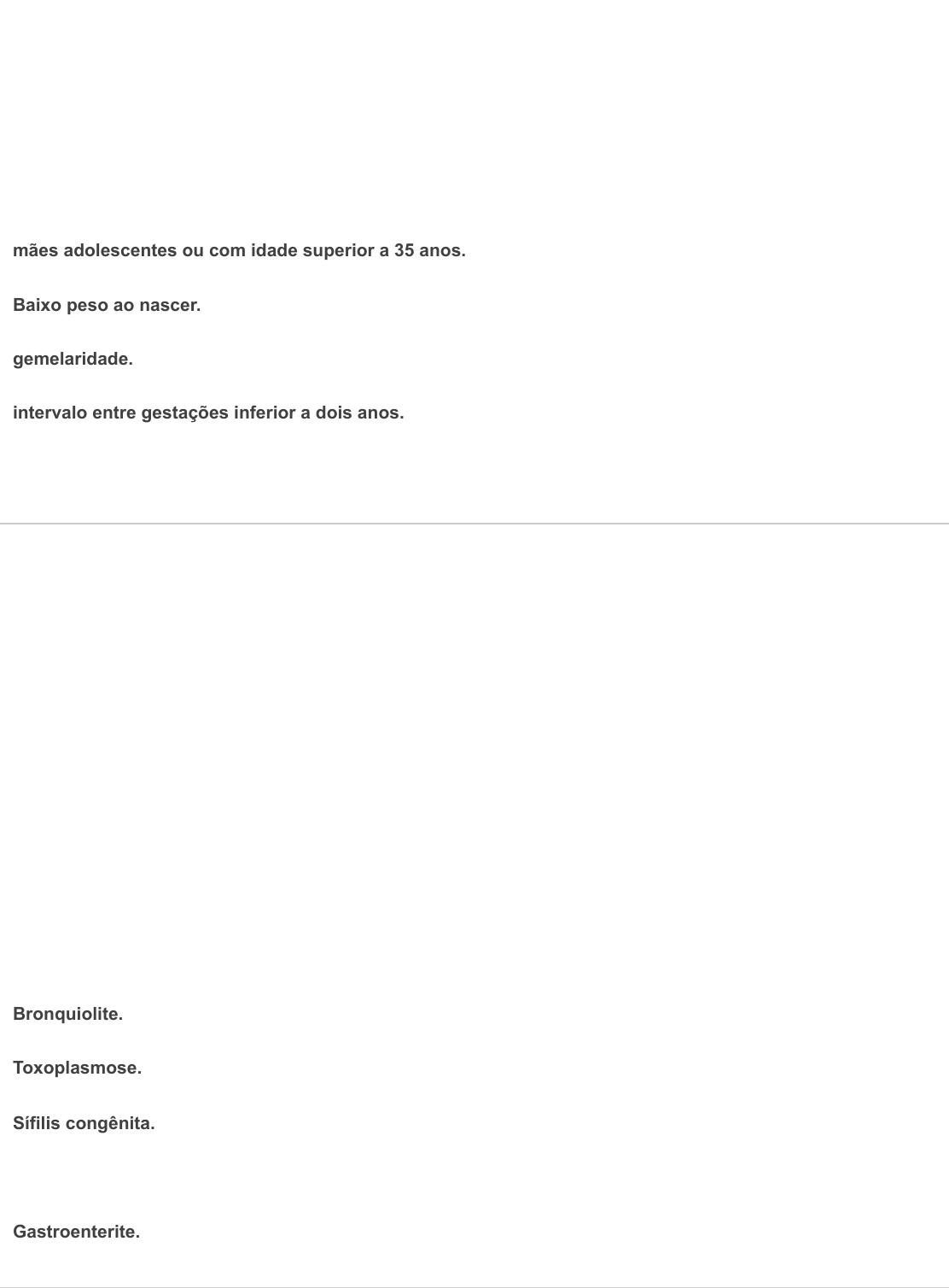 22/04/2023 21:20 Comentários https://sereduc.blackboard.com/ultra/courses/_163384_1/grades/assessment/_7832817_1/overview/attempt/_26212500_1/review/inline-feedback… 1/6 Ocultar opções de resposta Ocultar opções de resposta Pergunta 1 1 / 1 O acompanhamento de cada criança permite identificar os riscos de morbi/mortalidade, sinalizar sinais de vulnerabilidade para a desnutrição ou problemas de saúde nesse período. Alguns fatores de risco devem ser observados durante as consultas. Assinale abaixo qual dos seguintes fatores NÃO se constitui como um fator de risco: mães adolescentes ou com idade superior a 35 anos. Baixo peso ao nascer. gemelaridade. intervalo entre gestações inferior a dois anos. Resposta corretaescolaridade da mãe elevada. Pergunta 2 1 / 1 O AIDPI foi criando com o intuito de reduzir a mortalidade de crianças menores de cinco anos, principalmente as ocasionadas pelas doenças prevalentes e de fácil prevenção; abreviar os episódios e a gravidade de doenças infecciosas e garantir atenção integral de qualidade às crianças menores de cinco anos nos serviços de saúde e nos domicílios. (SANTOS et al, 2015). Qual das doenças listadas abaixo NÃO se considera no rol de doenças mais prevalentes da infância? Bronquiolite. Toxoplasmose. Sífilis congênita. Resposta corretaOrqueíte. Gastroenterite. 22/04/2023 21:20 Comentários https://sereduc.blackboard.com/ultra/courses/_163384_1/grades/assessment/_7832817_1/overview/attempt/_26212500_1/review/inline-feedback… 2/6 Ocultar opções de resposta Ocultar opções de resposta Pergunta 3 1 / 1 O acompanhamento de crianças é uma etapa fundamental e prioritária de seu trabalho. Você vai acompanhar todas as crianças de sua área de atuação, desenvolvendo ações de prevenção de doenças e agravos e de promoção à saúde. Entre as ações de prevenção das doenças e promoção à saúde, está o incentivo ao cumprimento do calendário vacinal, a busca ativa dos faltosos às vacinas e consultas, entre outros. Sendo assim, na primeira consulta você deverá identificar se o recém-nascido tomou as primeiras vacinas, que são: Hepatite B e C. Tétano e BCG. Resposta corretaBCG e Hepatite B. Tríplice Viral e Hepatite B. Trípilice Bacteriana e BCG. Pergunta 4 1 / 1 Sobre a sífilis congênita, analise as alternativas e assinale a resposta correta: É uma das principais causas de abortamento, óbito fetal, natimortalidade, e bebês com peso elevado ao nascer. Quando confirmada a infecção neonatal, ou a provável infecção, deve-se indicar a terapia medicamentosa com antirretrovirais. A sífilis congênita é uma infecção sexualmente transmissível (IST) causada disseminação do vírus Treponema pallidum de uma gestante infectada, para seu concepto. 22/04/2023 21:20 Comentários https://sereduc.blackboard.com/ultra/courses/_163384_1/grades/assessment/_7832817_1/overview/attempt/_26212500_1/review/inline-feedback… 3/6 Ocultar opções de resposta Resposta correta A contaminação se dá via transplacentária e que, apesar de apresentar diagnóstico e tratamento de baixo custo, continua nos dias de hoje sendo um grave problema de Saúde Pública. É uma doença que não está relacionada com a prematuridade. Pergunta 5 1 / 1 A cabeça do recém-nascido sofre pressão intensa durante o trabalho de parto, que, às vezes, adquire uma forma diferente do normal. Além disso, a cabeça de um recém-nascido é totalmente diferente de uma pessoa em sua fase adulta, quando adulta já tem seu crânio totalmente fechado, já os recém-nascidos não. A “moleira” como muitos chamam são espaços sem ossos na cabeça do recém-nascido, conhecidos também como fontanelas. Sobre esta temática, analise as alternativas e assinale a que julgar verdadeira: Resposta correta A fontanela bregmática ou bregma tem formato de losango e fica localizada na região anterior, na confluência dos ossos parietal direito, parietal esquerdo e frontal. Em comparação ao bregma, a fontanela lambdoide é maior, com cerca de 1 cm de diâmetro a mais. O tamanho da fontanela bregma é cerca de 5 a 8 cm. A fontanela lambdoide tem formato retangular e fica localizada na região posterior, entre os ossos parietais direito, esquerdo e occipital. A fontanela posterior pode fechar-se entre o 9º e 18º mês e a anterior até o 2º mês. Pergunta 6 1 / 1 O coto umbilical é uma pequena parte do cordão umbilical que fica ligada ao umbigo do recém-nascido depois do parto, quando o cordão que o ligava à mãe é cortado. Esse coto é encerrado no local do corte com uma presilha (conhecida como “clamp”) e vai secar naturalmente ao longo dos primeiros dias de vida, acabando por cair. Em 22/04/2023 21:20 Comentários https://sereduc.blackboard.com/ultra/courses/_163384_1/grades/assessment/_7832817_1/overview/attempt/_26212500_1/review/inline-feedback… 4/6 Ocultar opções de resposta Ocultar opções de resposta algumas crianças, esse coto umbilical infecciona e começa a produzir uma secreção purulenta. Como chamamos essa infecção? Otite. Resposta corretaOnfalite. Orquiepididimite. Orqueíte. Osteíte. Pergunta 7 1 / 1 A consulta de acompanhamento do crescimento e desenvolvimento serve como uma ferramenta importante na criação de vínculo e canal de diálogo entre a família e a equipe de saúde, além de, ter como objetivo identificar patologias presentes precocemente e prevenir possíveis problemas de saúde para a idade, com orientações sobre vacinação, alimentação e cuidados com a criança. De acordo com a interpretação do gráfico de peso x idade, assinale a alternativa correta: Acima ou sobre a linha do -5 (equivalente ao percentil 3) e abaixo ou sobre a linha do +2 (equivalente ao percentil 97) significa o peso está adequado para a idade. Acima da linha do +4 (equivalente ao percentil 97) significa o peso está elevado para a idade. Acima ou sobre a linha do -4 (equivalente ao percentil 0,1) e abaixo da 
