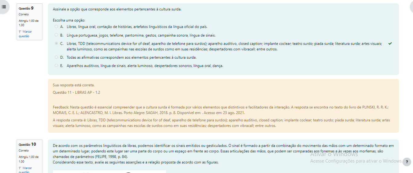 Assinale a opção que corresponde aos elementos pertencentes à cultura surda. A. Libras, língua oral, contação de histórias, artefatos linguísticos da língua oficial do país. B. Língua jogos, telefone, pantomima, gestos, campainha sonora, língua de C. Libras, TDD (telecommunications device for of deaf, aparelho de telefone para surdos); aparelho auditivo, closed caption; implante coclear; teatro surdo; piada surda; literatura surda; artes visuais; alerta luminoso, como as campainhas nas escolas de surdos como em suas despertadores com vibracall; entre D. Todas as afirmativas correspondem aos elementos pertencentes à cultura surda. E. Aparelhos auditivos, língua de sinais, alerta luminoso, despertadores sonoros, língua oral, dança.