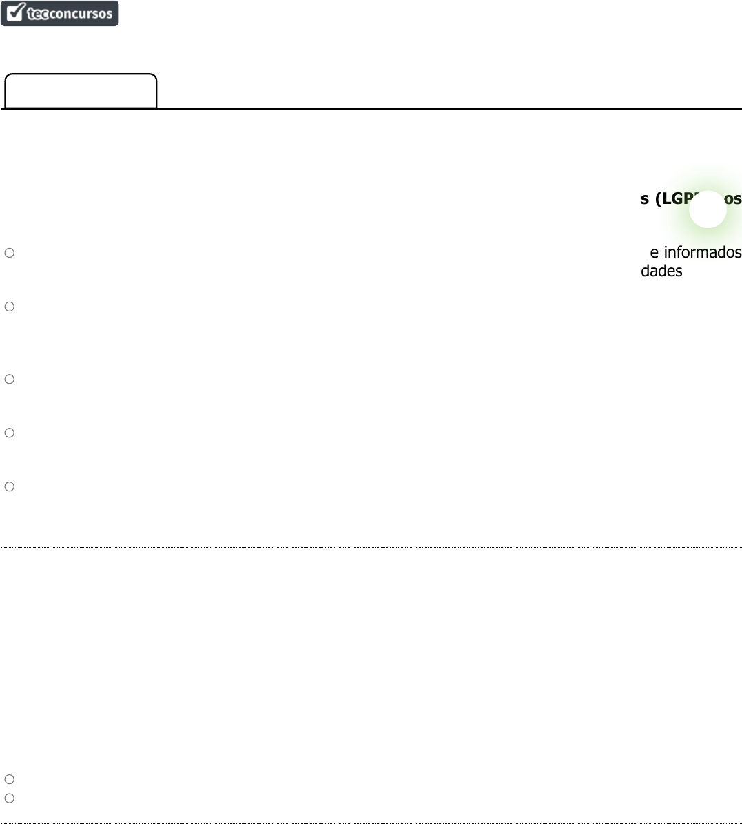 Legislação acerca da Privacidade e Proteção de Dados Pessoais para Analista (SERPRO) 2023 ( https://www.tecconcursos.com.br/s/Q2fQZn ) Ordenação: Por Matéria Direito Digital Questão 401: IBFC - AJ (TJ MG)/TJ MG/Administrador/2022 Assunto: Disposições Preliminares (arts. 1º ao 6º da LGPD) Assinale a alternativa incorreta, considerando a Lei Geral de Proteção de Dados (LGPD), os princípios e a boa-fé que deverão ser observados. a) Finalidade: realização do tratamento para propósitos legítimos, específicos, explícitos e informados ao titular, sem possibilidade de tratamento posterior de forma incompatível com essas finalidades b) Necessidade: limitação do tratamento ao mínimo necessário para a realização de suas finalidades, com abrangência dos dados pertinentes, proporcionais e não excessivos em relação às finalidades do tratamento de dados c) Livre acesso: garantia, aos titulares, de consulta facilitada e gratuita sobre a forma e a duração do tratamento, bem como sobre a integralidade de seus dados pessoais d) Qualidade dos dados: garantia, aos titulares, de exatidão, clareza, relevância e atualização dos dados, de acordo com a necessidade e para o cumprimento da finalidade de seu tratamento e) Não discriminação: possibilidade de realização do tratamento para fins discriminatórios ilícitos ou abusivos Esta questão possui comentário do professor no site. www.tecconcursos.com.br/questoes/2367116 Questão 402: CEBRASPE (CESPE) - Ana (PGE RJ)/PGE RJ/Sistemas e Métodos/2022 Assunto: Disposições Preliminares (arts. 1º ao 6º da LGPD) Julgue o próximo item, relativo à segurança da informação. De acordo com a Lei n.º 13.709/2018 (Lei Geral de Proteção de Dados Pessoais), o encarregado deve realizar o tratamento de dados pessoais em nome do controlador, com o objetivo de proteger os direitos fundamentais de privacidade. Certo Errado Esta questão possui comentário do professor no site. www.tecconcursos.com.br/questoes/1990956 Questão 403: FUMARC - AJ TRT3/TRT 3/Apoio Especializado/Tecnologia da Informação/2022 Assunto: Disposições Preliminares (arts. 1º ao 6º da LGPD) Analise as afirmativas referentes aos conceitos definidos no Art. 5º da Lei Geral de Proteção de Dados Pessoais (Lei nº 13.709, de 14 de agosto de 2018): I – Operador: pessoa natural a quem se referem os dados pessoais que são objeto de tratamento. II – Controlador: pessoa natural ou jurídica, de direito público ou privado, a quem competem as decisões referentes ao tratamento de dados pessoais. III – Encarregado: pessoa natural ou jurídica, de direito público ou privado, que realiza o tratamento de dados pessoais em nome do controlador. Está CORRETO o que se afirma em: a) I e II, apenas. b) I e III, apenas. c) II, apenas. d) II e III, apenas. e) I, II e III. Esta questão possui comentário do professor no site. www.tecconcursos.com.br/questoes/2233619 Questão 404: CEBRASPE (CESPE) - TAmb (ICMBio)/ICMBio/2022 Assunto: Disposições Preliminares (arts. 1º ao 6º da LGPD) À luz da Lei Geral de Proteção de Dados Pessoais (LGPD), julgue o próximo item. As atividades de tratamento de dados pessoais deverão observar a boa-fé e princípios como o da adequação, havendo compatibilidade do tratamento com as finalidades informadas ao titular, de acordo com o contexto do tratamento. Certo Errado Esta questão possui comentário do professor no site. www.tecconcursos.com.br/questoes/1917471 Questão 405: FEPESE - Tec (FCEE)/FCEE/Atividades Administrativas/2022 Assunto: Disposições Preliminares (arts. 1º ao 6º da LGPD) É fundamento da Lei Geral de Proteção de Dados: a) a violabilidade da imagem. b) a violabilidade da intimidade. c) a restrição da liberdade de expressão. d) a limitação da liberdade de opinião. e) o respeito à privacidade. Esta questão possui comentário do professor no site. www.tecconcursos.com.br/questoes/2241803 Questão 406: FCC - AJ TRT14/TRT 14/Administrativa/2022 Assunto: Disposições Preliminares (arts. 1º ao 6º da LGPD) Considere os seguintes itens: I. Tratamento de dados pessoais realizado por pessoa natural para fins exclusivamente particulares e não econômicos. II. Tratamento de dados pessoais realizado para fins exclusivamente jornalísticos e artísticos. III. Tratamento de dados pessoais realizado para fins exclusivos de segurança pública. IV. Tratamento de dados pessoais realizado para fins exclusivos de atividades de investigação e repressão de infrações penais. A Lei Geral de Proteção de Dados Pessoais (LGPD) NÃO é aplicável ao contido em a) I, II e IV, apenas. b) I, II, III e IV. c) III, apenas. d) II e IV, apenas. e) I e III, apenas. Esta questão possui comentário do professor no site. www.tecconcursos.com.br/questoes/2237995 Questão 407: FGV - AJ TRT13/TRT 13/Administrativa/"Sem Especialidade"/2022 Assunto: Disposições Preliminares (arts. 1º ao 6º da LGPD) A proteção de dados de pessoas foi formalizada no Brasil por meio da Lei Geral de Proteção de Dados (Lei nº 13709/2018). Essa lei, entretanto, não se aplica ao tratamento de dados que a) são realizados por pessoa natural para fins exclusivamente particulares e não econômicos. b) têm como propósito a proteção da vida ou da incolumidade física do titular. c) visam à realização de estudos por órgãos de pesquisa. d) se dedicam ao cumprimento de obrigação legal pelo controlador. e) são usados para a proteção do crédito quanto ao disposto na legislação. Esta questão possui comentário do professor no site. www.tecconcursos.com.br/questoes/2229805 Questão 408: CEBRASPE (CESPE) - Esp GT (TELEBRAS)/TELEBRAS/Analista de Tecnologia da Informação/2022 Assunto: Disposições Preliminares (arts. 1º ao 6º da LGPD) Acerca de aspectos diversos pertinentes a objetos de avaliação associados a segurança da informação, julgue o item seguinte. A LGPD prevê a realização do tratamento de dados pessoais, media