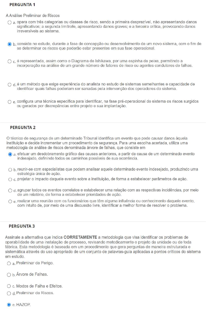 Pergunta 1 0,3 em 0,3 pontos A Análise Preliminar de Riscos Respostas: a. opera com três categorias ou classes de risco, sendo a primeira desprezível, não apresentando danos significativos; a segunda limítrofe, apresentando danos graves; e a terceira crítica, provocando danos irreversíveis ao sistema. b. consiste no estudo, durante a fase de concepção ou desenvolvimento de um novo sistema, com o fim de se determinar os riscos que poderão estar presentes em sua fase operacional. c. é representada, assim como o Diagrama de Ishikawa, por uma espinha de peixe, permitindo a incorporação na análise de um grande número de fatores de risco ou agentes condutores de falhas. d. é um método que exige experiência do analista no estudo de sistemas semelhantes e capacidade de identificar quais falhas poderiam ser sanadas pela intervenção dos operadores do sistema. e. configura uma técnica específica para identificar, na fase pré-operacional do sistema os riscos surgidos ou gerados por discrepâncias entre projeto e sua implantação. Pergunta 2 0,3 em 0,3 pontos O técnico de segurança de um determinado Tribunal identifica um evento que pode causar danos àquela instituição e decide incrementar um procedimento de segurança. Para uma escolha acertada, utiliza uma metodologia de análise de riscos denominada árvore de falhas, que consiste em Respostas: a. efetuar um desdobramento gráfico das causas anteriores, a partir da causa de um determinado evento indesejado, definindo todos os caminhos possíveis de sua ocorrência. b. reunir-se com especialistas que podem analisar aquele determinado evento indesejado, produzindo uma estratégia única de ação. c. projetar o impacto daquele evento sobre a instituição, de forma a estabelecer parâmetros de ação. d. agrupar todos os eventos correlatos e estabelecer uma relação com as respectivas incidências, por meio de um relatório, de forma a estabelecer prioridades de ação. e. realizar uma reunião com os funcionários que têm alguma influência ou conhecimento daquele evento, com intuito de, por meio de uma discussão livre, identificar a melhor forma de resolver o problema. Pergunta 3 0,3 em 0,3 pontos Assinale a alternativa que indica CORRETAMENTE a metodologia que visa identificar os problemas de operabilidade de uma instalação de processo, revisando metodicamente o projeto da unidade ou de toda fábrica. Esta metodologia é baseada em um procedimento que gera perguntas de maneira estruturada e sistemática através do uso apropriado de um conjunto de palavras-guia aplicadas a pontos críticos do sistema em estudo. Respostas: a. Preliminar de Perigo. b. Árvore de Falhas. c. Modos de Falha e Efeitos. d. Preliminar de Riscos. e. HAZOP. Pergunta 4 0,3 em 0,3 pontos Diversas são as técnicas utilizadas no estudo de risco. Existe uma técnica de raciocínio indutivo que faz um exame estruturado e sistemático de um produto, processo ou sistema, existente ou planejado, e busca identificar os perigos e problemas de operação para pessoas, equipamentos, ambiente e/ou objetivos organizacionais. É uma técnica qualitativa baseada no uso de palavras-guia, as quais questionam como a intenção do projeto ou as condições de operação podem não ser atingidas a cada etapa do projeto, processo ou sistema. A que se refere essa descrição? Assinale a alternativa CORRETA. Respostas: a. Análise preliminar de perigos (APP). b. Análise de impactos nos negócios (BIA). c. Análise de perigos e pontos críticos de controle (APPCC). d. Estudo de perigos e operabilidade (HAZOP). e. Análise de causa-raiz (RCA). Pergunta 5 0 em 0,3 pontos “Técnica de análise qualitativa desenvolvida para examinar as linhas de processo, identificando perigos e prevenindo problemas. A metodologia é aplicada também para equipamentos do processo e sistemas.” O texto refere-se a qual técnica de análise de riscos? Assinale a alternativa CORRETA. Respostas: a. Análise de Modos de Falha e Efeitos ou Failure Mode and Efect Analysis (FMEA). b. Análise da operabilidade de perigos ou HAZOP (Hazard and Operability Studies). c. Análise Preliminar de Riscos (APR). d. Análise Preliminar de Perigos (APP). e. Análise de causa raiz, também conhecida como RCA (Root Cause Analysis). Pergunta 6 0,3 em 0,3 pontos O dono de uma serralheria decidiu expandir seu negócio. Na etapa de planejamento, foi realizado o gerenciamento de riscos que consistiu em analisar, identificar e apontar uma resposta aos riscos envolvidos em seu setor de atividade. Foi identificado o risco de incêndio como tendo alta probabilidade e potencial de prejuízos. A resposta definida a esse risco foi contratar um seguro contra incêndios. Foi identificado o risco de acidente de trabalho com serras, e, como resposta, foi determinada a utilização de EPI adequados à atividade e a realização de cursos para os empregados. A região registrou um aumento da atividade de serralheria e o mercado poderia apresentar saturação de produtos; optou-se por manter a decisão de investimento na expansão. Dentro do conceito de gerenciamento de riscos, as respostas dadas aos riscos apresentados são classificadas, respectivamente, como: Respostas: a. transferir, mitigar e aceitar. b. eliminar, aceitar e mitigar. c. transferir, eliminar e aceitar. d. mitigar, eliminar e transferir. e. aceitar, mitigar e aceitar. Pergunta 7 0,3 em 0,3 pontos Assinale a alternativa correta em relação à Gestão de Segurança do Trabalho. Respostas: a. Tomada de Decisão é o processo de comparação entre o risco previsto e os níveis de tolerância estabelecidos para determinado risco. b. A Avaliação de Riscos trata do uso sistemático das informações disponíveis para que a origem de ameaças seja identificada e para que os riscos sejam estimados. c. A Gestão de Riscos implica assegurar a aplicação de processos através da análise do ambiente real e identificação de possíveis perigos, a avaliação do