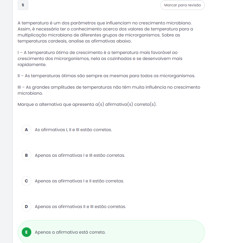 A temperatura é um dos que influenciam no crescimento. Assim, é necessário ter conhecimento acerca dos valores de temperatura para a multiplicação microbiana de diferentes grupos de microrganismos. Sobre as temperaturas cardeais, analise as afirmativas. Marque a alternativa que apresenta a(s) afirmativa(s) correta(s). I - A temperatura ótima de crescimento é a temperatura mais favorável ao crescimento dos microrganismos, nela as cozinhadas e se desenvolvem mais rapidamente. II - As temperaturas ótimas são sempre as mesmas para todos os microrganismos. III - As grandes amplitudes de temperaturas não têm muita influência no crescimento microbiano. A - As afirmativas I, e III estão corretas. B - Apenas as afirmativas I e III estão corretas. C - Apenas as afirmativas I e II estão corretas. D - Apenas as afirmativas II e III estão corretas. E - Apenas a afirmativa I está correta.