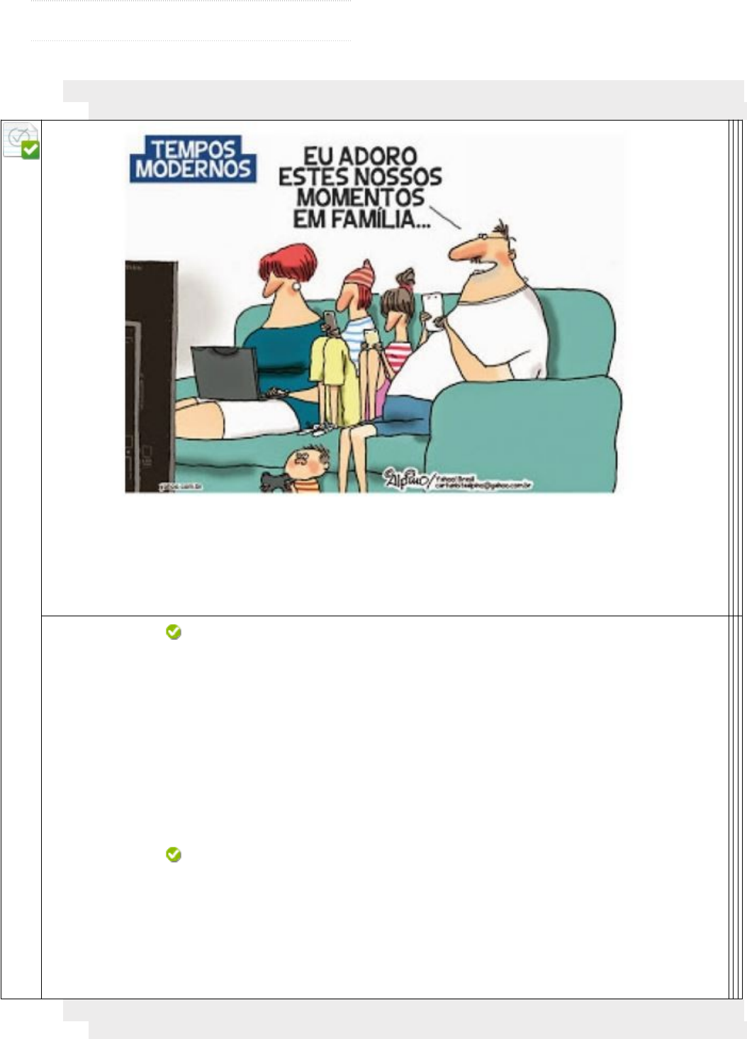 Curso INTERPRETAÇÃO E PRODUÇÃO DE TEXTOS Teste ATIVIDADE TELEAULA II · Pergunta 1 0 em 0 pontos Fonte: 06_CS_PUBLICIDADE_PROPAGANDA.PDF. 2015, p. 17. Disponível em: http://download.inep.gov.br/educacao_superior/enade/provas/2015/06_cs_publicidade_propaganda.pdf. Para cobrar, se você executar uma leitura apenas da mensagem não verbal, sem o texto verbal, conseguirá entender o que é um momento na família, mas não a intenção do autor. Qual é a relação entre o título e a situação representada? Resposta Selecionada: d. A relação estabelecida revela que, apesar do título "tempos modernos" e da proximidade das pessoas no espaço físico, não reflete a união da família. Respostas: a. A relação estabelecida revela os benefícios dos relacionamentos a distância, ou seja, a facilidade na comunicação, a facilidade de interação familiar representada na charge. b. A relação estabelecida revela que as novas tecnologias favorecem as relações familiares, pois os internautas aprendem coisas novas o tempo todo. c. A relação estabelecida revela que as redes sociais são plataformas sociais virtuais compostas por pessoas conectadas e que dividem valores, objetivos, interesses e ideologias comuns à família. d. A relação estabelecida revela que, apesar do título "tempos modernos" e da proximidade das pessoas no espaço físico, não reflete a união da família. e. A relação estabelecida revela que, apesar da falta de proximidade no espaço físico, reflete a união da família. Comentário da resposta: Resposta: D · Pergunta 2 0 em 0 pontos De Bar Em Bar, De Mesa Em Mesa (Nome de uma música de banda regional brasileira, Aviões do forró) De bar em bar, de mesa em mesa Bebendo cachaça, tomando cerveja. De bar em bar, de mesa em mesa Bebendo cachaça, tomando cerveja. (...) Ao designar o mundo, utilizamos termos de um mesmo campo de sentido em que se relacionam a uma espécie, como propostas de sentidos. O texto produzido pressupõe uma organização discursivo-textual adequada à situação de comunicação. Desse modo, identifique qual a predominância do tipo de texto que constitui o fragmento da música: Resposta Selecionada: b. Narrativo. Respostas: a. Descritivo. b. Narrativo. c. Argumentativo. d. Enunciativo. e. Dissertativo. Comentário da resposta: Resposta: B · Pergunta 3 0 em 0 pontos Fonte: F12016QZ.PDF. 2016, p. 23. Disponível em: http://www.comvest.unicamp.br/wp-content/ uploads/2017/02/f12016QZ.pdf. Embora a fotografia seja normalmente um texto exclusivamente não verbal, encontramos aquelas em que o registro contempla também algo escrito. Nesses casos, a composição da mensagem depende da leitura conjunta dos elementos verbais e não verbais. Sendo assim, considerando o outdoor, temos um exemplo de: Resposta Selecionada: c. Metalinguagem. Respostas: a. Metáfora. b. Paráfrase. c. Metalinguagem. d. Operação. e. Causalidade. Comentário da resposta: Resposta: C · Pergunta 4 0 em 0 pontos Fonte: http://rizomas.net/images/phocagallery/charges/thumbs/phoca_thumb_l_educacao-charges-aula-virtual.jpg A comunicação mediada pelo computador traz uma nova abordagem no tratamento dos gêneros textuais discursivos, na medida em que repensa a relação entre as pessoas e suas práticas sociais. A internet, para além da revolução tecnológica, seja uma revolução dos modos sociais de interação por meio da língua. Desse modo, considerando a charge, pode-se concluir que: Resposta Selecionada: e. Como novas tecnologias são incorporadas à vida cotidiana. Respostas: a. O conhecimento da tecnologia digital está totalmente democratizado no Brasil. b. A preocupação social é fazer um planejamento para o domínio da informática. c. O apelo à inclusão digital atrai os jovens para o universo de computação. d. A dificuldade de acesso ao mundo digital torna um cidadão excluído social. e. Como novas tecnologias são incorporadas à vida cotidiana. Comentário da resposta: Resposta: E
