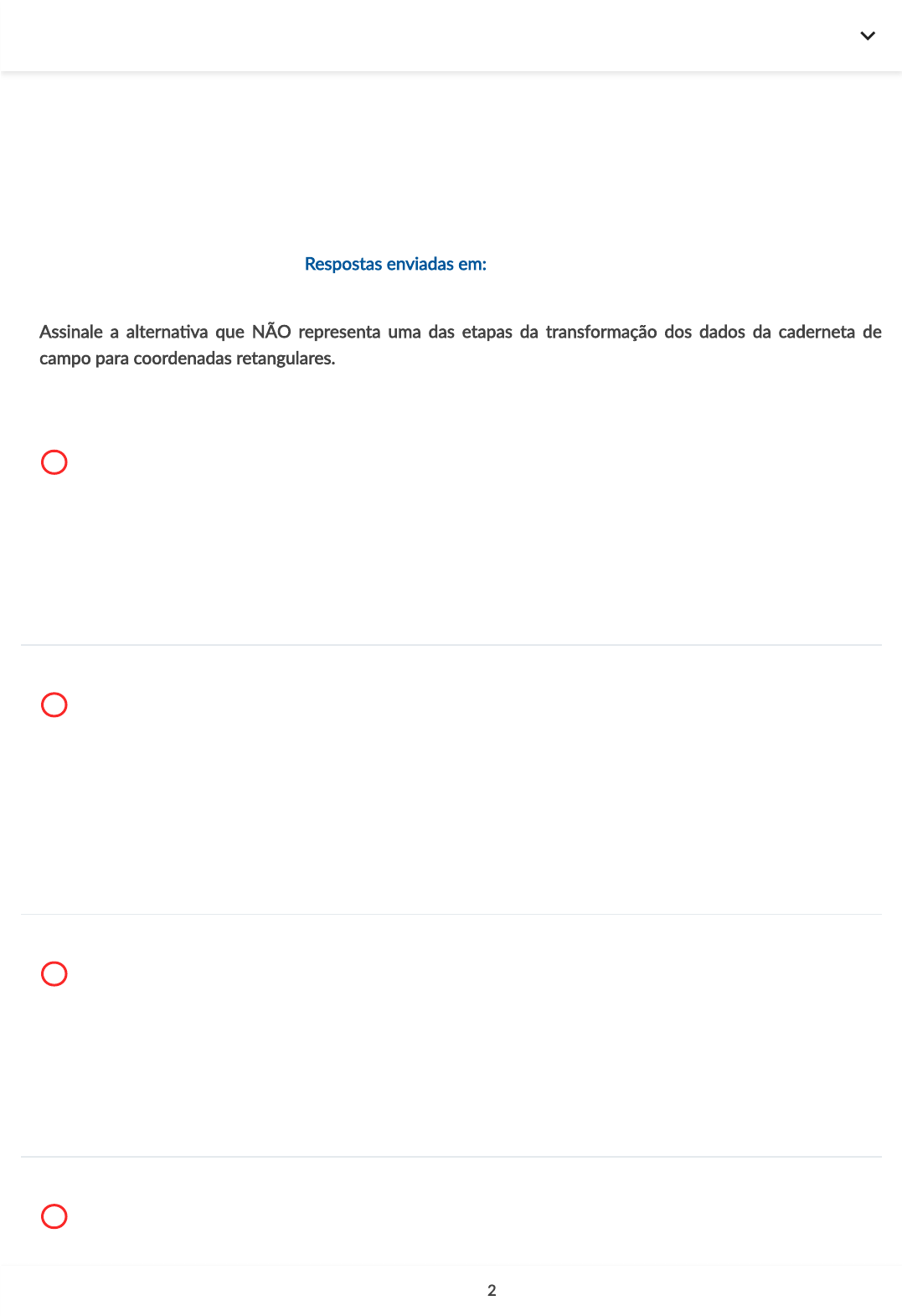24/04/2023, 21:17 Planilha de coordenadas I :: Plataforma A https://metropolitanasp.grupoa.education/sagah/object/default/47313205 1/2 Exercícios Respostas enviadas em: 24/04/2023 21:16 2. Assinale a alterna�va que NÃO representa uma das etapas da transformação dos dados da caderneta de campo para coordenadas retangulares. Resposta incorreta. A. Cálculo do erro de fechamento linear e sua distribuição. O cálculo do erro de fechamento linear e sua distribuição é uma etapa da transformação dos dados da caderneta de campo para coordenadas retangulares. Essa etapa consiste em determinar o erro linear e verificar a tolerância do erro linear. Resposta incorreta. B. Cálculo das coordenadas rela�vas corrigidas. O cálculo das coordenadas rela�vas corrigidas é uma etapa da transformação dos dados da caderneta de campo para coordenadas retangulares. Essa etapa consiste em distribuir os erros lineares nas coordenadas não corrigidas; esse processo pode ser proporcional às distâncias ou às coordenadas rela�vas. Resposta incorreta. C. Cálculo das coordenadas rela�vas não corrigidas. O cálculo das coordenadas rela�vas não corrigidas é uma etapa da transformação dos dados da caderneta de campo para coordenadas retangulares. Essa etapa relaciona os ângulos corrigidos e as distâncias medidas em campo. Você não acertou! D. Cálculo do fechamento angular e de suas distribuições. 2 de 5 perguntas Anterior Próximo CC 24/04/2023, 21:17 Planilha de coordenadas I :: Plataforma A https://metropolitanasp.grupoa.education/sagah/object/default/47313205 2/2 O cálculo do fechamento angular e de suas distribuições é uma etapa da transformação dos dados da caderneta de campo para coordenadas retangulares. Essa etapa consiste na determinação do erro angular e nas tolerâncias do erro angular. Resposta correta. E. Cálculo do norte magné�co. As etapas para a transformação dos dados da caderneta de campo para coordenadas retangulares são: 1. Calcular o fechamento angular de sua distribuição. 2. Calcular os azimutes de todos os alinhamentos. 3. Calcular as coordenadas rela�vas (não corrigidas). 4. Calcular o erro de fechamento linear e de sua distribuição. 5. Calcular as coordenadas rela�vas (corrigidas). 6. Calcular as coordenadas absolutas. Voltar Próximo 2 de 5 perguntas Anterior Próximo CC