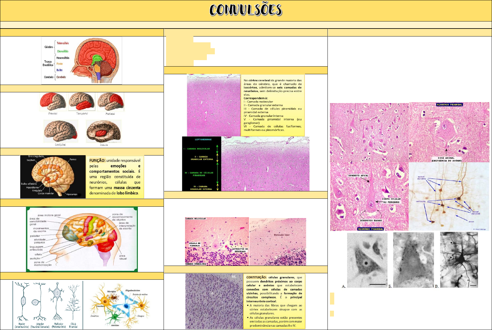 ANATOMIA CÓRTEX CEREBRAL LOBOS CEREBRAIS SISTEMA LÍMBICO FUNÇÕES DO CÓRTEX CEREBRAL TIPOS BÁSICOS DE NEURÔNIO CÉLULAS DA GLIA: ASTRÓCITOS: forma de estrela, alimentação e suporte físico dos neurônios OLIGODENDRÓCITOS: mielinização dos axônios no SNC CÉLULAS DE SCHWANN: mielinização dos axônios no SNP CÉLULAS SATÉLITES: suporte físico para os neurônios do SNP MICROGLIAS: Digerem parte dos neurônios mortos HISTOLOGIA CÓRTEX CEREBRAL CAMADA MOLECULAR (I) • Camada mais superficial, localizada abaixo da leptomeninge. • Possui poucas células (células horizontais, ou cajal → neurônios intracorticais de associação que possuem dendritos e axônios na direção horizontal) CAMADA GRANULAR EXTERNA E INTERNA (II-IV) CÉLULAS PIRAMIDAIS (III) As células piramidais são chamadas assim devido ao formato triangular do corpo celular. Podem ser pequenas, médias, grandes e gigantes (células piramidais de Betz do córtex motor). As células piramidais têm dois tipos de dendritos, o apical (um dendrito só por célula) e basais (vários dendritos por célula). O apical prolonga o ápice da pirâmide e ramifica-se nas camadas superiores. Os basais são mais curtos e ramificam-se nas proximidades do corpo celular. O axônio tem origem na região basal da célula e direção descendente, ganhando a substância branca como fibra eferente do córtex (sistema motor). As células piramidais podem ser encontradas em todas as camadas, mas predominam nas camadas III e V ou piramidais externa e interna, consideradas as principais camadas efetoras do córtex. A. Células Betz na Camada V do córtex motor primário humano B. Célula Betz gigante imunorreativa para parvalbumina, com sinapses intensamente positivas em contato com seu soma C. célula Betz gigante e neurônios piramidais de tamanho médio (asteriscos) da camada V CAMADA PIRAMIDAL INTERNA: Formada por grandes neurônios piramidais, alguns neurônios estrelados e piramidais invertidos (neurônios de Martinotti) Aqui também existe uma banda de fibras conhecida como banda interna de Baillarger. No córtex motor primário existe neurônios piramidais gigantes que recebem o nome de neurônios de Betz. Esta dá origem a aproximadamente 3% do trato corticoespinal CONVULSÃO DEFINIÇÕES • Manifestação de um fenômeno electro-fisiológico anormal temporário que ocorre no cérebro (descarga bio-energética) e que resulta numa sincronização anormal da atividade elétrica neuronal. • Estas alterações podem refletir-se a nível da tonicidade muscular (gerando contrações involuntárias da musculatura, como movimentos desordenados, ou outras reações anormais como desvio dos olhos e tremores), alterações do estado mental, ou outros sintomas psíquicos. • EPILEPSIA: síndrome médica na qual existem convulsões recorrentes e involuntárias, embora possam ocorrer convulsões em pessoas que não sofrem desta condição médica. CAUSAS DE CONVULSÃO TCE, Meningite, Desidratação grave, Intoxicações ou reações a medicamentos, Hipoxemia perinatal, Hipoglicemia, Epilepsias (crises convulsivas repetitivas não relacionadas a causas acima relacionadas; têm forte herança familiar), Convulsão Febril, Tumores (primários ou metastáticos), Eclâmpsia. EPILEPSIA Grupo de transtornos neurológicos de longa duração caracterizados por ataques de duração e intensidade variável, que vão desde episódios de curta duração e praticamente imperceptíveis até longos períodos de agitação vigorosa. É o resultado de atividade excessiva e anormal das células nervosas do córtex cerebral. SINAIS SINAIS E SINTOMAS DE UMA CRISE EPILÉPTICA: (distúrbios da consciência, dos movimentos ou da sensibilidade) refletem a ativação da parte do cérebro afetada por esta atividade excessiva. Pode ser afetada apenas uma parte do cérebro (crise parcial ou focal) — como ocorre na síndrome de Landau-Kleffner, que afeta tipicamente a região temporofrontal esquerda, causando transtornos de fala e linguagem ou toda a extensão dos dois hemisférios cerebrais (crise generalizada). TIPOS SINTOMÁTICAS: causa conhecida ou fortemente inferida. CRIPTOGÊNICAS: não existe uma causa conhecida ou presumível. IDIOPÁTICAS: a causa é genética, familiar Ver PDFs http://anatpat.unicamp.br/bineuhipocamponlhe.html EPILEPSIA DO LOBO TEMPORAL MESIAL ASSOCIADA À ESCLEROSE HIPOCAMPAL HISTOLOGIA DA ESCLEROSE MESIAL PONTO DE VISTA ANATOMOPATOLÓGICO: a esclerose hipocampal é caracterizada por perda neuronal e gliose, especialmente das células do setor de Sommer (CA1 e prosubiculum) e dos neurônios da região hilar, com relativa preservação de CA2, subiculum e giro denteado. OBSERVA-SE: reorganização axonal, caracterizada por brotamentos de colaterais axônicas das células granulares (as fibras musgosas) na região da camada molecular interna do giro denteado. Associado à perda neuronal, observa-se também na esclerose hipocampal a dispersão das células granulares. Esta é caracterizada pela perda da justaposição habitual das células granulares na camada granular do giro denteado, produzindo da sua espessura e dos espaços intercelulares. Presença de distúrbios de migração das células piramidais e granulares, bem como alteração no padrão de laminação da formação hipocampal em camundongos → sugerem → participação de fatores genéticos influenciando a dispersão das células granulares. Em estudo experimental com ratos epilépticos após status epilepticus-induzido pela pilocarpina, propõem que a dispersão das células granulares seja decorrente da perda neuronal induzida pelas crises epilépticas, que levaria ao estiramento mecânico do tecido. Na ELTM associada à esclerose hipocampal pode-se encontrar comprometimento de outras estruturas mesiais do lobo temporal, do córtex entorrinal, bem como também anormalidades da substância branca e neocórtex do lobo temporal. Presença de neurônios ectópicos e infilt