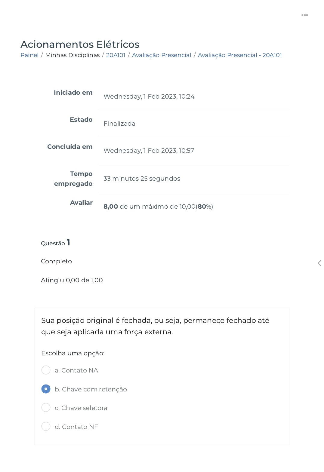 Painel / Minhas Disciplinas / 20A101 / Avaliação Presencial / Avaliação Presencial - 20A101 Acionamentos Elétricos Iniciado em Wednesday, 1 Feb 2023, 10:24 Estado Finalizada Concluída em Wednesday, 1 Feb 2023, 10:57 Tempo empregado 33 minutos 25 segundos Avaliar 8,00 de um máximo de 10,00(80%) Questão 1 Completo Atingiu 0,00 de 1,00 Sua posição original é fechada, ou seja, permanece fechado até que seja aplicada uma força externa. Escolha uma opção: a. Contato NA b. Chave com retenção c. Chave seletora d. Contato NF https://ava.politecnicabr.com.br/my/ https://ava.politecnicabr.com.br/course/view.php?id=935 https://ava.politecnicabr.com.br/course/view.php?id=935#section-11 https://ava.politecnicabr.com.br/mod/quiz/view.php?id=30532 https://ava.politecnicabr.com.br/ Questão 2 Completo Atingiu 1,00 de 1,00 As funções de um dispositivo de partida de motor são classi�cadas em quais categorias? Escolha uma opção: Questão 3 Completo Atingiu 1,00 de 1,00 As botoeiras possuem cores de�nidas por normas de acordo com a sua função. Faça a relação entre as cores Vermelho: Verde ou preto: Amarelo: Branco ou azul: a. Desligamento, Proteção e Comutação b. Seccionamento; Proteção contra curtos-circuitos e contra sobrecargas e Comutação c. Proteção contra curtos-circuitos, Proteção contra sobrecargas e Rompimento d. Desligamento, Proteção e seccionamento parar, desligar ou botão de emergência ligar, partida iniciar um retorno, eliminar uma condição perigosa qualquer função diferente das anteriores https://ava.politecnicabr.com.br/ Questão 4 Completo Atingiu 1,00 de 1,00 A norma NBR 7094 classi�ca os motores de gaiola em cinco categorias, conforme as características de conjugado em relação à velocidade e à corrente de partida. Não faz parte dessas categorias: Escolha uma opção: a. Categoria NH b. Categoria N c. Categoria HY d. Categoria H e. Categoria NY https://ava.politecnicabr.com.br/ Questão 5 Completo Atingiu 1,00 de 1,00 São funções da soft-starter exceto em: Escolha uma opção: Questão 6 Completo Atingiu 0,00 de 1,00 A Chave seletora possui duas ou mais posições e permite selecionar uma entre várias posições em um determinado processo com (C) ponto de contato comum. Também pode ser chamada de chave comutadora, contato three-way ou contato paralelo. Escolha uma opção: a. Conjugado na partida b. Proteção do acionamento por sobrecarga c. Controle das rampas de aceleração e desaceleração d. Limitação de corrente ajustável e. Frenagem por injeção de corrente alternada Verdadeiro Falso https://ava.politecnicabr.com.br/ Questão 7 Completo Atingiu 1,00 de 1,00 Sua posição original é aberta, ou seja, permanece aberto até que seja aplicada uma força externa. Escolha uma opção: Questão 8 Completo Atingiu 1,00 de 1,00 Quando uma bobina é percorrida por uma corrente elétrica, cria- se um campo magnético dirigido conforme o eixo da bobina e com seu valor proporcional à corrente. Que principio é esse? Escolha uma opção: a. Contato NA b. Chave seletora c. Contato NF d. Chave com retenção a. Principio de funcionamento de um motor trifásico b. Principio de funcionamento de um motor bobinado c. Principio de funcionamento de um motor pulsante d. Principio de funcionamento de um motor monofásico https://ava.politecnicabr.com.br/ Questão 9 Completo Atingiu 1,00 de 1,00 As chaves de partida soft-starters são destinadas ao comando de motores de corrente contínua e alternada, assegurando a aceleração e desaceleração progressivas e permitindo uma adaptação da velocidade às condições de operação. Escolha uma opção: Questão 10 Completo Atingiu 1,00 de 1,00 Parâmetros do motor de�nem as características nominais do motor, como, por exemplo, ajuste da corrente do motor, fator de serviço. Escolha uma opção: Verdadeiro Falso Verdadeiro Falso https://ava.politecnicabr.com.br/ © 2022 - Escola Politécnica Brasileira Entre em Contato https://www.politecnicabr.com.br 0800 084 2627 0800 084 2627 Links Úteis Dicas da nossa Diretora Acadêmica Planner de Estudos Declaração de Matrícula Orientações do AVA Abertura de Ticket Fale com o Tutor Cronograma de Estudos Manual de Estágio Manual de Competência Siga-nos nas redes sociais https://ava.politecnicabr.com.br/mod/quiz/0 https://www.politecnicabr.com.br/ https://soundcloud.com/user-501638417/sets/escola-politecnica-brasileira https://storage.googleapis.com/sirius-pubstore/semestre_plannerdeestudo%20poli.pdf https://storage.googleapis.com/sirius-pubstore/declaracao_matricula.pdf https://storage.googleapis.com/sirius-pubstore/orientacoes_ava.pdf https://storage.googleapis.com/sirius-pubstore/abertura_ticket.pdf https://storage.googleapis.com/sirius-pubstore/fale_com_tutor.pdf https://storage.googleapis.com/sirius-pubstore/cronograma_estudos.pdf https://storage.googleapis.com/sirius-pubstore/manual_estagio.pdf https://storage.googleapis.com/sirius-pubstore/manual_competencia.pdf https://www.facebook.com/politecnicabr https://www.instagram.com/politecnicabr_oficial https://ava.politecnicabr.com.br/