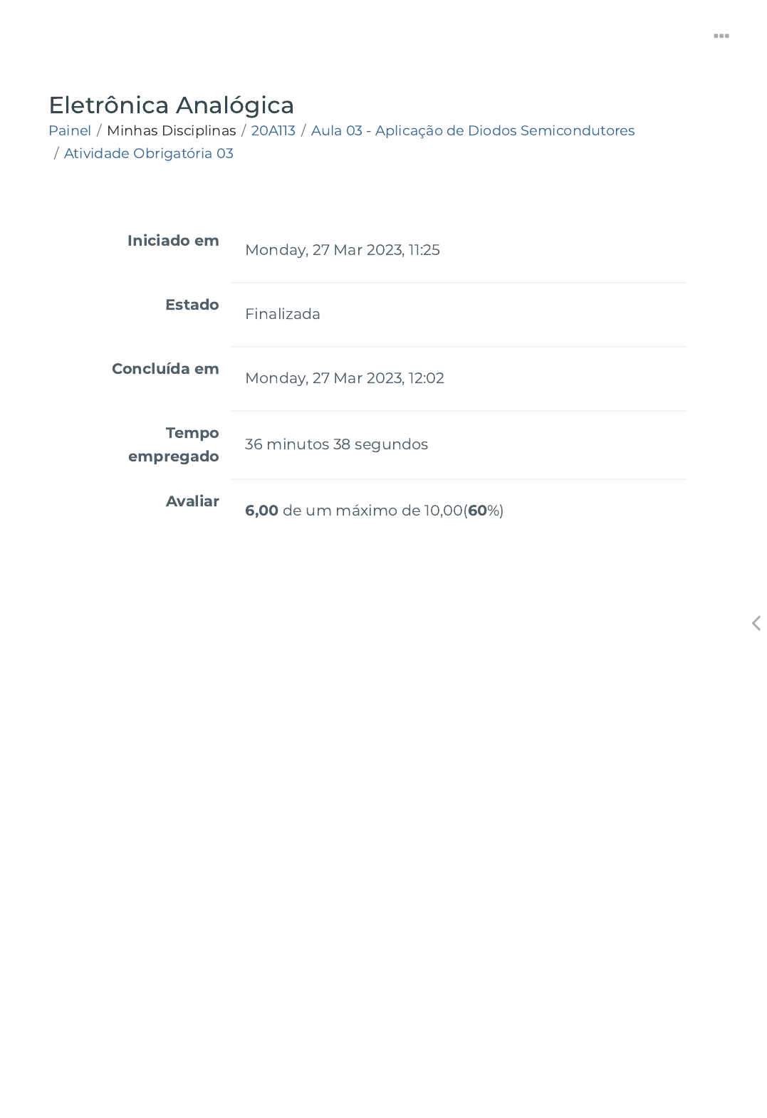 Painel / Minhas Disciplinas / 20A113 / Aula 03 - Aplicação de Diodos Semicondutores / Atividade Obrigatória 03 Eletrônica Analógica Iniciado em Monday, 27 Mar 2023, 11:25 Estado Finalizada Concluída em Monday, 27 Mar 2023, 12:02 Tempo empregado 36 minutos 38 segundos Avaliar 6,00 de um máximo de 10,00(60%) https://ava.politecnicabr.com.br/my/ https://ava.politecnicabr.com.br/course/view.php?id=949 https://ava.politecnicabr.com.br/course/view.php?id=949#section-5 https://ava.politecnicabr.com.br/mod/quiz/view.php?id=30930 https://ava.politecnicabr.com.br/ Questão 1 Correto Atingiu 2,00 de 2,00 Qual a Tensão e a Corrente RMS na Carga do Circuito abaixo. Vrms = 5,5V e Irms = 550mA Escolha uma opção: Vrms = 55V e Irms = 5,50A Vrms = 5,5V e Irms = 550A Vrms = 5,5V e Irms = 550mA Vrms = 5,5A e Irms = 550mV https://ava.politecnicabr.com.br/ Questão 2 Incorreto Atingiu 0,00 de 2,00 Para o circuito reti�cador abaixo: Qual a tensão Média e E�caz na Carga? Escolha uma opção: 1,051 V 1051 V 10,51 V 1,05 A https://ava.politecnicabr.com.br/ Questão 3 Correto Atingiu 2,00 de 2,00 O que é Tensão E�caz (ou Tensão RMS) ? Escolha uma opção: Questão 4 Correto Atingiu 2,00 de 2,00 Ripple é o componente de corrente alternada (Vca) que se sobrepõe ao valor médio da tensão de uma fonte de corrente contínua (Vcc). A origem da ondulação normalmente está associada à utilização de carregadores baseados em reti�cadores. Escolha uma opção: É a tensão máxima de um sinal AC. É o valor de tensão que um sinal alternado teria se ele fosse contínuo puro É o valor de pico de um sinal DC É o valor médio de uma tensão alternada ao longo do tempo Verdadeiro Falso https://ava.politecnicabr.com.br/ Questão 5 Incorreto Atingiu 0,00 de 2,00 Calcule a corrente e�caz na Carga RL: Escolha uma opção: a. 2, 09 A b. 3, 09 A c. 0, 09 A d. 1,09 A Entre em Contato https://www.politecnicabr.com.br 0800 084 2627 0800 084 2627 Links Úteis Dicas da nossa Diretora Acadêmica Planner de Estudos Declaração de Matrícula Orientações do AVA Abertura de Ticket Fale com o Tutor Cronograma de Estudos Manual de Estágio Manual de Competência https://www.politecnicabr.com.br/ https://soundcloud.com/user-501638417/sets/escola-politecnica-brasileira https://storage.googleapis.com/sirius-pubstore/semestre_plannerdeestudo%20poli.pdf https://storage.googleapis.com/sirius-pubstore/declaracao_matricula.pdf https://storage.googleapis.com/sirius-pubstore/orientacoes_ava.pdf https://storage.googleapis.com/sirius-pubstore/abertura_ticket.pdf https://storage.googleapis.com/sirius-pubstore/fale_com_tutor.pdf https://storage.googleapis.com/sirius-pubstore/cronograma_estudos.pdf https://storage.googleapis.com/sirius-pubstore/manual_estagio.pdf https://storage.googleapis.com/sirius-pubstore/manual_competencia.pdf https://ava.politecnicabr.com.br/ © 2022 - Escola Politécnica Brasileira Siga-nos nas redes sociais https://ava.politecnicabr.com.br/mod/quiz/0 https://www.facebook.com/politecnicabr https://www.instagram.com/politecnicabr_oficial https://ava.politecnicabr.com.br/