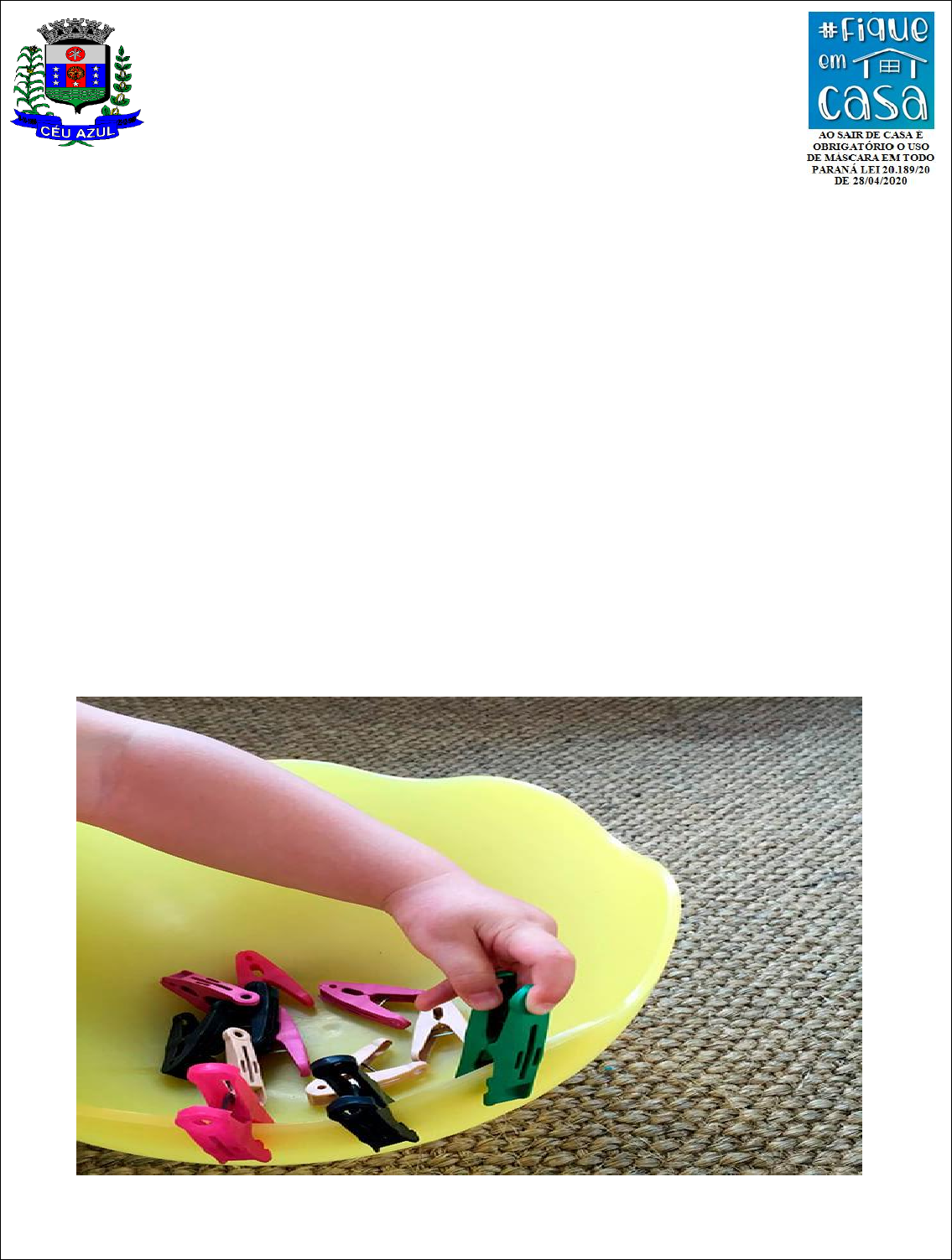 CADERNO DE ATIVIDADES EDUCAÇÃO INFANTIL – 0 A 3 ANOS (CRECHE) BERÇÁRIO PERÍODO DE REALIZAÇÃO DAS ATIVIDADES: DE 09/11/2020 A 13/11/2020. NOME DO ALUNO (A) : ______________________________________________________________________ TEMA GERADOR: NOME DA CRIANÇA. FORMAS GEOMÉTRICAS E CORES. 09/11/2020 – SEGUNDA-FEIRA CAMPO DE EXPERIÊNCIA: O EU, O OUTRO E O NÓS. (EI0/01EO03) INTERAGIR COM CRIANÇAS DA MESMA FAIXA ETÁRIA E ADULTOS AO EXPLORAR ESPAÇOS, MATERIAIS, OBJETOS E BRINQUEDOS. ATIVIDADE 1: PEGUE UM POTE COM PRENDEDORES DE ROUPAS E UM BALDE, DEIXE A CRIANÇA MANIPULAR LIVREMENTE E FAZER TENTATIVAS DE ABRIR O PRENDEDOR, SENTIR A TEXTURA E COLOCAR O PRENDEDOR NO BALDE E ETC. RUA: NITERÓI, 280 - BAIRRO UNIÃO - FONE: (45) 3121-1065 E-MAIL: CEMEI21SANTACLARA@HOTMAIL.COM CEP: 85.840.000 CÉU AZUL - PR 10/11/2020 – TERÇA-FEIRA CAMPO DE EXPERIÊNCIA: ESPAÇOS, TEMPOS, QUANTIDADES, RELAÇÕES E TRANSFORMAÇÕES. (EIO/01ET05) MANIPULAR MATERIAIS DIVERSOS E VARIADOS PARA COMPARAR AS DIFERENÇAS E SEMELHANÇAS ENTRE ELES. ATIVIDADE 2: NESTA ATIVIDADE AS CRIANÇAS IRÃO MANIPULAR AS FORMAS GEOMÉTRICAS FEITAS DE E.V.A QUE RECEBERAM JUNTO COM O CADERNO DE ATIVIDADES, DEIXE QUE ELES BRINQUEM LIVREMENTE, EXPERIMENTANDO AS DIFERENTES TEXTURAS. 11/11/2020 – QUARTA –FEIRA CAMPO DE EXPERIÊNCIA: CORPO, GESTOS E MOVIMENTOS. (EI0/01CG02) REALIZAR MOVIMENTOS COORDENADOS COM AS MÃOS. ATIVIDADE 3: PARA ESTA ATIVIDADE PEGUE UM BALDE E UMA BOLINHA, SE CASO NÃO TIVER BOLINHA PODE FAZER UMA DE PAPEL OU DE MEIA, NESTA ATIVIDADE A INTENÇÃO DA BRINCADEIRA É DE QUE A CRIANÇA CONSIGA COLOCAR A BOLINHA DENTRO DO BALDE. SE DIVIRTAM! 12/11/2020 – QUINTA-FEIRA CAMPO DE EXPERIÊNCIA: TRAÇOS, SONS, CORES E FORMAS. (EI0/01TS02) MANUSEAR E EXPLORAR DIFERENTES MATERIAIS E SUPERFÍCIES DESENVOLVENDO AS SENSAÇÕES. ATIVIDADE 4: PINTURA SEM SUJEIRA! NESTA ATIVIDADE VAMOS USAR O PAPELÃO COM TINTA QUE RECEBEU DO CEMEI. DEIXE SEU FILHO (A) MANUSEAR, SENTIR A TEXTURA E DESENVOLVER AS SENSAÇÕES, DURANTE A BRINCADEIRA VÁ NOMEANDO AS CORES PRIMÁRIAS. “POR VOLTA DOS 2 MESES, OS OLHOS DO BEBÊ SE AJUSTAM, E ELE PASSA A DIFERENCIAR CORES. NESSA FASE, AS CORES PRIMÁRIAS CHAMAM MAIS A ATENÇÃO DELE, ENTÃO DÊ PREFERÊNCIA A BRINQUEDOS EM TONS DE VERMELHO, AMARELO E AZUL. FORMAS VARIADAS E PADRONAGEM DOS TECIDOS TAMBÉM ATRAEM O FOCO DO BEBÊ.” CONTINUAÇÃO DA REPORTAGEM DISPONÍVEL NO LINK>> https://brasil.babycenter.com/l25011357/estimulando-a-vis%C3%A3o- fotos#:~:text=Cores%20prim%C3%A1rias,atraem%20o%20foco%20do%20beb%C3%AA<< https://brasil.babycenter.com/l25011357/estimulando-a-vis%C3%A3o-fotos#:~:text=Cores%20prim%C3%A1rias,atraem%20o%20foco%20do%20beb%C3%AA https://brasil.babycenter.com/l25011357/estimulando-a-vis%C3%A3o-fotos#:~:text=Cores%20prim%C3%A1rias,atraem%20o%20foco%20do%20beb%C3%AA 13/11/2020 - SEXTA-FEIRA CAMPO DE EXPERIÊNCIA: ESCUTA, FALA, PENSAMENTOS E IMAGINAÇÃO. (EI0/01EF01) PARTICIPAR DE BRINCADEIRAS E CANTIGAS TÍPICAS ENVOLVENDO OS NOMES DAS CRIANÇAS DA SUA CONVIVÊNCIA. ATIVIDADE 5: ATIVIDADE MUSICAL! ASSISTA AO VÍDEO QUE SERÁ ENVIADO PELOS PROFESSORES NO GRUPO DE WHATSAPP ENSINANDO A CANTAR A MÚSICA DO ZÉ BOCHECHA, ONDE INCENTIVA A FALAR O NOME DA CRIANÇA, LOGO CANTE COM O SEU FILHO (A) FALANDO O NOME DE TODOS DA CASA. ZÉ BOCHECHA! A MARIA (NOME DA CRIANÇA) OLHOU PRA CÁ A MARIA OLHOU PRA LÁ QUANDO VIU O ZÉ BOCHECHA COMEÇOU A BOCHECHAR... BOCHECHA (FAZER O SOM DA BOCA) O JOÃO (NOME DA CRIANÇA) OLHOU PRA CÁ, O JOÃO OLHOU PRA LÁ QUANDO VIU O ZÉ BOCHECHA COMEÇOU A BOCHECHAR... BOCHECHA (FAZER O SOM DA BOCA) BATE PALMA PARA PARAR DE CANTAR...