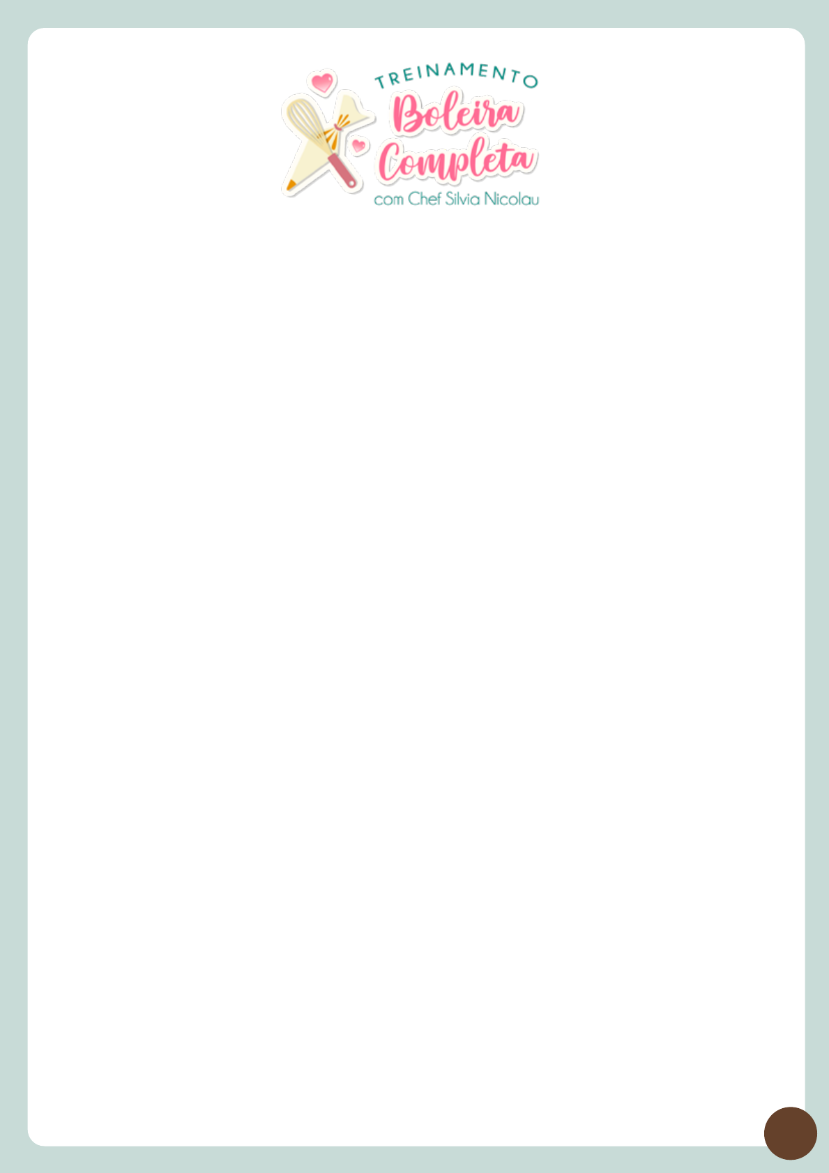 FÓRMULAS PARA MODIFICAR O TAMANHO DE UM BOLO FÓRMULA PARA CALCULAR O VOLUME DAS FORMAS RETANGULARES OU QUADRADAS Comprimento x Largura x Altura FÓRMULA PARA CALCULAR O VOLUME DAS FORMAS REDONDAS Raio² (raio é a metade do diâmetro da forma e ² é esse número vezes ele mesmo) x 3,14 x Altura PARA SABER O VOLUME DAS FORMAS SEM FAZER CÁLCULOS Encha a forma de água e meça para saber quanto mililitros ela comporta. Atenção: • Para fazer os cálculos a seguir é necessário ter a receita original como referência, com medi- das padrão (em gramas, ml e unidades). • Os cálculos só se aplicam para aumentar ou diminuir os tamanhos dos bolos, mantendo os mesmos ingredientes, sem fazer alterações de ingredientes ou sabores. PARA FAZER O BOLO EM FORMA MENOR FORMA ORIGINAL DO BOLO BABY SHARK: 18X10cm = volume 2.540ml OUTRA FORMA QUE QUERO USAR: 15X10CM = volume 1.766ml VOLUME PRETENDIDO/ VOLUME ORIGINAL = 0,7 (arredondei para cima) > Para fazer o bolo menor, multiplique todos os ingredientes por 0,7. PARA FAZER O BOLO EM FORMA MAIOR FORMA ORIGINAL DO BOLO BABY SHARK: 18X10cm = volume 2.540ml OUTRA FORMA QUE QUERO USAR: 22X10CM = volume 3.800ml VOLUME PRETENDIDO/ VOLUME ORIGINAL = 1,5 (arredondei para cima) > Para fazer o bolo maior, multiplique todos os ingredientes por 1,5. Obs.: o cálculo da conversão não deve ser aplicado à cobertura, porque ela não está relacionada com “volume”, ou seja, a cobertura não está “dentro” da forma. A cobertura está relacionada à parte de fora (superfície) do bolo. A cada bolo que fizer, anote a quantidade de cobertura que usou, para padronizar. 1