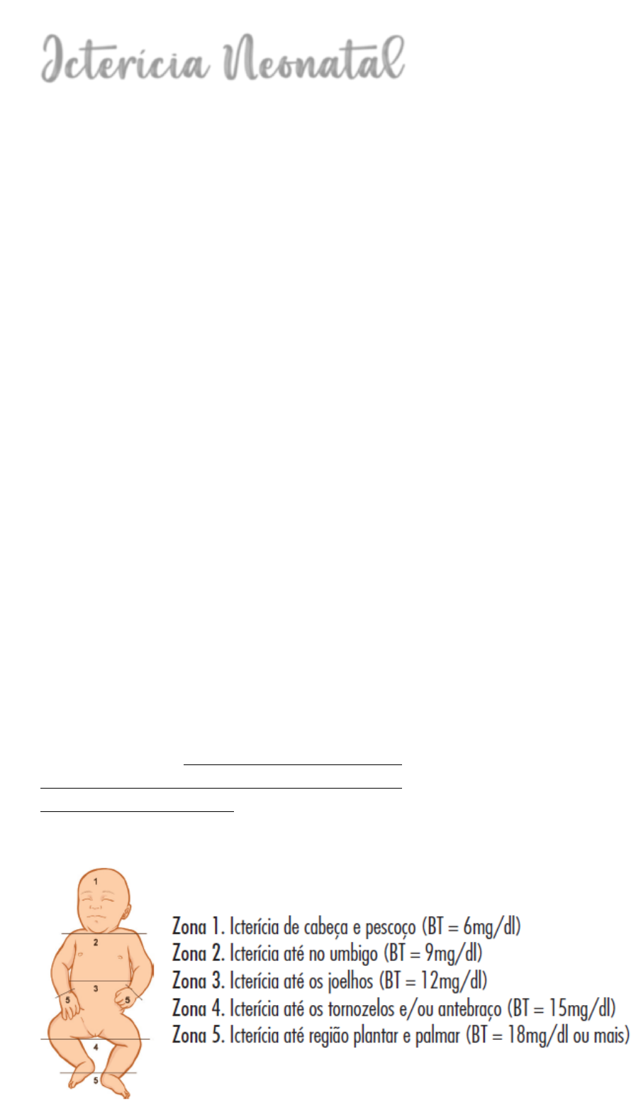 1 Khilver Doanne Sousa Soares Material restrito, favor não reproduzir nem distribuir sua posse!!! Nenhum serviço de impressão e xerox pode redistribuir este material a outros clientes!!! Icterícia Neonatal A icterícia é definida como coloração amarelada de pele e mucosas, provocada por um aumento da fração indireta da bilirrubina, ou da sua fração direta (menos comum). Observamos icterícia em cerca de 60% dos RN a termo e em 80% dos RN pré-termo durante a primeira semana de vida. A maior preocupação com esta condição deriva do fato de que, em níveis muito elevados, a bilirrubina não conjugada, ou bilirrubina indireta pode cruzar a barreira hematoencefálica, levando ao desenvolvimento de um quadro de encefalopatia bilirrubínica. O pico da hiperbilirrubinemia indireta ocorre no recém-nascido (RN) termo entre o 3º e 5º dia (com declínio em torno do 7o dia) e no RN pré-termo entre o 5º e 7º dia (com declínio lento). A BI é um produto da degradação do grupamento heme, que deriva da hemoglobina (75%) e de outras proteínas (25%). A BI é carreada pela albumina plasmática até o fígado; é convertida em bilirrubina conjugada, ou Bilirrubina Direta (BD), com auxílio da enzima uridilglucoroniltransferase. Com a bile, a BD chega ao intestino delgado e é reduzida a estercobilina; uma pequena qtd é desconjugada pela enzima betaglicuronidase formando-se novamente BI Este processo de captação e conjugação não está plenamente desenvolvido nos primeiros dias de vida. Icterícia Fisiológica É um quadro comum, benigno e autolimitado. O RN produz até 2 ou 3x mais bilirrubina que um adulto, levando em conta seu peso corporal (a meia-vida de suas hemácias é menor; 70 – 90 dias; e sua reabsorção entérica da BI também está aumentada). No quadro de icterícia fisiológica em um RN a termo, a icterícia costuma ser visível entre o 2º e o 3º dia de vida, com um pico nos níveis de BI entre o 2º e o 4º dia de vida. É definida como concentração sérica de bilirrubina indireta (BI) > 1,5mg/dL ou de bilirrubina direta (BD) >1,5 mg/dL, desde que a BD represente mais que 10-20% do valor de bilirrubina total (BT). Sua maior complicação é a encefalopatia bilirrubínica crônica (Kernicterus). TOMAR CUIDADO COM AS SEGUINTES APRESENTAÇÕES: Icterícia que surge nas primeiras 24–36 horas de vida; Níveis séricos de bilirrubina que aumentam numa taxa maior do que 5 mg/kg/dia; Níveis séricos de bilirrubina maiores do que 12 mg/dl em um RN a termo ou 14 mg/dl em um RN pré-termo; Icterícia que persiste por mais do que 10– 14 dias; Aumento nos níveis de BD. É importante delimitar as zonas de Kramer no RN: 2 Khilver Doanne Sousa Soares Material restrito, favor não reproduzir nem distribuir sua posse!!! Nenhum serviço de impressão e xerox pode redistribuir este material a outros clientes!!! A progressão da icterícia se faz de maneira craniocaudal e, deste modo, em RN a termo saudáveis, a constatação de icterícia somente na face (zona I) está associada a valores de BI que variam de 4 a 8 mg/dl; a presença de icterícia desde a cabeça até a cicatriz umbilical (zona II) corresponde a valores desde 5 até 12 mg/dl; já os RN a termo com icterícia na zona III podem apresentar BI superior a 15 mg/dl. OU SEJA, ICTERÍCIA ATÉ O UMBIGO?!? PERIGO!!! Resumindo. . . HIPERBILIRRUBINEMIA INDIRETA: Icterícia fisiológica? Reflete a adaptação neonatal ao metabolismo da bilirrubina; Surge após 24 horas, atinge o pico entre 3º e 5º dias de vida e desaparece após o 7o dia; Evolução benigna. Icterícia Não Fisiológica!!! Fatores de risco para desenvolvimento de hiperbilirrubinemia significante em RN ≥ 35 semanas de idade gestacional: Resumindo . . . HIPERBILIRRUBINEMIA INDIRETA: Icterícia patológica? Icterícia precoce (surge antes de 24 horas de vida); BT > 4mg/dL no sangue do cordão; Incremento de BI ≥ 0,5 mg/dL/hora entre 4h e 8 h nas primeiras 36 horas; Aumento de BI ≥ 5 mg/dL/dia; Icterícia que se prolonga por mais de 10 dias no RN termo e 21 dias no prematuro. Normograma para estratificação do risco para hiperbilirrubinemia 3 Khilver Doanne Sousa Soares Material restrito, favor não reproduzir nem distribuir sua posse!!! Nenhum serviço de impressão e xerox pode redistribuir este material a outros clientes!!! Com ele podemos definir que: - RN na Zona de Alto Risco (percentil maior que 95): Iniciar fototerapia. - RN na zona de risco intermediário alto (percentil entre 75 e 95): Considerar fototerapia de acordo com a idade gestacional e repetir a dosagem de bilirrubina em 12 a 24 horas. - RN na zona de risco intermediário baixo e baixo risco (percentil menor que 75): Alta hospitalar e reavaliação em 72 horas. Condições responsáveis pelos quadros considerados não fisiológicos: A fototerapia deve ser iniciada sempre que ultrapassarmos a linha relacionada a cada neonato 4 Khilver Doanne Sousa Soares Material restrito, favor não reproduzir nem distribuir sua posse!!! Nenhum serviço de impressão e xerox pode redistribuir este material a outros clientes!!! A investigação diagnóstica poderá ser norteada pela fração da bilirrubina que se encontra aumentada. Assim, além da anamnese e exame físico, os seguintes exames podem ser indicados: Aumento de BI: hemoglobina, hematócrito, contagem de reticulócitos; tipagem sanguínea da mãe e RN (sistemas ABO e Rh); e prova de Coombs direto; Aumento de BD: hemograma, AST, ALT, fosfatase alcalina, glicose; coagulograma; dosagem de alfa-1-antitripsina; pesquisa de substâncias redutoras na urina; e ultrassonografia hepática. OBS.: icterícia nas primeira 24 a 36 horas de vida?!? Pensar em presença de DOENÇA HEMOLÍTICA!!! Se a causa for hemolítica, temos as imunomediadas e não imunomediadas. Quadros Imunomediados RN com doença hemolítica? Consideramos a possibilidade de isoimunização: anticorpos maternos passam pela placenta para o feto e podem ligar-se às hemácias fet