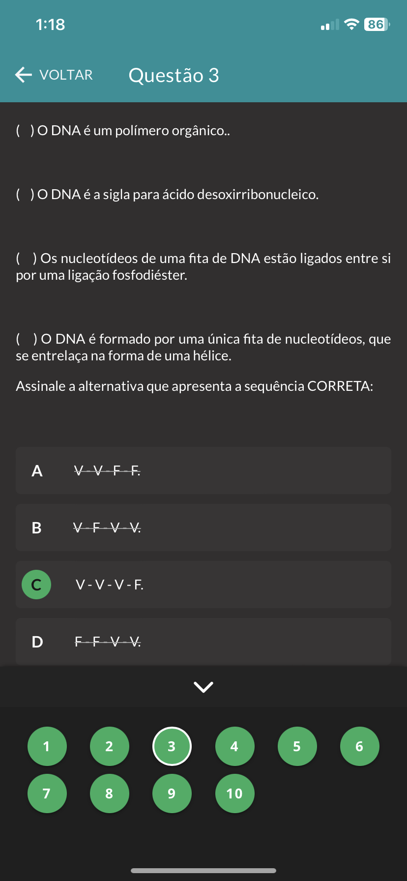 Sobre o DNA, analise as seguintes afirmacoes e julgue os itens colocando V para VERDADEIRO e F para FALSO. ( ) O DNA é um polímero orgânico. ( ) O DNA é a sigla para ácido. ( ) Os nucleotídeos de uma fita de DNA estão ligados entre si por uma ligação fosfodiéster. ( ) O DNA é formado por uma única fita de nucleotídeos, que se entrelaça na forma de uma hélice. A - F, C, V, V. D - 1, 2, 3, 4.