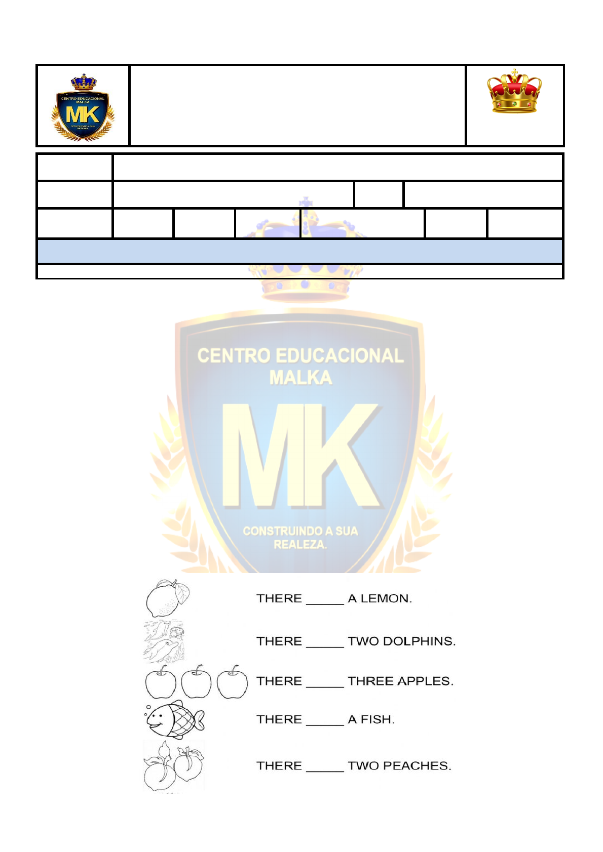 CENTRO EDUCACIONAL MALKA AVALIAÇÃO BIMESTRAL – 1° ETAPA 5° ANO CONSTRUINDO A SUA REALEZA ALUNO DISCIPLINA DATA _______/________/________ TOTAL DE ESC ESC OBTIDOS ENSINO FUNDAMENTAL NOTA 1) Relacione os países a suas nacionalidades. Escreva as nacionalidades, em inglês, corretamente: BRAZIL ___________________________ PORTUGAL _______________________ ITALY _________________________ CANADA ______________________ JAPAN _________________________ 2) Use o ARE ou IS. Lembre-se que There are - plural e There is - singular 3) Escreva por extenso o nome dos números abaixo em inglês: a) 100 ______________________________________ b) 400 ______________________________________ c) 900 ______________________________________ d) 600 ______________________________________ 4) Complete corretamente sobre a nacionalidade, responda em Inglês: Eu nasci no BRAZIL, então eu sou ____________________ Minha amiga nasceu no JAPAN, ela é ___________________