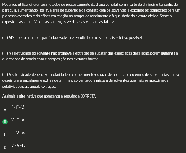 Podemos utilizar diferentes métodos de processamento da droga vegetal, com intuito de diminuir tamanho de aumentando, assim, a área de superfície de contato com os solventes e expondo compostos para um processo extrativo mais eficaz em relação ao tempo, ao rendimento e à qualidade do extrato obtido. Sobre exposto, classifique V para as sentenças verdadeiras e F para as falsas: ( ) Além do tamanho de solvente escolhido deve ser mais seletivo possível. ( ) A seletividade do solvente não promove a extração de substâncias específicas desejadas, porém aumenta a quantidade do rendimento e composição nos extratos. ( ) A seletividade depende da polaridade, conhecimento do grau de polaridade do grupo de substâncias que se deseja preferencialmente extrair determina solvente ou a mistura de solventes que mais se aproxima da seletividade para aquela extração. F F - V. A V - F - V. B F V - V. V-V-F - D